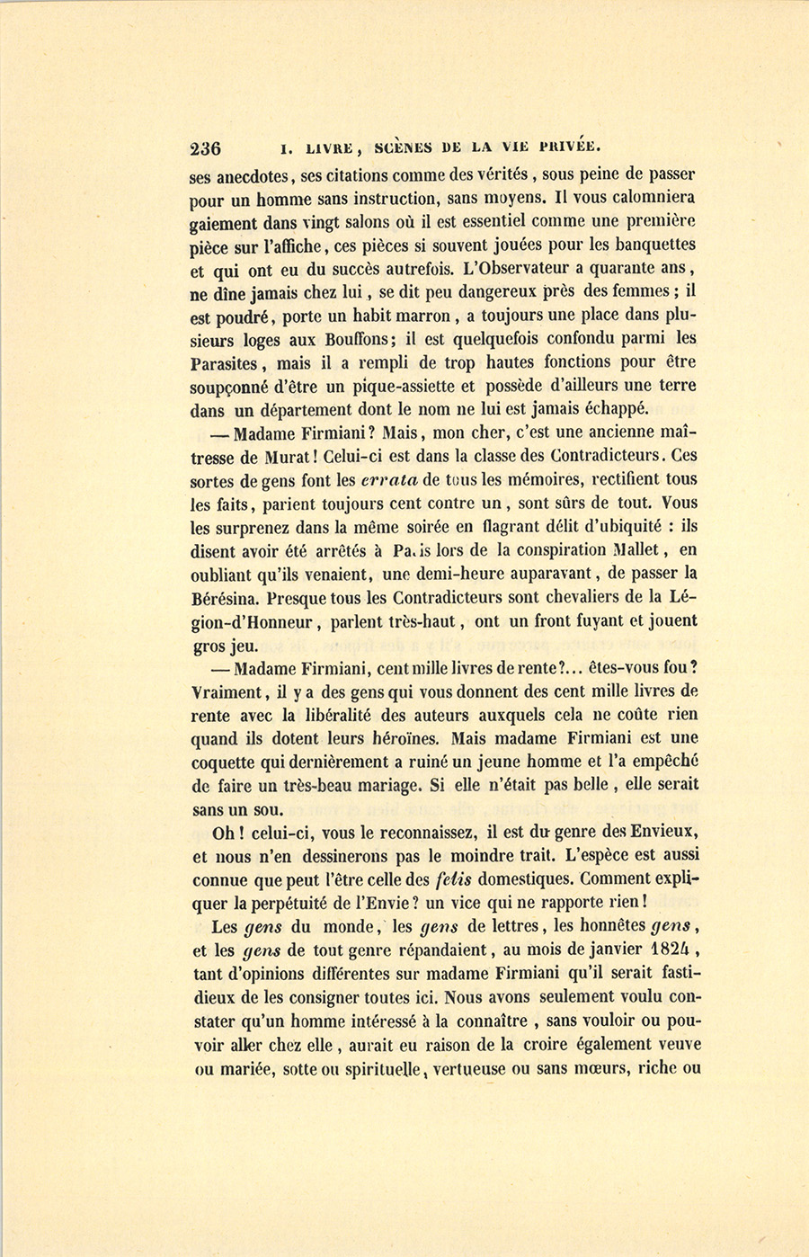 – Madame Firmiani ? Mais, mon cher, c’est une ancienne maîtresse de Murat ! Celui-ci est dans la classe des Contradicteurs. Ces sortes de gens font les errata de tous les mémoires, rectifient tous les faits, parient toujours cent contre un, sont sûrs de tout. Vous les surprenez dans la même soirée en flagrant délit d’ubiquité : ils disent avoir été arrêtés à Paris lors de la conspiration Mallet, en oubliant qu’ils venaient, une demi-heure auparavant, de passer la Bérésina. Presque tous les Contradicteurs sont chevaliers de la Légion-d’Honneur, parlent très-haut, ont un front fuyant et jouent gros jeu.