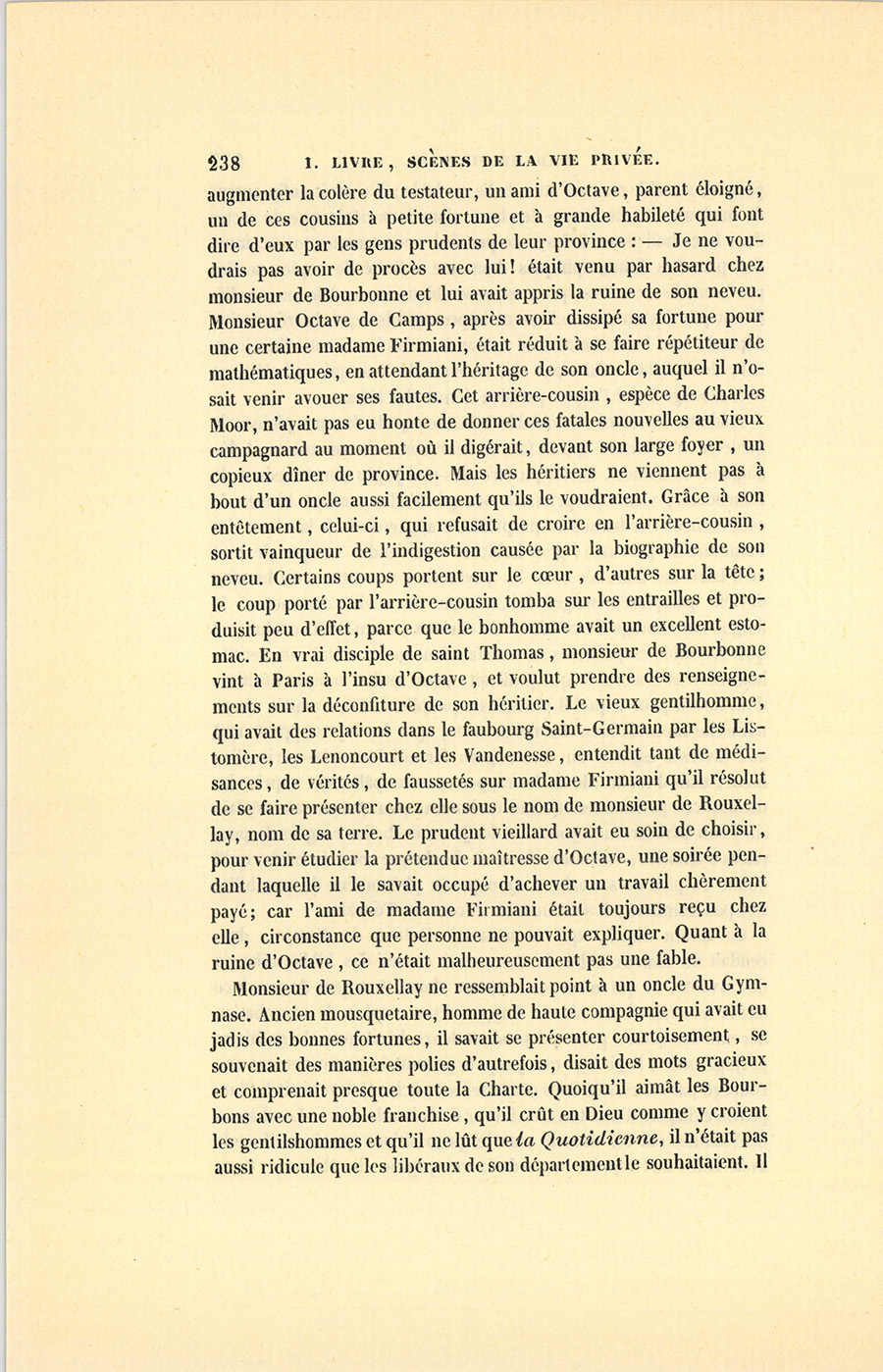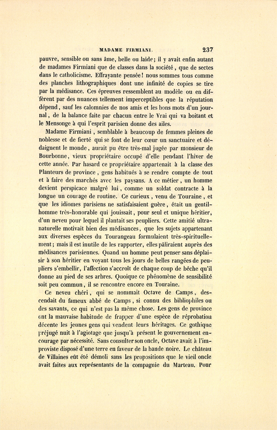 Ce neveu chéri, qui se nommait Octave de Camps, descendait du fameux abbé de Camps, si connu des bibliophiles ou des savants, ce qui n’est pas la même chose. Les gens de province ont la mauvaise habitude de frapper d’une espèce de réprobation décente les jeunes gens qui vendent leurs héritages. Ce gothique préjugé nuit à l’agiotage que jusqu’à présent le gouvernement encourage par nécessité. Sans consulter son oncle, Octave avait à l’improviste disposé d’une terre en faveur de la bande noire. Le château de Villaines eût été démoli sans les propositions que le vieil oncle avait faites aux représentants de la compagnie du Marteau. Pour {p. 238} augmenter la colère du testateur, un ami d’Octave, parent éloigné, un de ces cousins à petite fortune et à grande habileté qui font dire d’eux par les gens prudents de leur province : – Je ne voudrais pas avoir de procès avec lui ! était venu par hasard chez monsieur de Bourbonne et lui avait appris la ruine de son neveu. Monsieur Octave de Camps, après avoir dissipé sa fortune pour une certaine madame Firmiani, était réduit à se faire répétiteur de mathématiques, en attendant l’héritage de son oncle, auquel il n’osait venir avouer ses fautes. Cet arrière-cousin, espèce de Charles Moor, n’avait pas eu honte de donner ces fatales nouvelles au vieux campagnard au moment où il digérait, devant son large foyer, un copieux dîner de province. Mais les héritiers ne viennent pas à bout d’un oncle aussi facilement qu’ils le voudraient. Grâce à son entêtement, celui-ci, qui refusait de croire en l’arrière-cousin, sortit vainqueur de l’indigestion causée par la biographie de son neveu. Certains coups portent sur le cœur, d’autres sur la tête ; le coup porté par l’arrière-cousin tomba sur les entrailles et produisit peu d’effet, parce que le bonhomme avait un excellent estomac. En vrai disciple de saint Thomas, monsieur de Bourbonne vint à Paris à l’insu d’Octave, et voulut prendre des renseignements sur la déconfiture de son héritier. Le vieux gentilhomme, qui avait des relations dans le faubourg Saint-Germain par les Listomère, les Lenoncourt et les Vandenesse, entendit tant de médisances, de vérités, de faussetés sur madame Firmiani qu’il résolut de se faire présenter chez elle sous le nom de monsieur de Rouxellay, nom de sa terre. Le prudent vieillard avait eu soin de choisir, pour venir étudier la prétendue maîtresse d’Octave, une soirée pendant laquelle il le savait occupé d’achever un travail chèrement payé ; car l’ami de madame Firmiani était toujours reçu chez elle, circonstance que personne ne pouvait expliquer. Quant à la ruine d’Octave, ce n’était malheureusement pas une fable.
