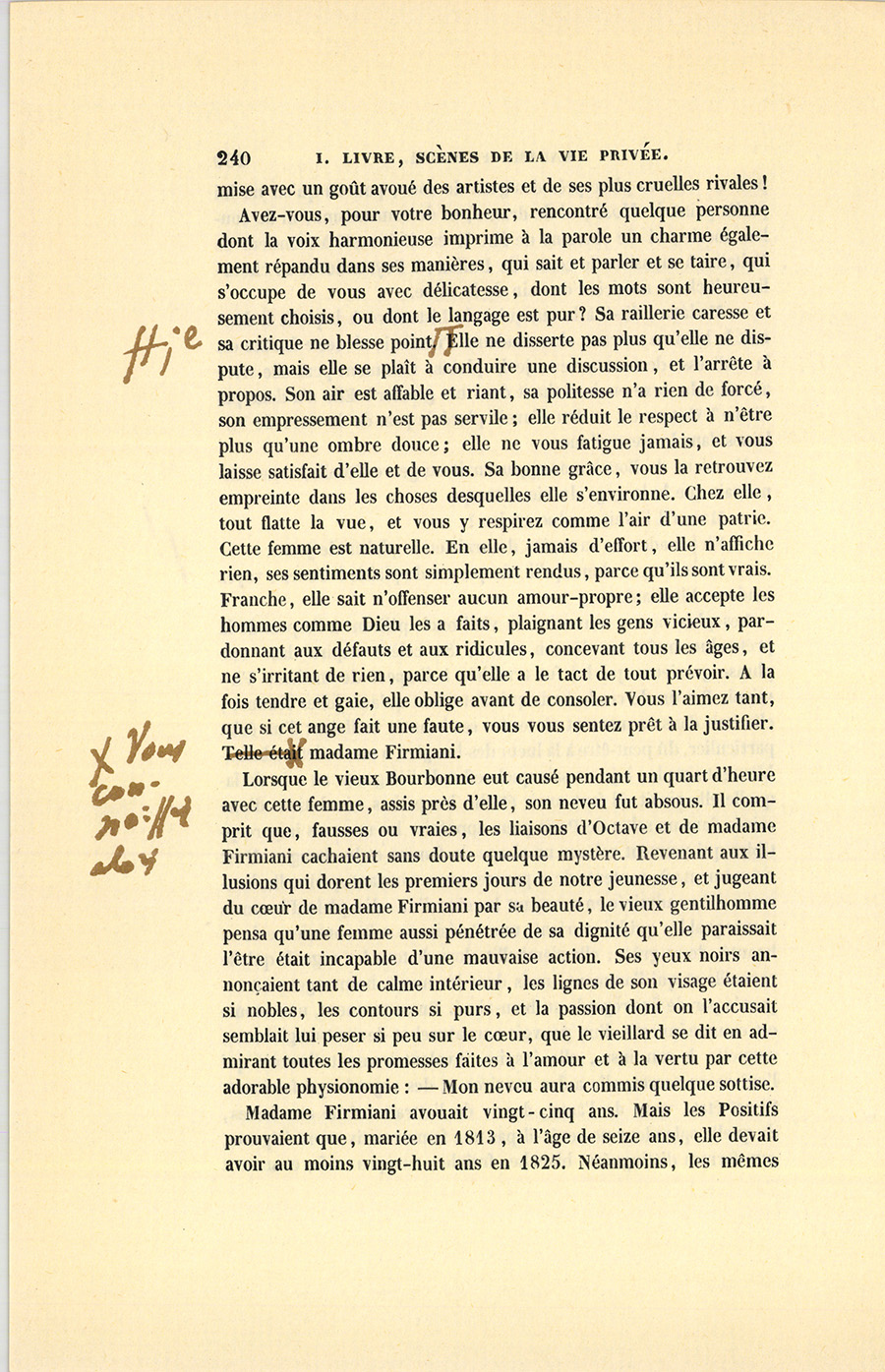 Avez-vous, pour votre bonheur, rencontré quelque personne dont la voix harmonieuse imprime à la parole un charme également répandu dans ses manières, qui sait et parler et se taire, qui s’occupe de vous avec délicatesse, dont les mots sont heureusement choisis, ou dont le langage est pur ? Sa raillerie caresse et sa critique ne blesse point ; elle ne disserte pas plus qu’elle ne dispute, mais elle se plaît à conduire une discussion, et l’arrête à propos. Son air est affable et riant, sa politesse n’a rien de forcé, son empressement n’est pas servile ; elle réduit le respect à n’être plus qu’une ombre douce ; elle ne vous fatigue jamais, et vous laisse satisfait d’elle et de vous. Sa bonne grâce, vous la retrouvez empreinte dans les choses desquelles elle s’environne. Chez elle, tout flatte la vue, et vous y respirez comme l’air d’une patrie. Cette femme est naturelle. En elle, jamais d’effort, elle n’affiche rien, ses sentiments sont simplement rendus, parce qu’ils sont vrais. Franche, elle sait n’offenser aucun amour-propre ; elle accepte les hommes comme Dieu les a faits, plaignant les gens vicieux, pardonnant aux défauts et aux ridicules, concevant tous les âges, et ne s’irritant de rien, parce qu’elle a le tact de tout prévoir. À la fois tendre et gaie, elle oblige avant de consoler. Vous l’aimez tant, que si cet ange fait une faute, vous vous sentez prêt à la justifier. Vous connaissez alors madame Firmiani.