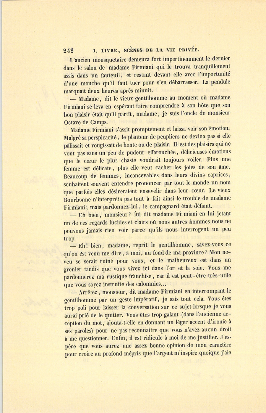{p. 242} L’ancien mousquetaire demeura fort impertinemment le dernier dans le salon de madame Firmiani qui le trouva tranquillement assis dans un fauteuil, et restant devant elle avec l’importunité d’une mouche qu’il faut tuer pour s’en débarrasser. La pendule marquait deux heures après minuit.