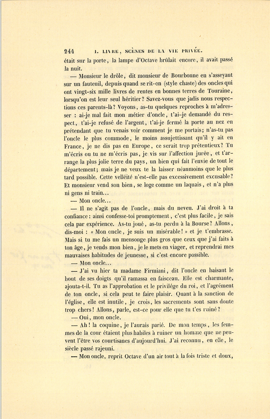 – Monsieur le drôle, dit monsieur de Bourbonne en s’asseyant sur un fauteuil, depuis quand se rit-on (style chaste) des oncles qui ont vingt-six mille livres de rentes en bonnes terres de Touraine, lorsqu’on est leur seul héritier ? Savez-vous que jadis nous respections ces parents-là ? Voyons, as-tu quelques reproches à m’adresser : ai-je mal fait mon métier d’oncle, t’ai-je demandé du respect, t’ai-je refusé de l’argent, t’ai-je fermé la porte au nez en prétendant que tu venais voir comment je me portais ; n’as-tu pas l’oncle le plus commode, le moins assujettissant qu’il y ait en France, je ne dis pas en Europe, ce serait trop prétentieux ? Tu m’écris ou tu ne m’écris pas, je vis sur l’affection jurée, et t’arrange la plus jolie terre du pays, un bien qui fait l’envie de tout le département ; mais je ne veux te la laisser néanmoins que le plus tard possible. Cette velléité n’est-elle pas excessivement excusable ? Et monsieur vend son bien, se loge comme un laquais, et n’a plus ni gens ni train…
