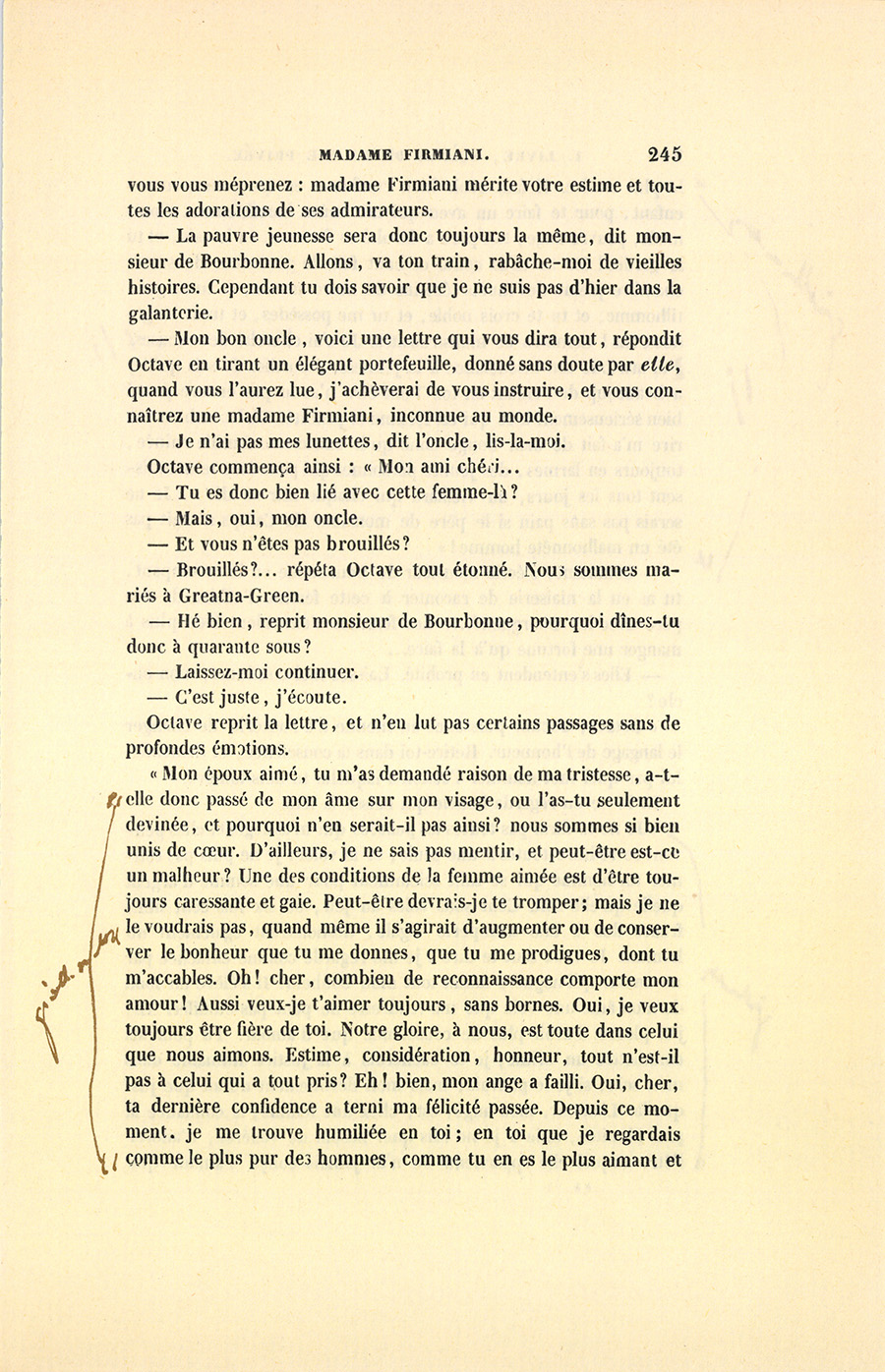 – Mon oncle, reprit Octave d’un air tout à la fois triste et doux, {p. 245} vous vous méprenez : madame Firmiani mérite votre estime et toutes les adorations de ses admirateurs.