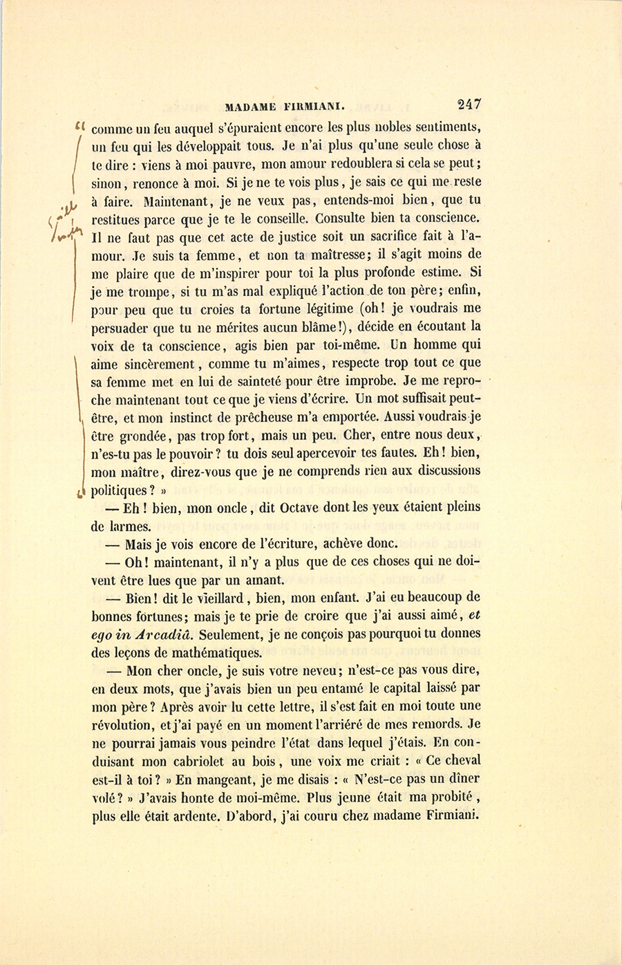 – Bien ! dit le vieillard, bien, mon enfant. J’ai eu beaucoup de bonnes fortunes ; mais je te prie de croire que j’ai aussi aimé, et ego in Arcadiâ. Seulement, je ne conçois pas pourquoi tu donnes des leçons de mathématiques.