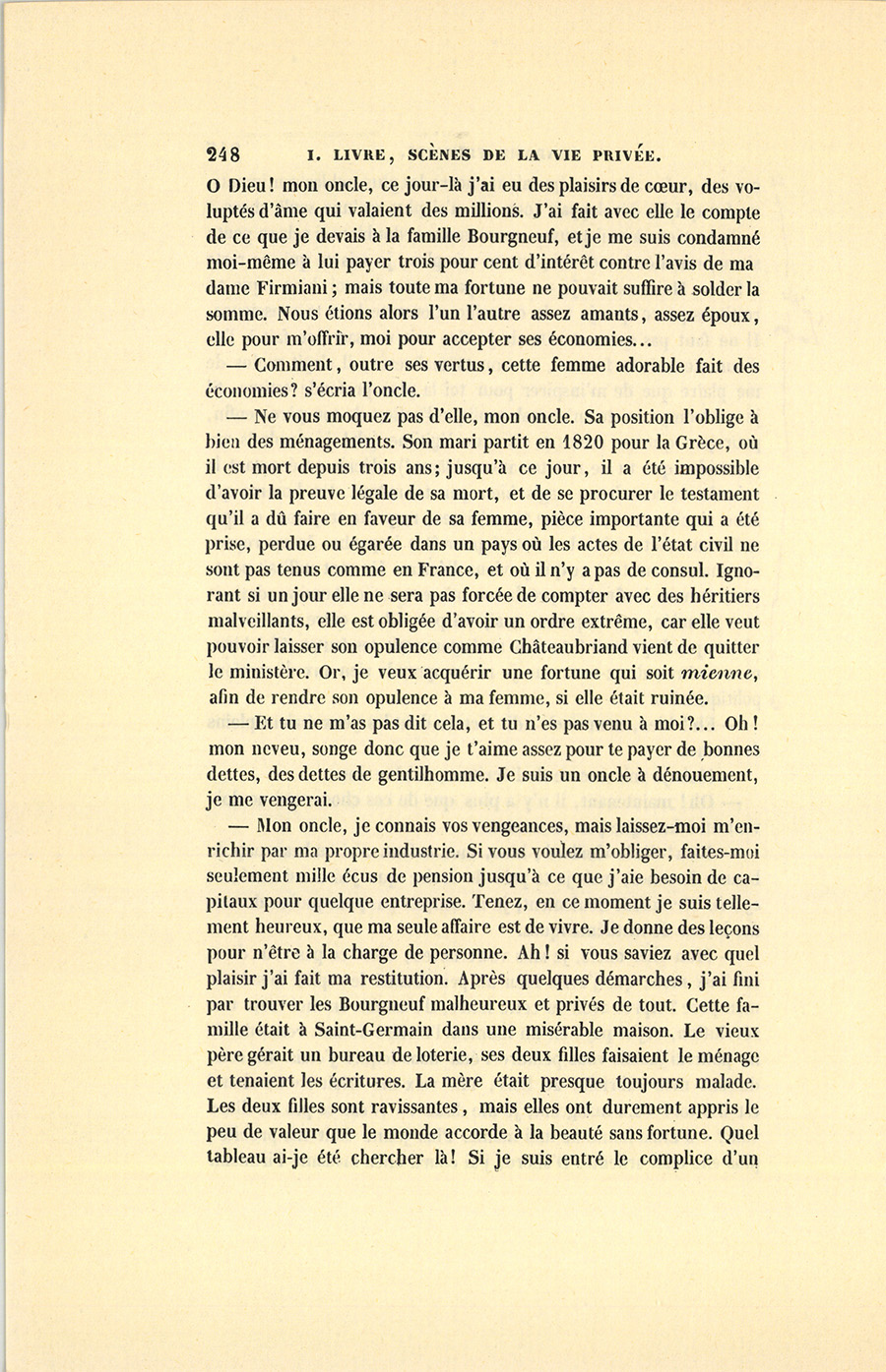 – Mon cher oncle, je suis votre neveu ; n’est-ce pas vous dire, en deux mots, que j’avais bien un peu entamé le capital laissé par mon père ? Après avoir lu cette lettre, il s’est fait en moi toute une révolution, et j’ai payé en un moment l’arriéré de mes remords. Je ne pourrai jamais vous peindre l’état dans lequel j’étais. En conduisant mon cabriolet au bois, une voix me criait : « Ce cheval est-il à toi ? » En mangeant, je me disais : « N’est-ce pas un dîner volé ? » J’avais honte de moi-même. Plus jeune était ma probité, plus elle était ardente. D’abord, j’ai couru chez madame Firmiani. {p. 248} Ô Dieu ! mon oncle, ce jour-là j’ai eu des plaisirs de cœur, des voluptés d’âme qui valaient des millions. J’ai fait avec elle le compte de ce que je devais à la famille Bourgneuf, et je me suis condamné moi-même à lui payer trois pour cent d’intérêt contre l’avis de madame Firmiani ; mais toute ma fortune ne pouvait suffire à solder la somme. Nous étions alors l’un l’autre assez amants, assez époux, elle pour m’offrir, moi pour accepter ses économies…