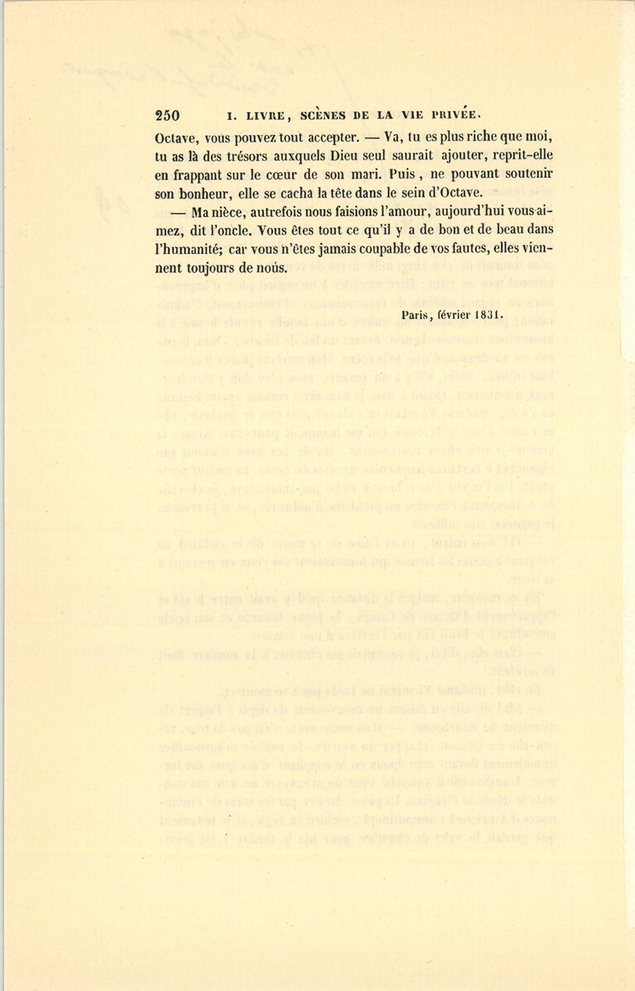 – Ma nièce, autrefois nous faisions l’amour, aujourd’hui vous aimez, dit l’oncle. Vous êtes tout ce qu’il y a de bon et de beau dans l’humanité ; car vous n’êtes jamais coupable de vos fautes, elles viennent toujours de nous.