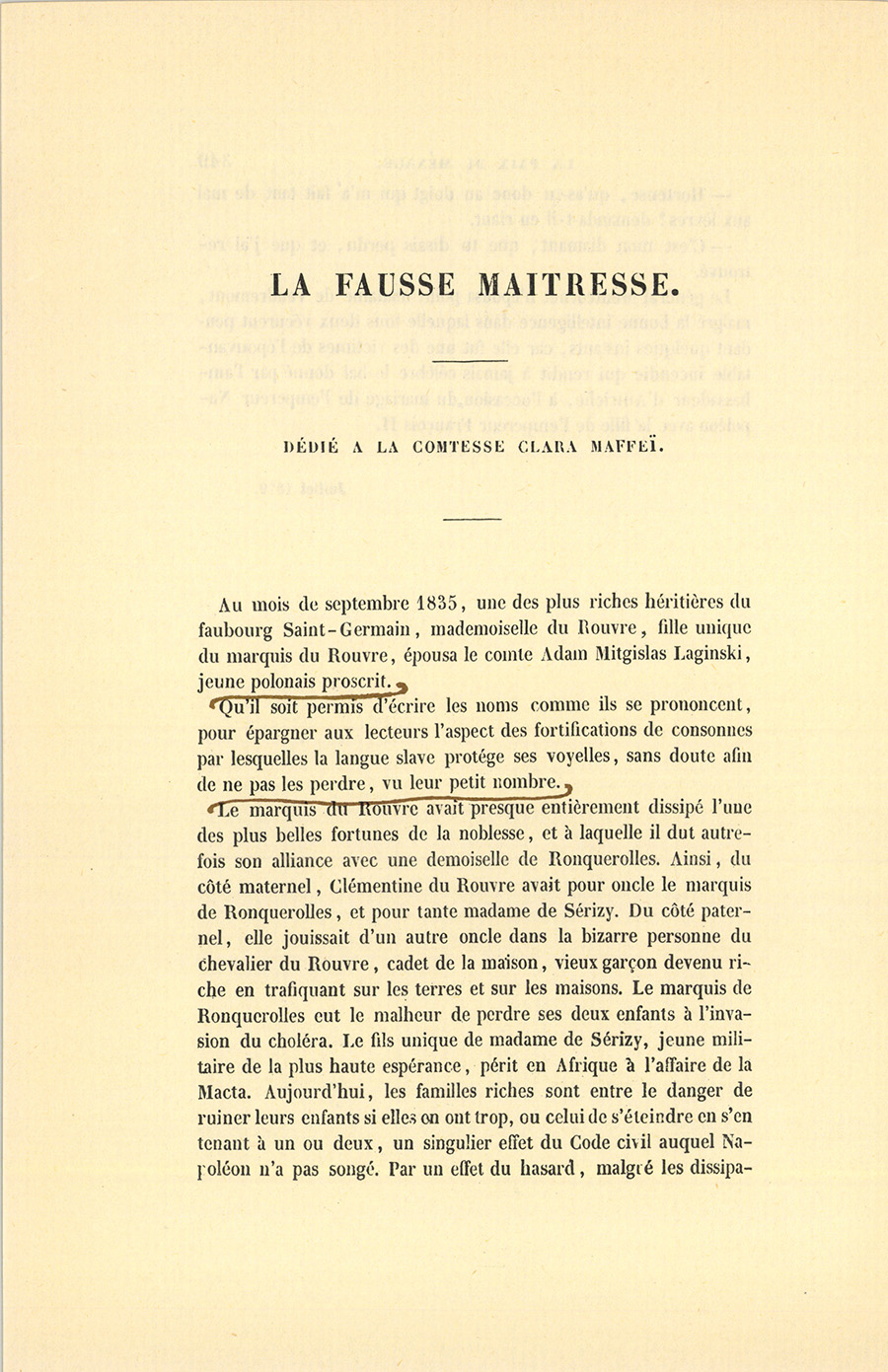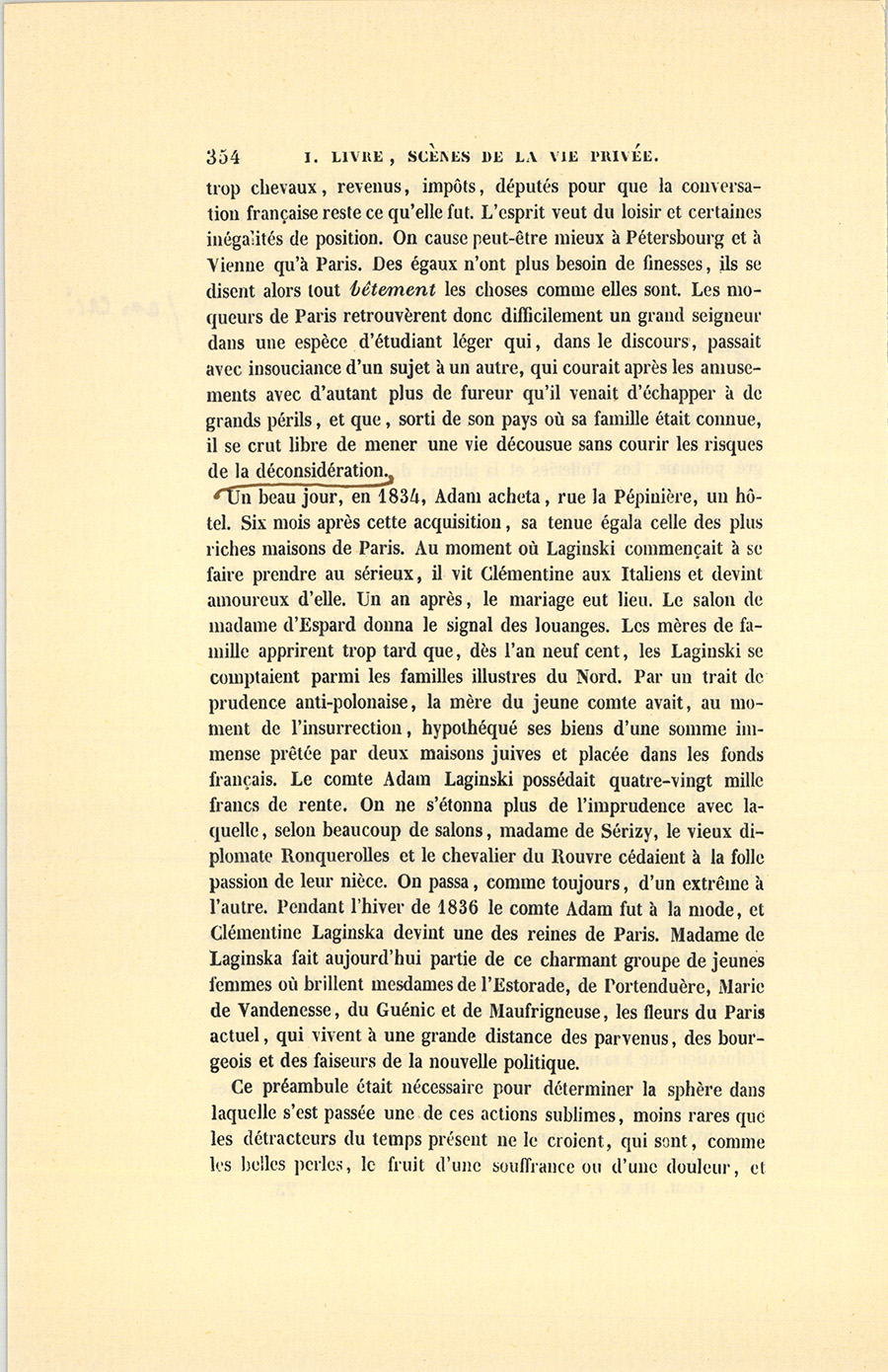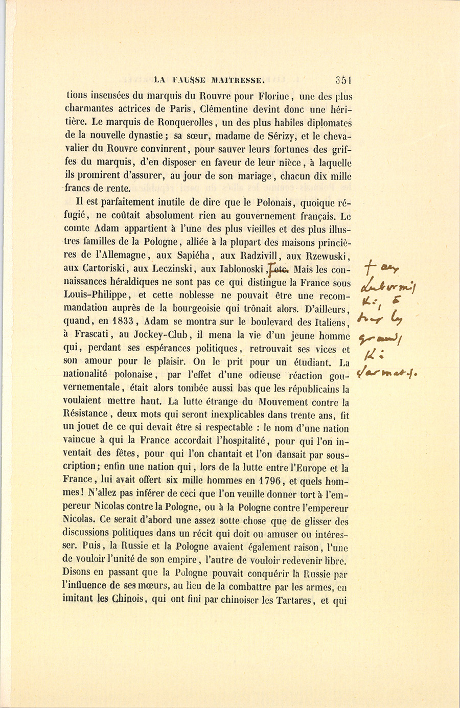 Au mois de septembre 1835, une des plus riches héritières du faubourg Saint-Germain, mademoiselle du Rouvre, fille unique du marquis du Rouvre, épousa le comte Adam Mitgislas Laginski, jeune polonais proscrit. Qu’il soit permis d’écrire les noms comme ils se prononcent, pour épargner aux lecteurs l’aspect des fortifications de consonnes par lesquelles la langue slave protége ses voyelles, sans doute afin de ne pas les perdre, vu leur petit nombre. Le marquis du Rouvre avait presque entièrement dissipé l’une des plus belles fortunes de la noblesse, et à laquelle il dut autrefois son alliance avec une demoiselle de Ronquerolles. Ainsi, du côté maternel, Clémentine du Rouvre avait pour oncle le marquis de Ronquerolles, et pour tante madame de Sérizy. Du côté paternel, elle jouissait d’un autre oncle dans la bizarre personne du chevalier du Rouvre, cadet de la maison, vieux garçon devenu riche en trafiquant sur les terres et sur les maisons. Le marquis de Ronquerolles eut le malheur de perdre ses deux enfants à l’invasion du choléra. Le fils unique de madame de Sérizy, jeune militaire de la plus haute espérance, périt en Afrique à l’affaire de la Macta. Aujourd’hui, les familles riches sont entre le danger de ruiner leurs enfants si elles en ont trop, ou celui de s’éteindre en s’en tenant à un ou deux, un singulier effet du Code civil auquel Napoléon n’a pas songé. Par un effet du hasard, malgré les {p. 351} dissipations insensées du marquis du Rouvre pour Florine, une des plus charmantes actrices de Paris, Clémentine devint donc une héritière. Le marquis de Ronquerolles, un des plus habiles diplomates de la nouvelle dynastie ; sa sœur, madame de Sérizy, et le chevalier du Rouvre convinrent, pour sauver leurs fortunes des griffes du marquis, d’en disposer en faveur de leur nièce, à laquelle ils promirent d’assurer, au jour de son mariage, chacun dix mille francs de rente.