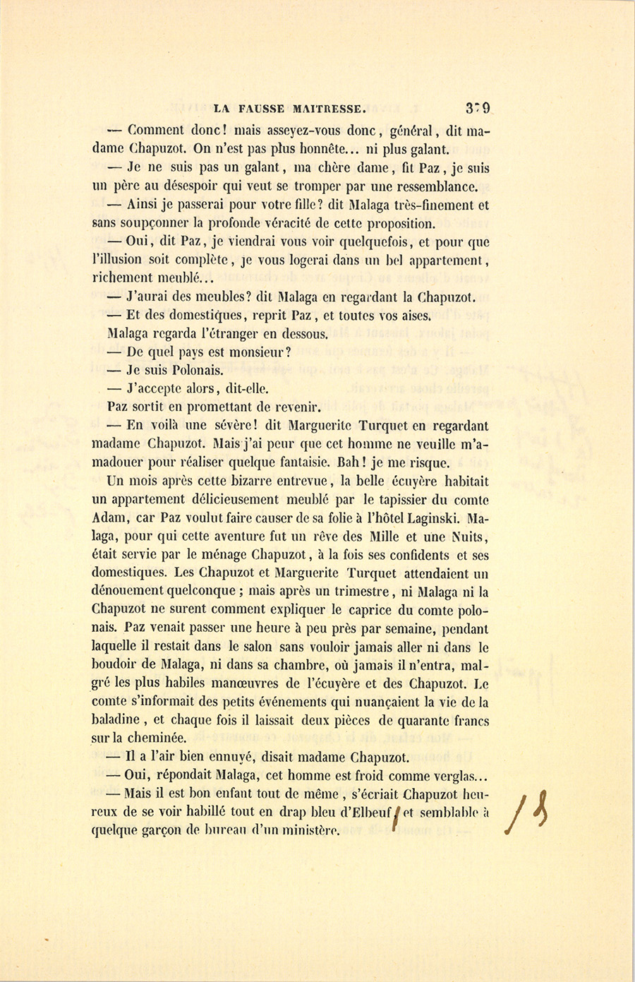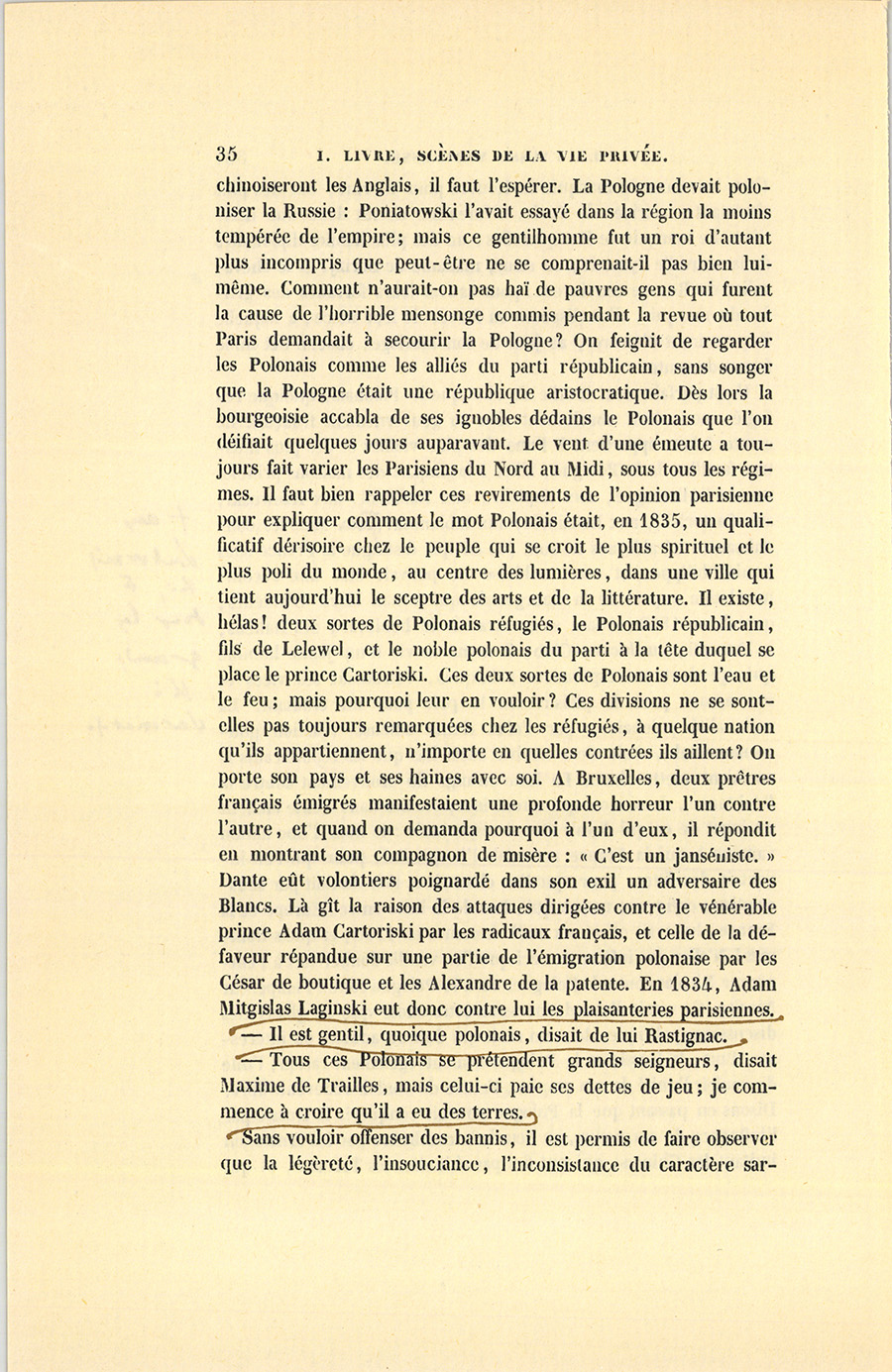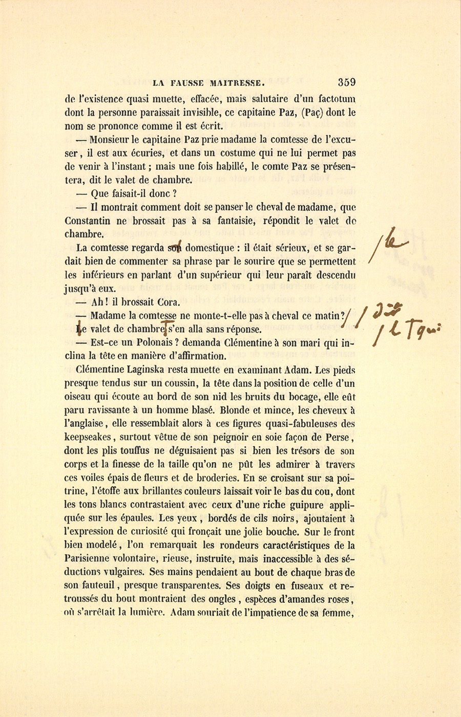 Au mois de septembre 1835, une des plus riches héritières du faubourg Saint-Germain, mademoiselle du Rouvre, fille unique du marquis du Rouvre, épousa le comte Adam Mitgislas Laginski, jeune polonais proscrit. Qu’il soit permis d’écrire les noms comme ils se prononcent, pour épargner aux lecteurs l’aspect des fortifications de consonnes par lesquelles la langue slave protége ses voyelles, sans doute afin de ne pas les perdre, vu leur petit nombre. Le marquis du Rouvre avait presque entièrement dissipé l’une des plus belles fortunes de la noblesse, et à laquelle il dut autrefois son alliance avec une demoiselle de Ronquerolles. Ainsi, du côté maternel, Clémentine du Rouvre avait pour oncle le marquis de Ronquerolles, et pour tante madame de Sérizy. Du côté paternel, elle jouissait d’un autre oncle dans la bizarre personne du chevalier du Rouvre, cadet de la maison, vieux garçon devenu riche en trafiquant sur les terres et sur les maisons. Le marquis de Ronquerolles eut le malheur de perdre ses deux enfants à l’invasion du choléra. Le fils unique de madame de Sérizy, jeune militaire de la plus haute espérance, périt en Afrique à l’affaire de la Macta. Aujourd’hui, les familles riches sont entre le danger de ruiner leurs enfants si elles en ont trop, ou celui de s’éteindre en s’en tenant à un ou deux, un singulier effet du Code civil auquel Napoléon n’a pas songé. Par un effet du hasard, malgré les {p. 351} dissipations insensées du marquis du Rouvre pour Florine, une des plus charmantes actrices de Paris, Clémentine devint donc une héritière. Le marquis de Ronquerolles, un des plus habiles diplomates de la nouvelle dynastie ; sa sœur, madame de Sérizy, et le chevalier du Rouvre convinrent, pour sauver leurs fortunes des griffes du marquis, d’en disposer en faveur de leur nièce, à laquelle ils promirent d’assurer, au jour de son mariage, chacun dix mille francs de rente.