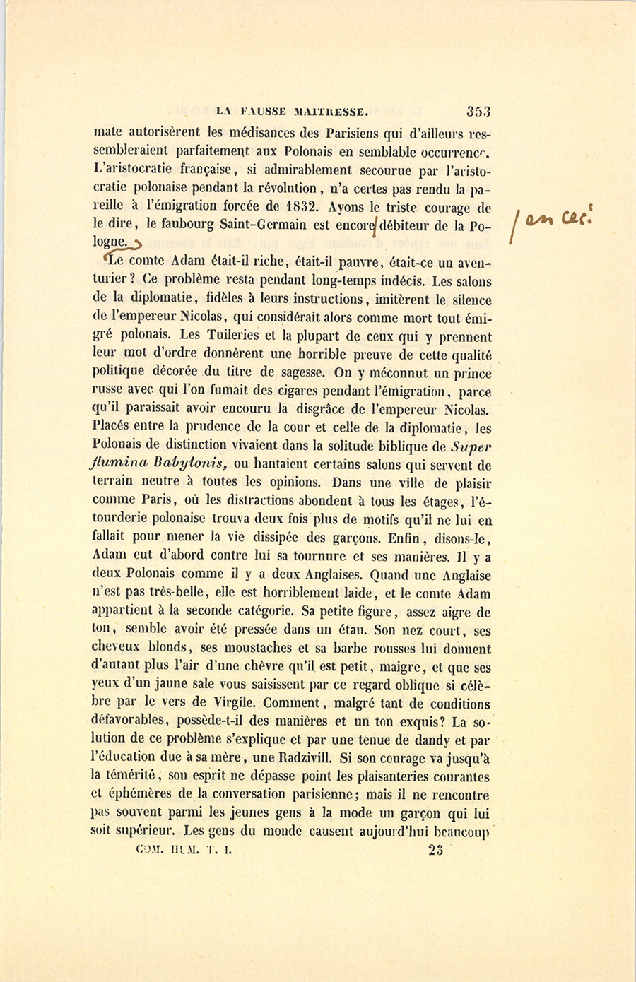 Il est parfaitement inutile de dire que le Polonais, quoique réfugié, ne coûtait absolument rien au gouvernement français. Le comte Adam appartient à l’une des plus vieilles et des plus illustres familles de la Pologne, alliée à la plupart des maisons princières de l’Allemagne, aux Sapiéha, aux Radzivill, aux Rzewuski, aux Cartoriski, aux Leczinski, aux Iablonoski, aux Lubermiski, à tous les grands Ki sarmates. Mais les connaissances héraldiques ne sont pas ce qui distingue la France sous Louis-Philippe, et cette noblesse ne pouvait être une recommandation auprès de la bourgeoisie qui trônait alors. D’ailleurs, quand, en 1833, Adam se montra sur le boulevard des Italiens, à Frascati, au Jockey-Club, il mena la vie d’un jeune homme qui, perdant ses espérances politiques, retrouvait ses vices et son amour pour le plaisir. On le prit pour un étudiant. La nationalité polonaise, par l’effet d’une odieuse réaction gouvernementale, était alors tombée aussi bas que les républicains la voulaient mettre haut. La lutte étrange du Mouvement contre la Résistance, deux mots qui seront inexplicables dans trente ans, fit un jouet de ce qui devait être si respectable : le nom d’une nation vaincue à qui la France accordait l’hospitalité, pour qui l’on inventait des fêtes, pour qui l’on chantait et l’on dansait par souscription ; enfin une nation qui, lors de la lutte entre l’Europe et la France, lui avait offert six mille hommes en 1796, et quels hommes ! N’allez pas inférer de ceci que l’on veuille donner tort à l’empereur Nicolas contre la Pologne, ou à la Pologne contre l’empereur Nicolas. Ce serait d’abord une assez sotte chose que de glisser des discussions politiques dans un récit qui doit ou amuser ou intéresser. Puis, la Russie et la Pologne avaient également raison, l’une de vouloir l’unité de son empire, l’autre de vouloir redevenir libre. Disons en passant que la Pologne pouvait conquérir la Russie par l’influence de ses mœurs, au lieu de la combattre par les armes, en imitant les Chinois, qui ont fini par chinoiser les Tartares, et qui {p. 352} chinoiseront les Anglais, il faut l’espérer. La Pologne devait poloniser la Russie : Poniatowski l’avait essayé dans la région la moins tempérée de l’empire ; mais ce gentilhomme fut un roi d’autant plus incompris que peut-être ne se comprenait-il pas bien lui-même. Comment n’aurait-on pas haï de pauvres gens qui furent la cause de l’horrible mensonge commis pendant la revue où tout Paris demandait à secourir la Pologne ? On feignit de regarder les Polonais comme les alliés du parti républicain, sans songer que la Pologne était une république aristocratique. Dès lors la bourgeoisie accabla de ses ignobles dédains le Polonais que l’on déifiait quelques jours auparavant. Le vent d’une émeute a toujours fait varier les Parisiens du Nord au Midi, sous tous les régimes. Il faut bien rappeler ces revirements de l’opinion parisienne pour expliquer comment le mot Polonais était, en 1835, un qualificatif dérisoire chez le peuple qui se croit le plus spirituel et le plus poli du monde, au centre des lumières, dans une ville qui tient aujourd’hui le sceptre des arts et de la littérature. Il existe, hélas ! deux sortes de Polonais réfugiés, le Polonais républicain, fils de Lelewel, et le noble polonais du parti à la tête duquel se place le prince Cartoriski. Ces deux sortes de Polonais sont l’eau et le feu ; mais pourquoi leur en vouloir ? Ces divisions ne se sont-elles pas toujours remarquées chez les réfugiés, à quelque nation qu’ils appartiennent, n’importe en quelles contrées ils aillent ? On porte son pays et ses haines avec soi. À Bruxelles, deux prêtres français émigrés manifestaient une profonde horreur l’un contre l’autre, et quand on demanda pourquoi à l’un d’eux, il répondit en montrant son compagnon de misère : « C’est un janséniste. » Dante eût volontiers poignardé dans son exil un adversaire des Blancs. Là gît la raison des attaques dirigées contre le vénérable prince Adam Cartoriski par les radicaux français, et celle de la défaveur répandue sur une partie de l’émigration polonaise par les César de boutique et les Alexandre de la patente. En 1834, Adam Mitgislas Laginski eut donc contre lui les plaisanteries parisiennes. – Il est gentil, quoique polonais, disait de lui Rastignac. – Tous ces Polonais se prétendent grands seigneurs, disait Maxime de Trailles, mais celui-ci paie ses dettes de jeu ; je commence à croire qu’il a eu des terres. Sans vouloir offenser des bannis, il est permis de faire observer que la légèreté, l’insouciance, l’inconsistance du caractère {p. 353} sarmate autorisèrent les médisances des Parisiens qui d’ailleurs ressembleraient parfaitement aux Polonais en semblable occurrence. L’aristocratie française, si admirablement secourue par l’aristocratie polonaise pendant la révolution, n’a certes pas rendu la pareille à l’émigration forcée de 1832. Ayons le triste courage de le dire, le faubourg Saint-Germain est encore en ceci débiteur de la Pologne. Le comte Adam était-il riche, était-il pauvre, était-ce un aventurier ? Ce problème resta pendant long-temps indécis. Les salons de la diplomatie, fidèles à leurs instructions, imitèrent le silence de l’empereur Nicolas, qui considérait alors comme mort tout émigré polonais. Les Tuileries et la plupart de ceux qui y prennent leur mot d’ordre donnèrent une horrible preuve de cette qualité politique décorée du titre de sagesse. On y méconnut un prince russe avec qui l’on fumait des cigares pendant l’émigration, parce qu’il paraissait avoir encouru la disgrâce de l’empereur Nicolas. Placés entre la prudence de la cour et celle de la diplomatie, les Polonais de distinction vivaient dans la solitude biblique de Super flumina Babylonis, ou hantaient certain