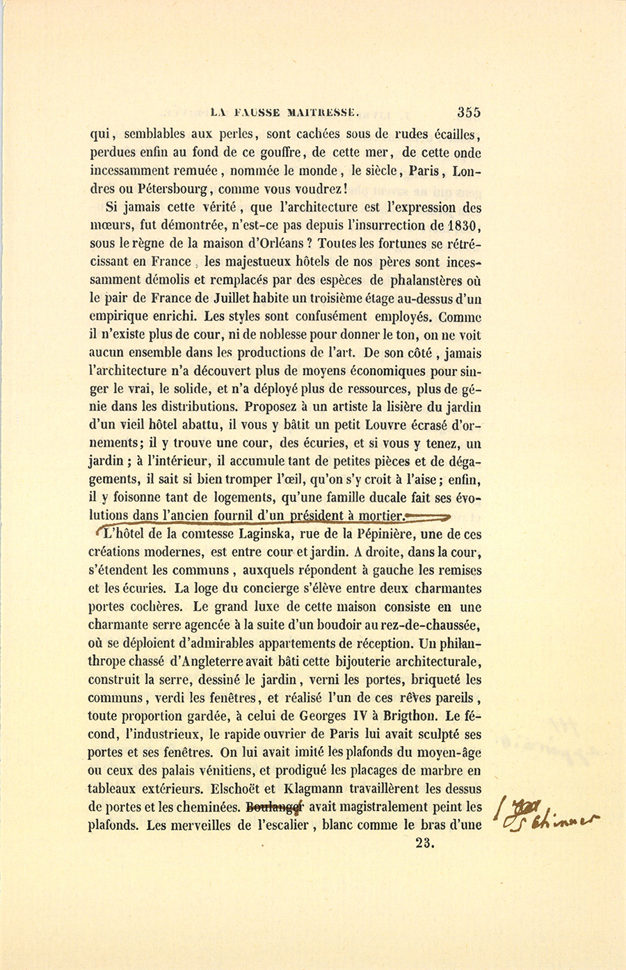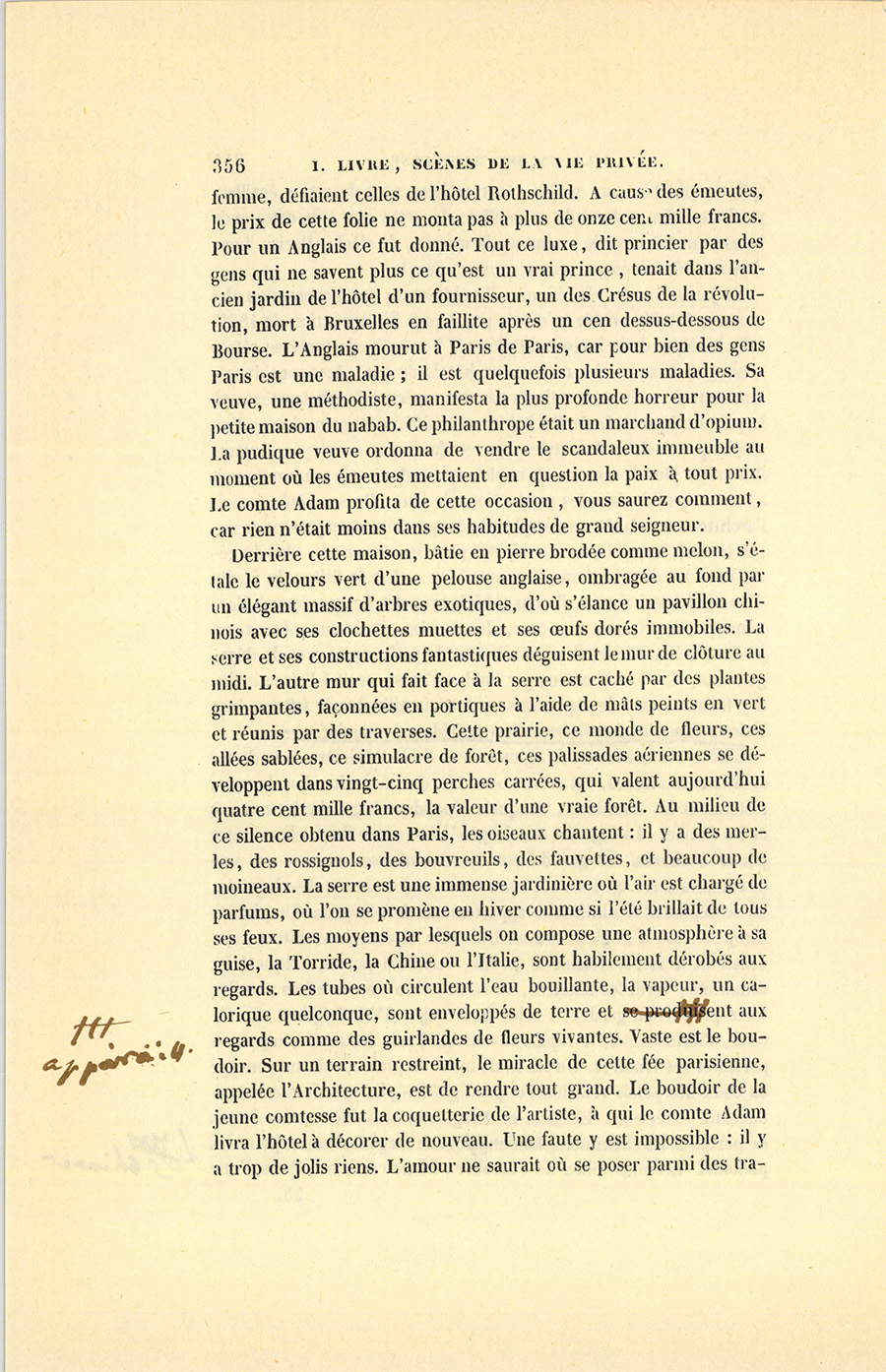 Si jamais cette vérité, que l’architecture est l’expression des mœurs, fut démontrée, n’est-ce pas depuis l’insurrection de 1830, sous le règne de la maison d’Orléans ? Toutes les fortunes se rétrécissant en France, les majestueux hôtels de nos pères sont incessamment démolis et remplacés par des espèces de phalanstères où le pair de France de Juillet habite un troisième étage au-dessus d’un empirique enrichi. Les styles sont confusément employés. Comme il n’existe plus de cour, ni de noblesse pour donner le ton, on ne voit aucun ensemble dans les productions de l’art. De son côté, jamais l’architecture n’a découvert plus de moyens économiques pour singer le vrai, le solide, et n’a déployé plus de ressources, plus de génie dans les distributions. Proposez à un artiste la lisière du jardin d’un vieil hôtel abattu, il vous y bâtit un petit Louvre écrasé d’ornements ; il y trouve une cour, des écuries, et si vous y tenez, un jardin ; à l’intérieur, il accumule tant de petites pièces et de dégagements, il sait si bien tromper l’œil, qu’on s’y croit à l’aise ; enfin, il y foisonne tant de logements, qu’une famille ducale fait ses évolutions dans l’ancien fournil d’un président à mortier. L’hôtel de la comtesse Laginska, rue de la Pépinière, une de ces créations modernes, est entre cour et jardin. À droite, dans la cour, s’étendent les communs, auxquels répondent à gauche les remises et les écuries. La loge du concierge s’élève entre deux charmantes portes cochères. Le grand luxe de cette maison consiste en une charmante serre agencée à la suite d’un boudoir au rez-de-chaussée, où se déploient d’admirables appartements de réception. Un philanthrope chassé d’Angleterre avait bâti cette bijouterie architecturale, construit la serre, dessiné le jardin, verni les portes, briqueté les communs, verdi les fenêtres, et réalisé l’un de ces rêves pareils, toute proportion gardée, à celui de Georges IV à Brighton1. Le fécond, l’industrieux, le rapide ouvrier de Paris lui avait sculpté ses portes et ses fenêtres. On lui avait imité les plafonds du moyen-âge ou ceux des palais vénitiens, et prodigué les placages de marbre en tableaux extérieurs. Elschoët et Klagmann travaillèrent les dessus de portes et les cheminées. Schinner avait magistralement peint les plafonds. Les merveilles de l’escalier, blanc comme le bras d’une {p. 356} femme, défiaient celles de l’hôtel Rothschild. À cause des émeutes, le prix de cette folie ne monta pas à plus de onze cent mille francs. Pour un Anglais ce fut donné. Tout ce luxe, dit princier par des gens qui ne savent plus ce qu’est un vrai prince, tenait dans l’ancien jardin de l’hôtel d’un fournisseur, un des Crésus de la révolution, mort à Bruxelles en faillite après un cen dessus-dessous de Bourse. L’Anglais mourut à Paris de Paris, car pour bien des gens Paris est une maladie ; il est quelquefois plusieurs maladies. Sa veuve, une méthodiste, manifesta la plus profonde horreur pour la petite maison du nabab. Ce philanthrope était un marchand d’opium. La pudique veuve ordonna de vendre le scandaleux immeuble au moment où les émeutes mettaient en question la paix à tout prix. Le comte Adam profita de cette occasion, vous saurez comment, car rien n’était moins dans ses habitudes de grand seigneur.
