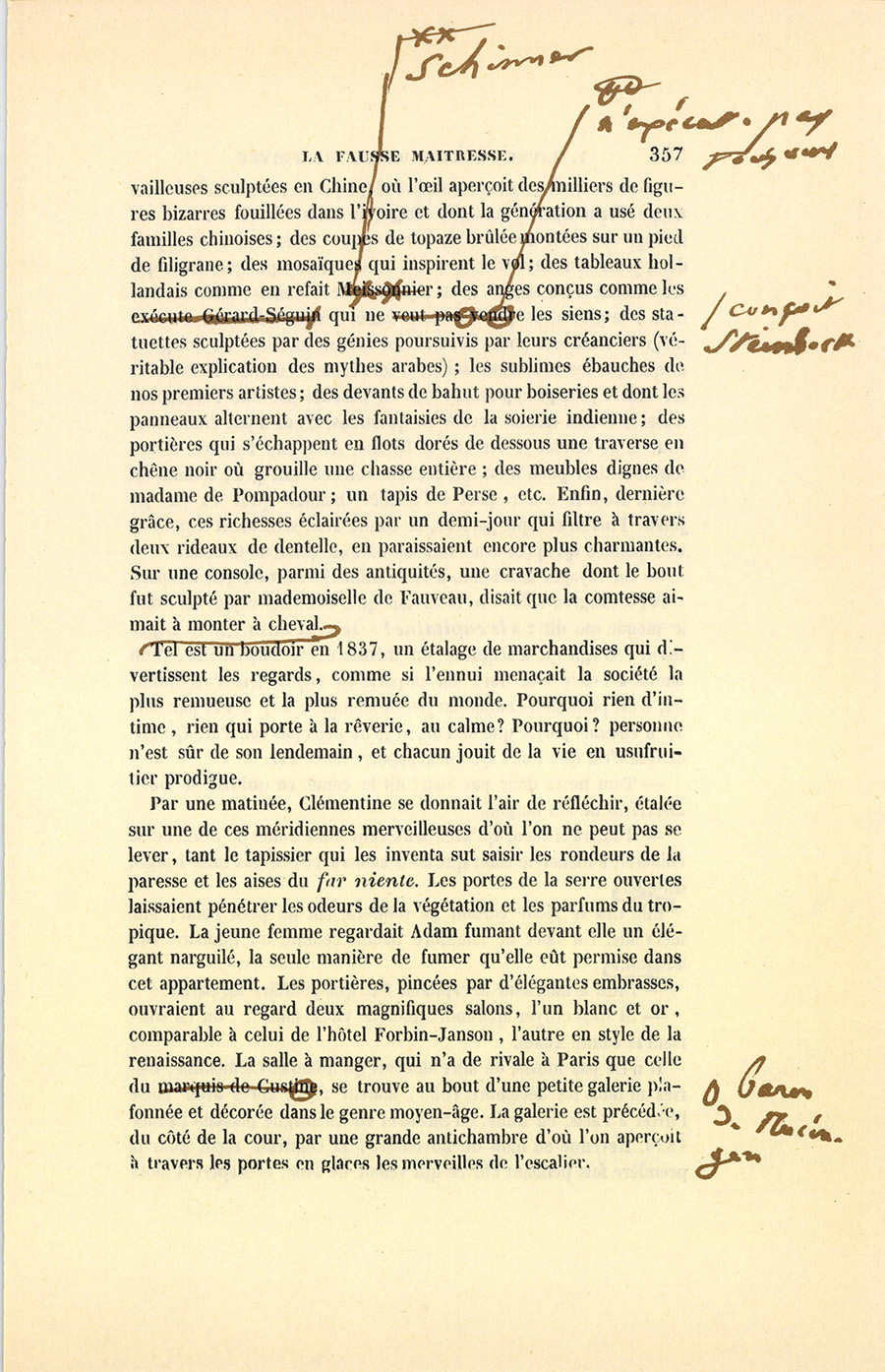 Derrière cette maison, bâtie en pierre brodée comme melon, s’étale le velours vert d’une pelouse anglaise, ombragée au fond par un élégant massif d’arbres exotiques, d’où s’élance un pavillon chinois avec ses clochettes muettes et ses œufs dorés immobiles. La serre et ses constructions fantastiques déguisent le mur de clôture au midi. L’autre mur qui fait face à la serre est caché par des plantes grimpantes, façonnées en portiques à l’aide de mâts peints en vert et réunis par des traverses. Cette prairie, ce monde de fleurs, ces allées sablées, ce simulacre de forêt, ces palissades aériennes se développent dans vingt-cinq perches carrées, qui valent aujourd’hui quatre cent mille francs, la valeur d’une vraie forêt. Au milieu de ce silence obtenu dans Paris, les oiseaux chantent : il y a des merles, des rossignols, des bouvreuils, des fauvettes, et beaucoup de moineaux. La serre est une immense jardinière où l’air est chargé de parfums, où l’on se promène en hiver comme si l’été brillait de tous ses feux. Les moyens par lesquels on compose une atmosphère à sa guise, la Torride, la Chine ou l’Italie, sont habilement dérobés aux regards. Les tubes où circulent l’eau bouillante, la vapeur, un calorique quelconque, sont enveloppés de terre et apparaissent aux regards comme des guirlandes de fleurs vivantes. Vaste est le boudoir. Sur un terrain restreint, le miracle de cette fée parisienne, appelée l’Architecture, est de rendre tout grand. Le boudoir de la jeune comtesse fut la coquetterie de l’artiste, à qui le comte Adam livra l’hôtel à décorer de nouveau. Une faute y est impossible : il y a trop de jolis riens. L’amour ne saurait où se poser parmi des {p. 357} travailleuses sculptées en Chine, où l’œil aperçoit des milliers de figures bizarres fouillées dans l’ivoire et dont la génération a usé deux familles chinoises ; des coupes de topaze brûlée montées sur un pied de filigrane ; des mosaïques qui inspirent le vol ; des tableaux hollandais comme en refait Schinner ; des anges conçus comme les conçoit Steinbock qui n’exécute pas toujours les siens ; des statuettes sculptées par des génies poursuivis par leurs créanciers (véritable explication des mythes arabes) ; les sublimes ébauches de nos premiers artistes ; des devants de bahut pour boiseries et dont les panneaux alternent avec les fantaisies de la soierie indienne ; des portières qui s’échappent en flots dorés de dessous une traverse en chêne noir où grouille une chasse entière ; des meubles dignes de madame de Pompadour ; un tapis de Perse, etc. Enfin, dernière grâce, ces richesses éclairées par un demi-jour qui filtre à travers deux rideaux de dentelle, en paraissaient encore plus charmantes. Sur une console, parmi des antiquités, une cravache dont le bout fut sculpté par mademoiselle de Fauveau, disait que la comtesse aimait à monter à cheval. Tel est un boudoir en 1837, un étalage de marchandises qui divertissent les regards, comme si l’ennui menaçait la société la plus remueuse et la plus remuée du monde. Pourquoi rien d’intime, rien qui porte à la rêverie, au calme ? Pourquoi ? personne n’est sûr de son lendemain, et chacun jouit de la vie en usufruitier prodigue.