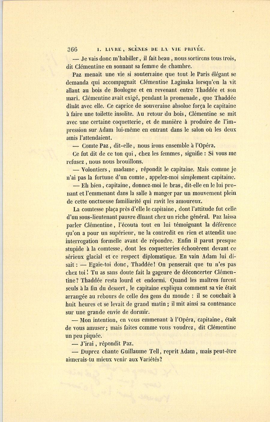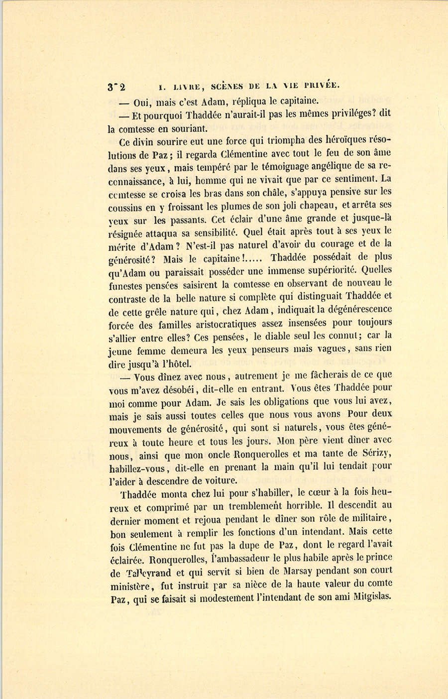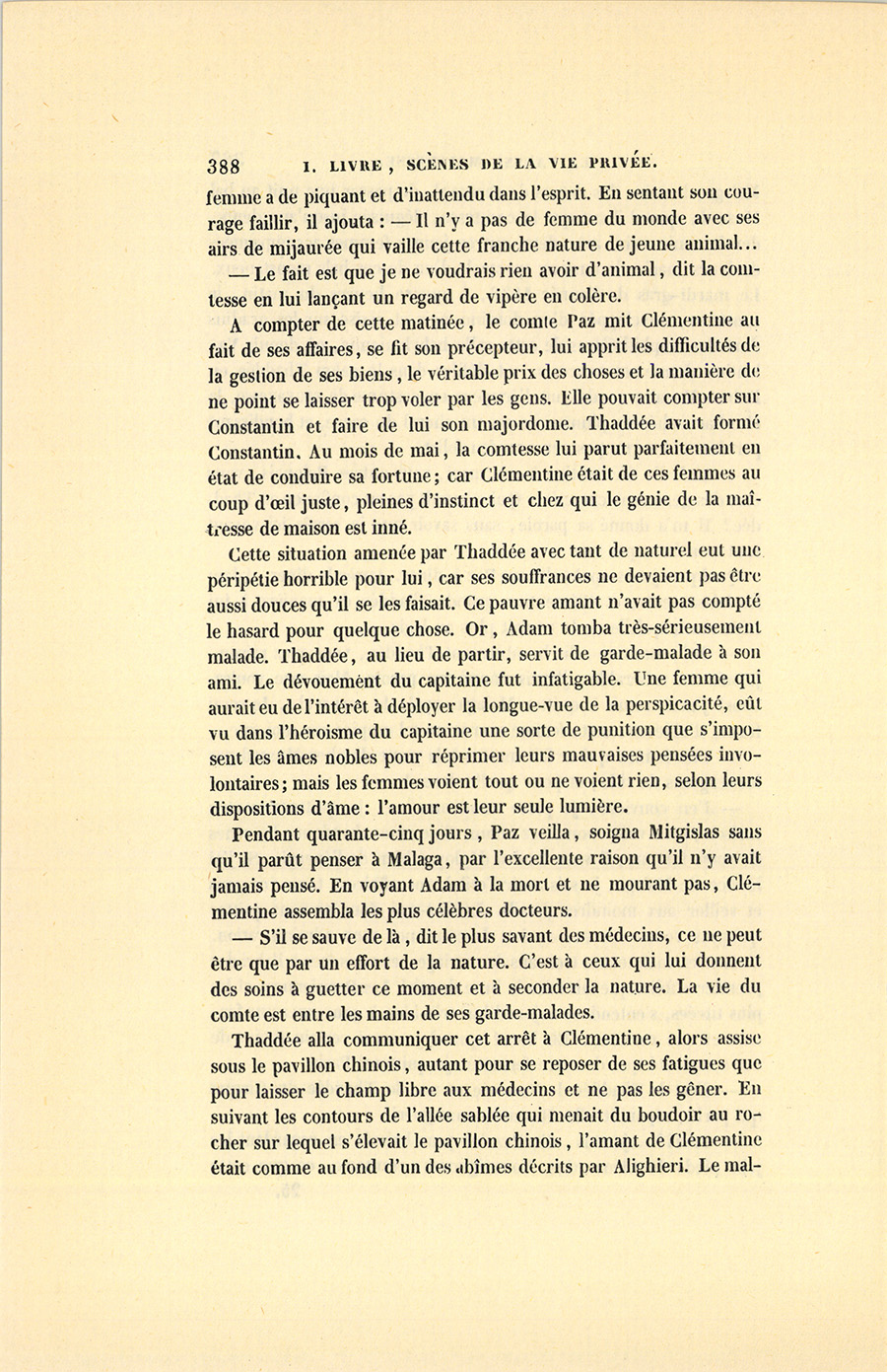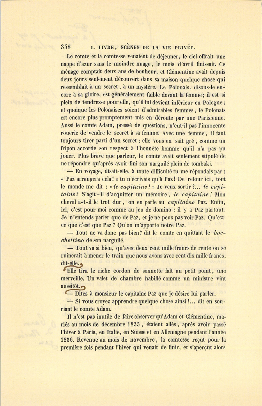 Il n’est pas inutile de faire observer qu’Adam et Clémentine, mariés au mois de décembre 1835, étaient allés, après avoir passé l’hiver à Paris, en Italie, en Suisse et en Allemagne pendant l’année 1836. Revenue au mois de novembre, la comtesse reçut pour la première fois pendant l’hiver qui venait de finir, et s’aperçut alors {p. 359} de l’existence quasi muette, effacée, mais salutaire d’un factotum dont la personne paraissait invisible, ce capitaine Paz, (Paç) dont le nom se prononce comme il est écrit.