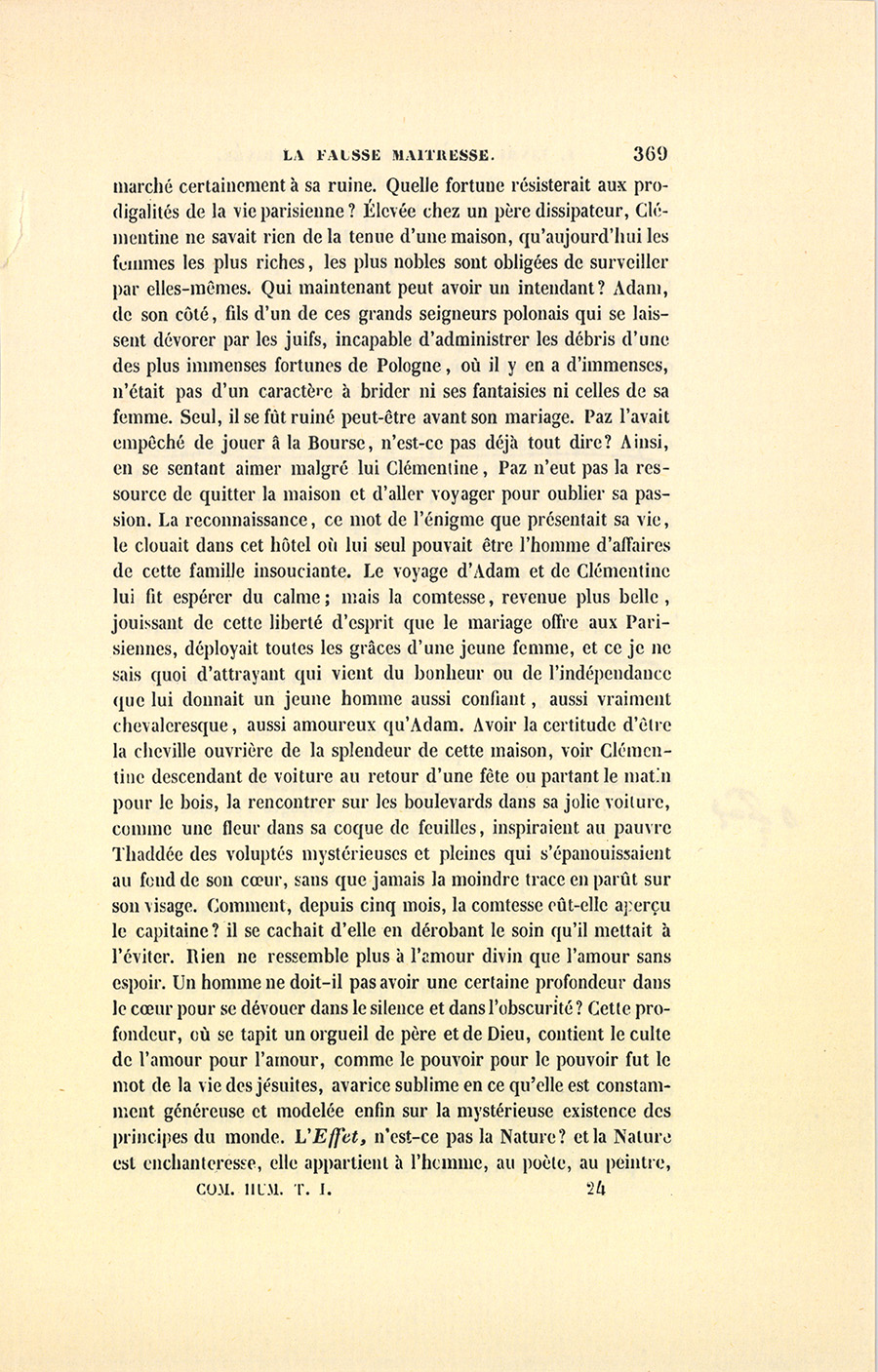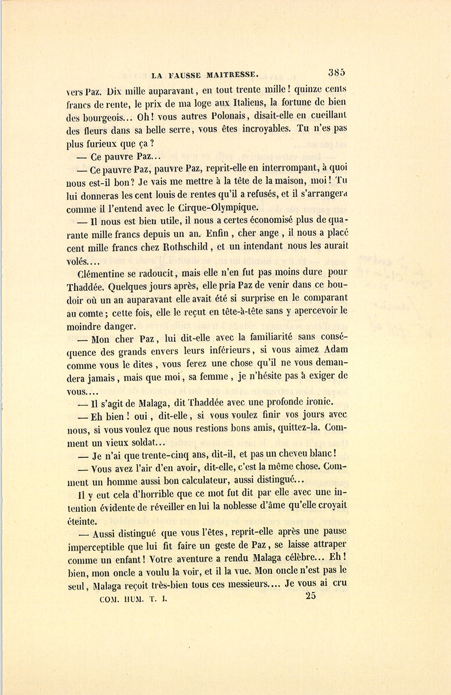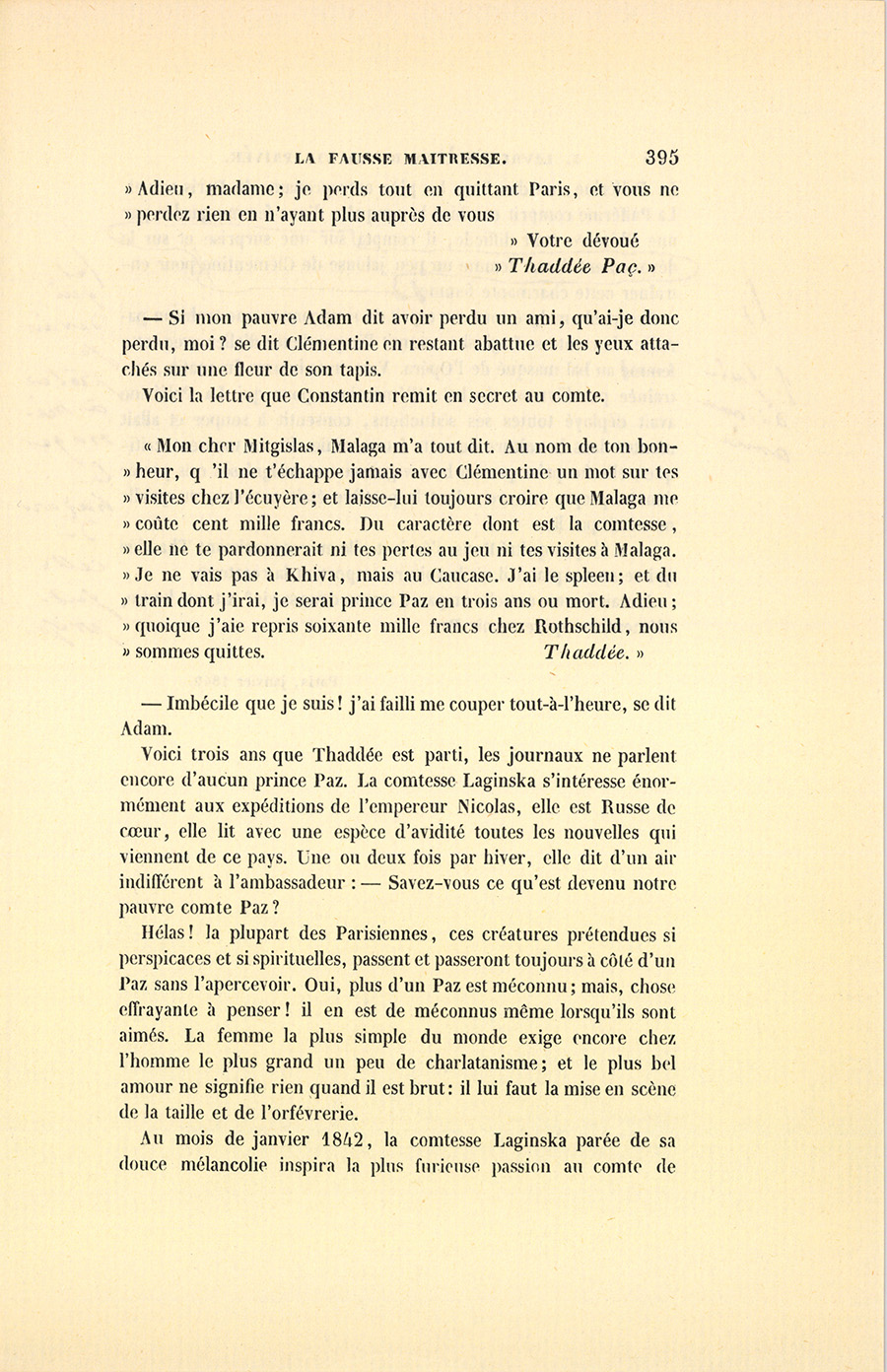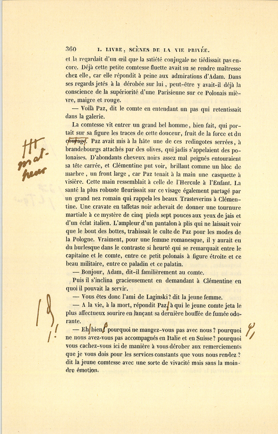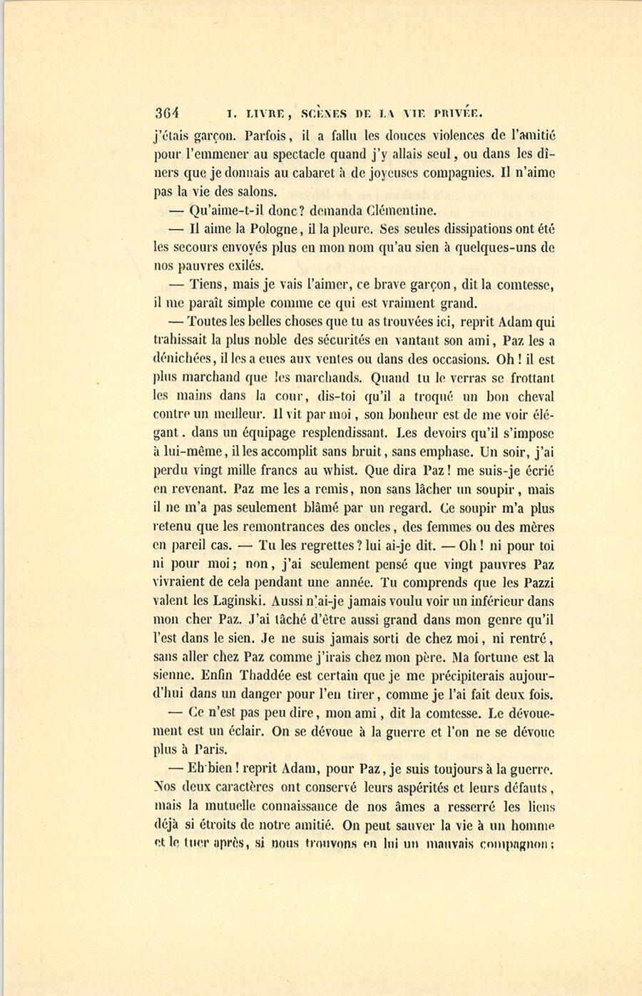Il n’est pas inutile de faire observer qu’Adam et Clémentine, mariés au mois de décembre 1835, étaient allés, après avoir passé l’hiver à Paris, en Italie, en Suisse et en Allemagne pendant l’année 1836. Revenue au mois de novembre, la comtesse reçut pour la première fois pendant l’hiver qui venait de finir, et s’aperçut alors {p. 359} de l’existence quasi muette, effacée, mais salutaire d’un factotum dont la personne paraissait invisible, ce capitaine Paz, (Paç) dont le nom se prononce comme il est écrit.