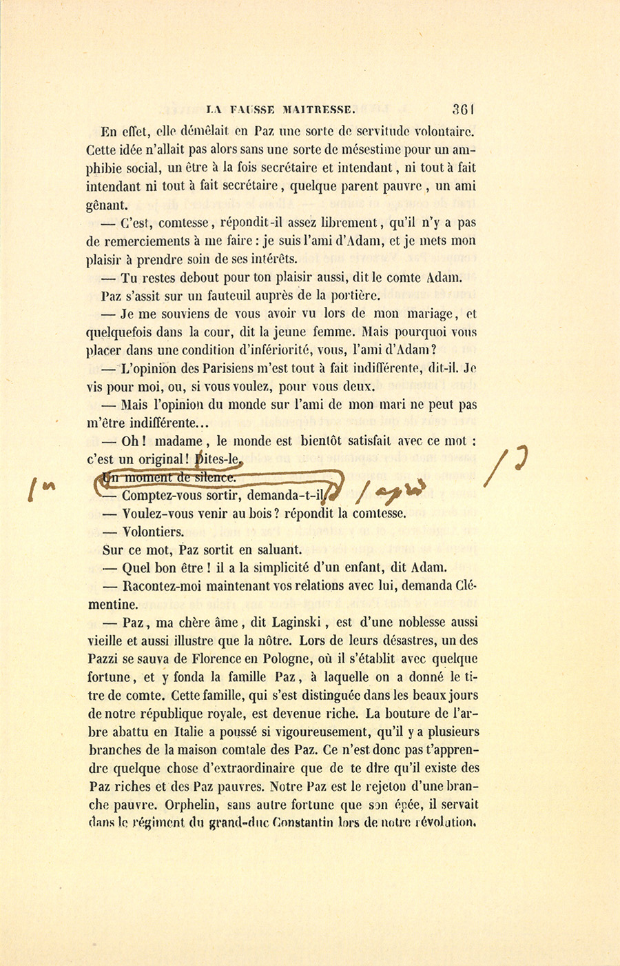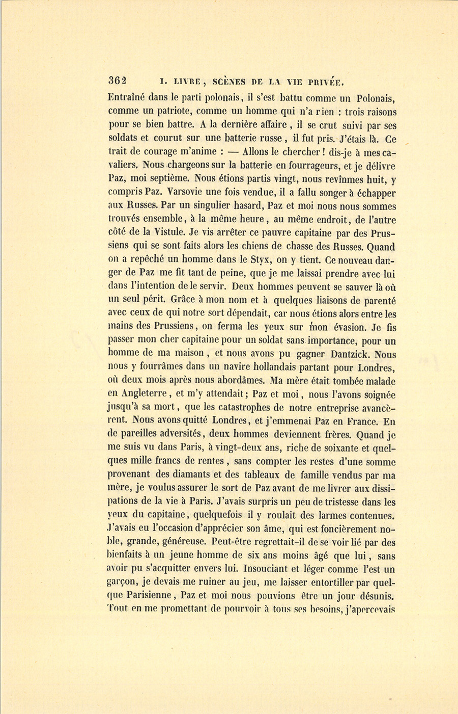 – Paz, ma chère âme, dit Laginski, est d’une noblesse aussi vieille et aussi illustre que la nôtre. Lors de leurs désastres, un des Pazzi se sauva de Florence en Pologne, où il s’établit avec quelque fortune, et y fonda la famille Paz, à laquelle on a donné le titre de comte. Cette famille, qui s’est distinguée dans les beaux jours de notre république royale, est devenue riche. La bouture de l’arbre abattu en Italie a poussé si vigoureusement, qu’il y a plusieurs branches de la maison comtale des Paz. Ce n’est donc pas t’apprendre quelque chose d’extraordinaire que de te dire qu’il existe des Paz riches et des Paz pauvres. Notre Paz est le rejeton d’une branche pauvre. Orphelin, sans autre fortune que son épée, il servait dans le régiment du grand-duc Constantin lors de notre révolution. {p. 362} Entraîné dans le parti polonais, il s’est battu comme un Polonais, comme un patriote, comme un homme qui n’a rien : trois raisons pour se bien battre. À la dernière affaire, il se crut suivi par ses soldats et courut sur une batterie russe, il fut pris. J’étais là. Ce trait de courage m’anime : – Allons le chercher ! dis-je à mes cavaliers. Nous chargeons sur la batterie en fourrageurs, et je délivre Paz, moi septième. Nous étions partis vingt, nous revînmes huit, y compris Paz. Varsovie une fois vendue, il a fallu songer à échapper aux Russes. Par un singulier hasard, Paz et moi nous nous sommes trouvés ensemble, à la même heure, au même endroit, de l’autre côté de la Vistule. Je vis arrêter ce pauvre capitaine par des Prussiens qui se sont faits alors les chiens de chasse des Russes. Quand on a repêché un homme dans le Styx, on y tient. Ce nouveau danger de Paz me fit tant de peine, que je me laissai prendre avec lui dans l’intention de le servir. Deux hommes peuvent se sauver là où un seul périt. Grâce à mon nom et à quelques liaisons de parenté avec ceux de qui notre sort dépendait, car nous étions alors entre les mains des Prussiens, on ferma les yeux sur mon évasion. Je fis passer mon cher capitaine pour un soldat sans importance, pour un homme de ma maison, et nous avons pu gagner Dantzick. Nous nous y fourrâmes dans un navire hollandais partant pour Londres, où deux mois après nous abordâmes. Ma mère était tombée malade en Angleterre, et m’y attendait ; Paz et moi, nous l’avons soignée jusqu’à sa mort, que les catastrophes de notre entreprise avancèrent. Nous avons quitté Londres, et j’emmenai Paz en France. En de pareilles adversités, deux hommes deviennent frères. Quand je me suis vu dans Paris, à vingt-deux ans, riche de soixante et quelques mille francs de rentes, sans compter les restes d’une somme provenant des diamants et des tableaux de famille vendus par ma mère, je voulus assurer le sort de Paz avant de me livrer aux dissipations de la vie à Paris. J’avais surpris un peu de tristesse dans les yeux du capitaine, quelquefois il y roulait des larmes contenues. J’avais eu l’occasion d’apprécier son âme, qui est foncièrement noble, grande, généreuse. Peut-être regrettait-il de se voir lié par des bienfaits à un jeune homme de six ans moins âgé que lui, sans avoir pu s’acquitter envers lui. Insouciant et léger comme l’est un garçon, je devais me ruiner au jeu, me laisser entortiller par quelque Parisienne, Paz et moi nous pouvions être un jour désunis. Tout en me promettant de pourvoir à tous ses besoins, j’apercevais {p. 363} bien des chances d’oublier ou d’être hors d’état de payer la pension de Paz. Enfin, mon ange, je voulus lui épargner la peine, la pudeur, la honte de me demander de l’argent ou de chercher vainement son compagnon dans un jour de détresse. Dunquè, un matin, après déjeuner, les pieds sur les chenets, fumant chacun notre pipe, après avoir bien rougi, pris bien des précautions, le voyant me regarder avec inquiétude, je lui tendis une inscription de rentes au porteur de deux mille quatre cents francs…