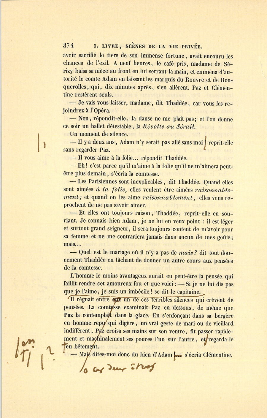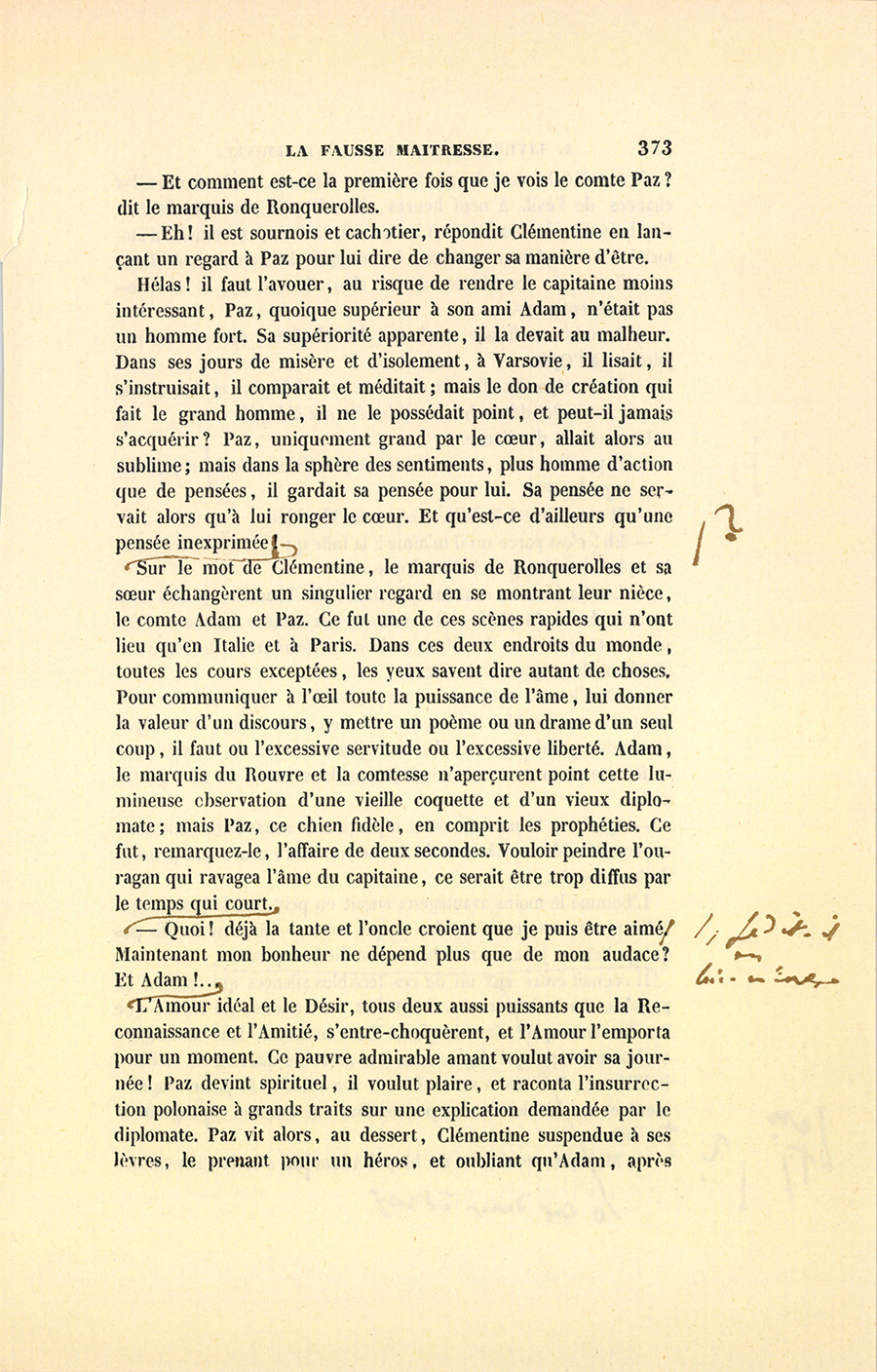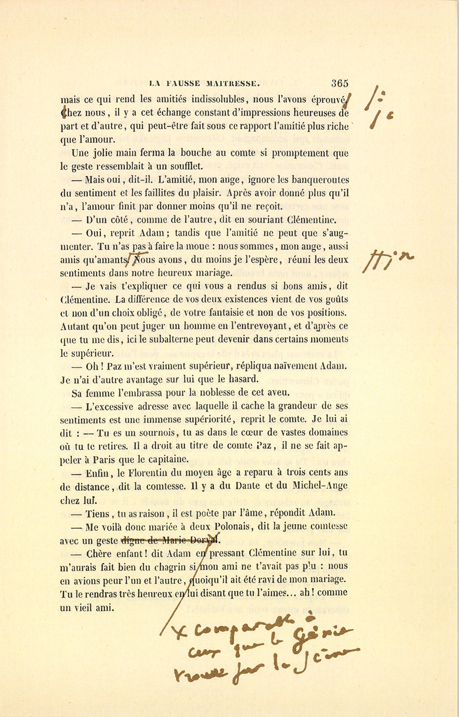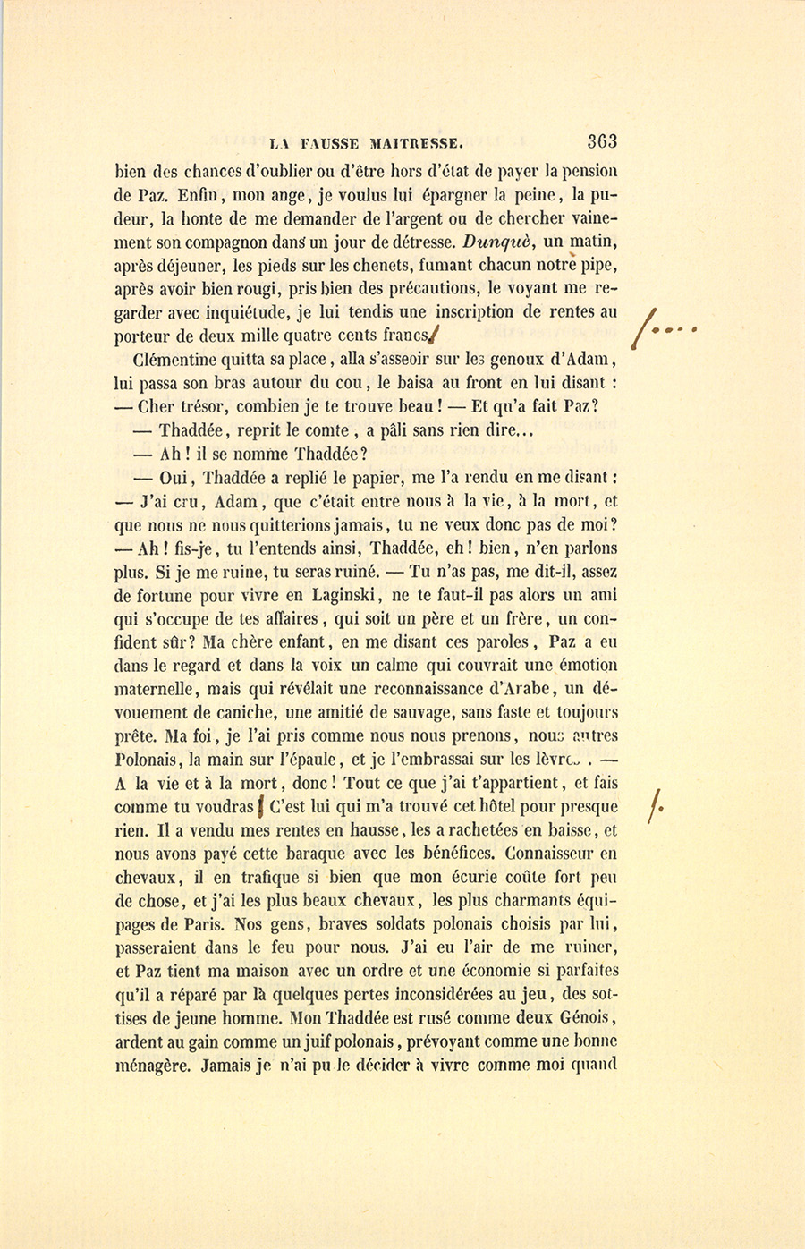 – Oui, Thaddée a replié le papier, me l’a rendu en me disant : – J’ai cru, Adam, que c’était entre nous à la vie, à la mort, et que nous ne nous quitterions jamais, tu ne veux donc pas de moi ? – Ah ! fis-je, tu l’entends ainsi, Thaddée, eh ! bien, n’en parlons plus. Si je me ruine, tu seras ruiné. – Tu n’as pas, me dit-il, assez de fortune pour vivre en Laginski, ne te faut-il pas alors un ami qui s’occupe de tes affaires, qui soit un père et un frère, un confident sûr ? Ma chère enfant, en me disant ces paroles, Paz a eu dans le regard et dans la voix un calme qui couvrait une émotion maternelle, mais qui révélait une reconnaissance d’Arabe, un dévouement de caniche, une amitié de sauvage, sans faste et toujours prête. Ma foi, je l’ai pris comme nous nous prenons, nous autres Polonais, la main sur l’épaule, et je l’embrassai sur les lèvres. – À la vie et à la mort, donc ! Tout ce que j’ai t’appartient, et fais comme tu voudras. C’est lui qui m’a trouvé cet hôtel pour presque rien. Il a vendu mes rentes en hausse, les a rachetées en baisse, et nous avons payé cette baraque avec les bénéfices. Connaisseur en chevaux, il en trafique si bien que mon écurie coûte fort peu de chose, et j’ai les plus beaux chevaux, les plus charmants équipages de Paris. Nos gens, braves soldats polonais choisis par lui, passeraient dans le feu pour nous. J’ai eu l’air de me ruiner, et Paz tient ma maison avec un ordre et une économie si parfaits2 qu’il a réparé par là quelques pertes inconsidérées au jeu, des sottises de jeune homme. Mon Thaddée est rusé comme deux Génois, ardent au gain comme un juif polonais, prévoyant comme une bonne ménagère. Jamais je n’ai pu le décider à vivre comme moi quand {p. 364} j’étais garçon. Parfois, il a fallu les douces violences de l’amitié pour l’emmener au spectacle quand j’y allais seul, ou dans les dîners que je donnais au cabaret à de joyeuses compagnies. Il n’aime pas la vie des salons.