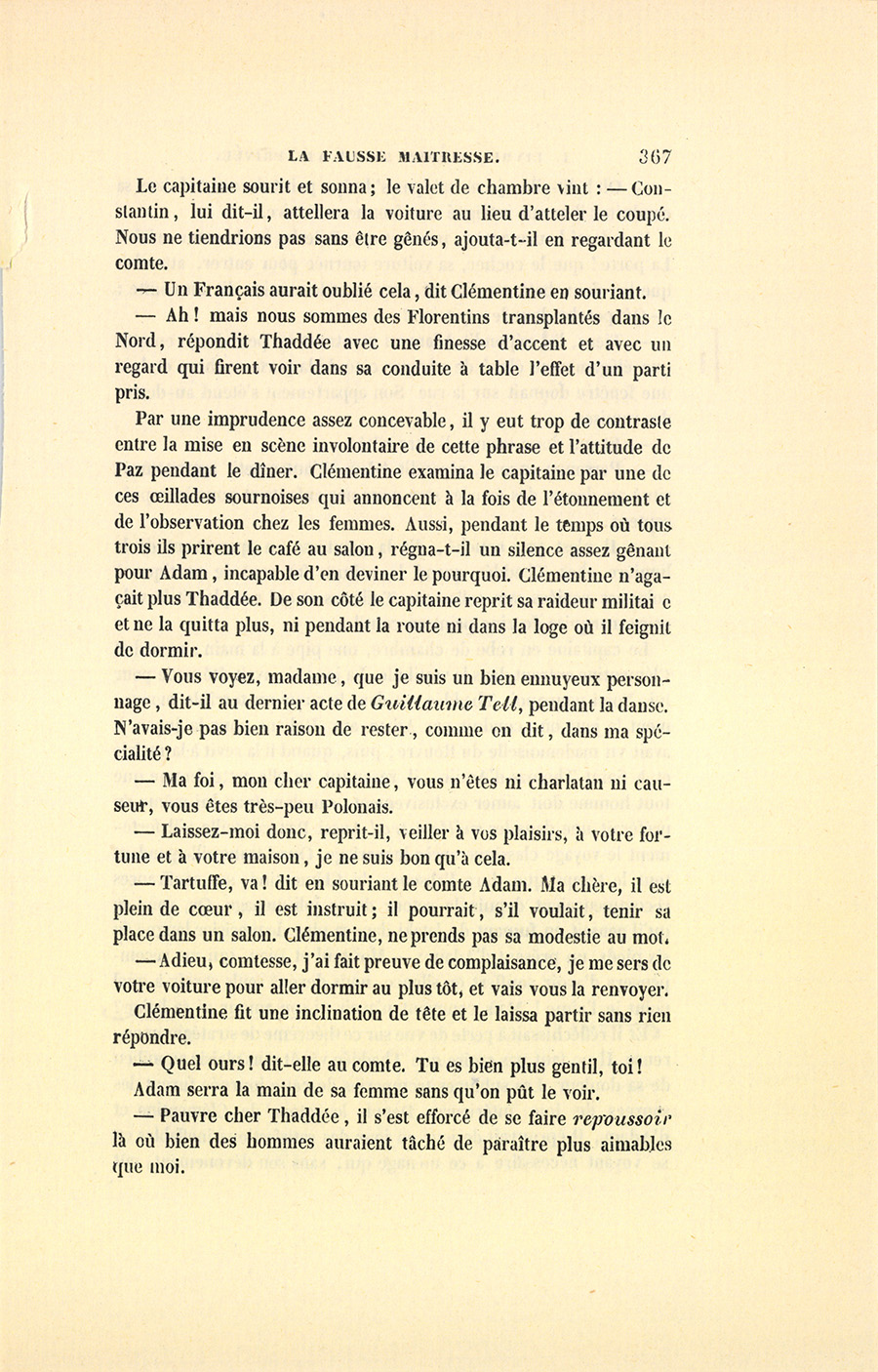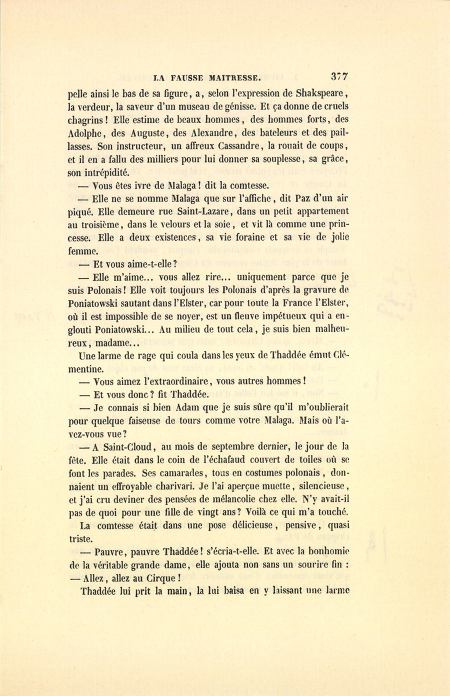 – Ah ! dit Clémentine à son mari, vous autres Polonais, vous êtes des gens sans caractère. Qui n’aurait pas eu confiance en Thaddée ? Il m’a donné sa parole, sans savoir que je serais ici voyant tout et n’étant pas vue.