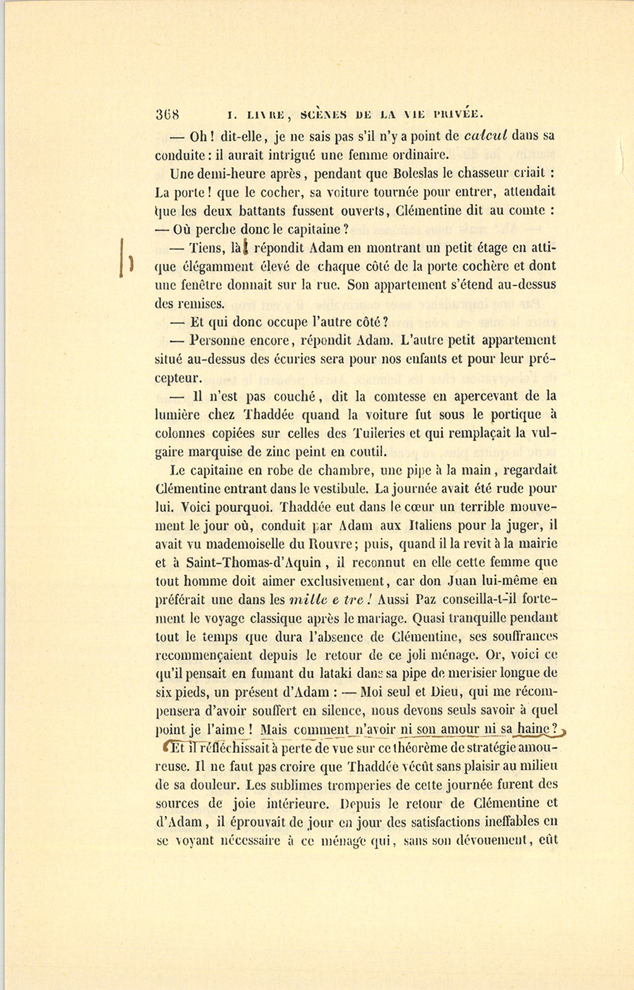 Clémentine se radoucit, mais elle n’en fut pas moins dure pour Thaddée. Quelques jours après, elle pria Paz de venir dans ce boudoir où un an auparavant elle avait été si surprise en le comparant au comte ; cette fois, elle le reçut en tête-à-tête sans y apercevoir le moindre danger.