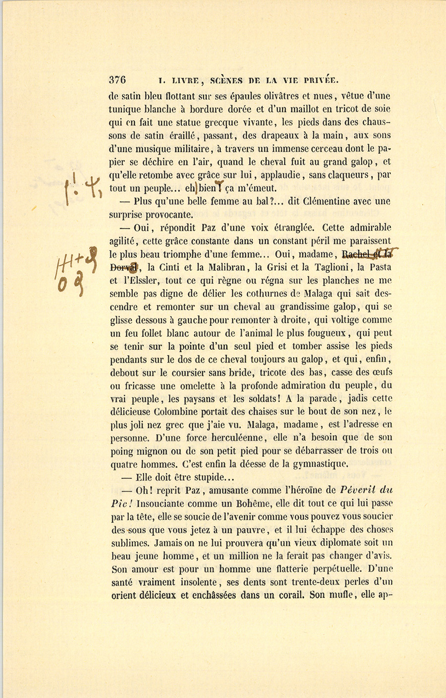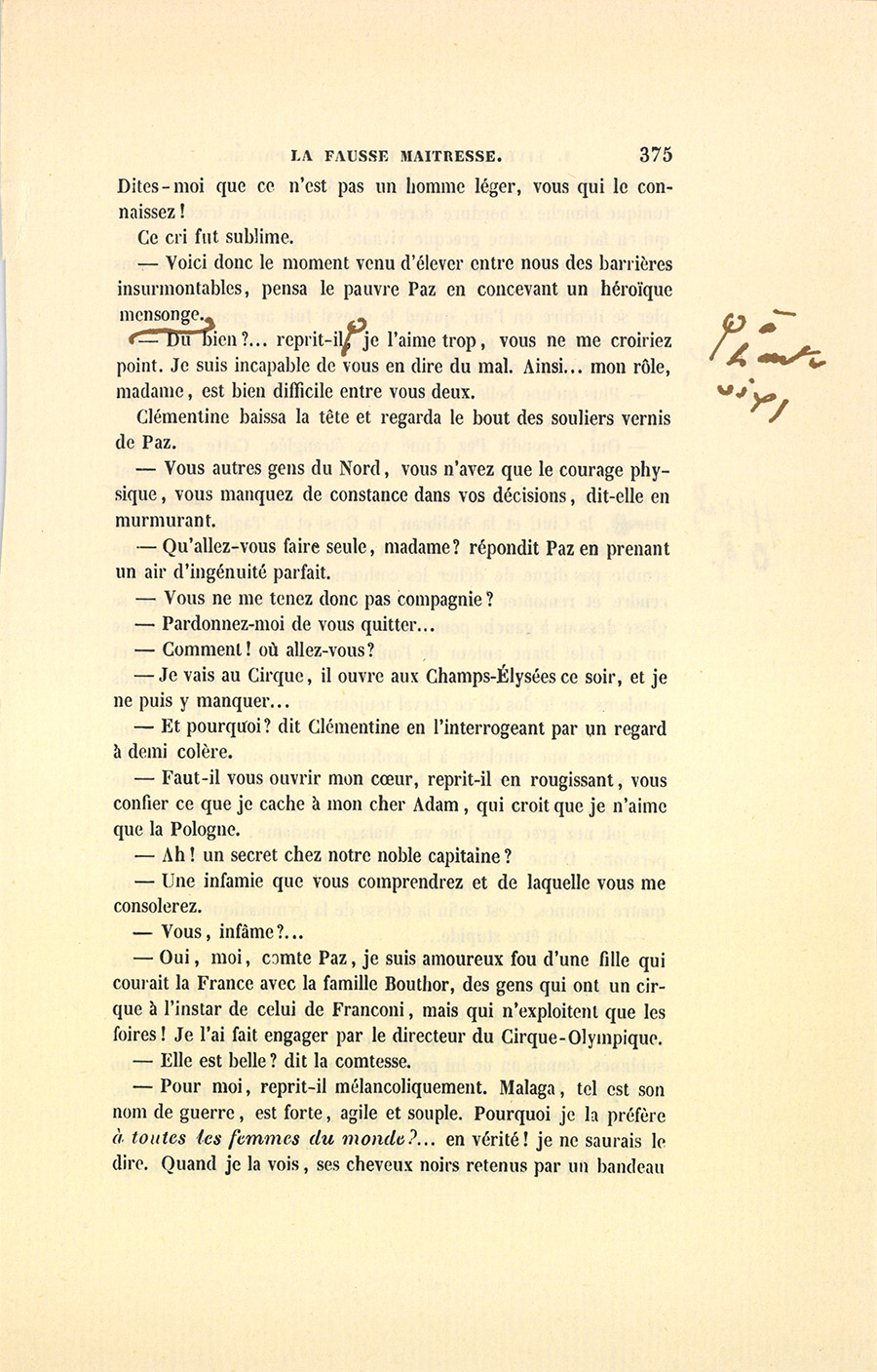 – Guéri ?… jamais, dit Paz les yeux baissés en regardant les jolis pieds de Clémentine. Vous ignorez, comtesse, ce que cette {p. 388} femme a de piquant et d’inattendu dans l’esprit. En sentant son courage faillir, il ajouta : – Il n’y a pas de femme du monde avec ses airs de mijaurée qui vaille cette franche nature de jeune animal…