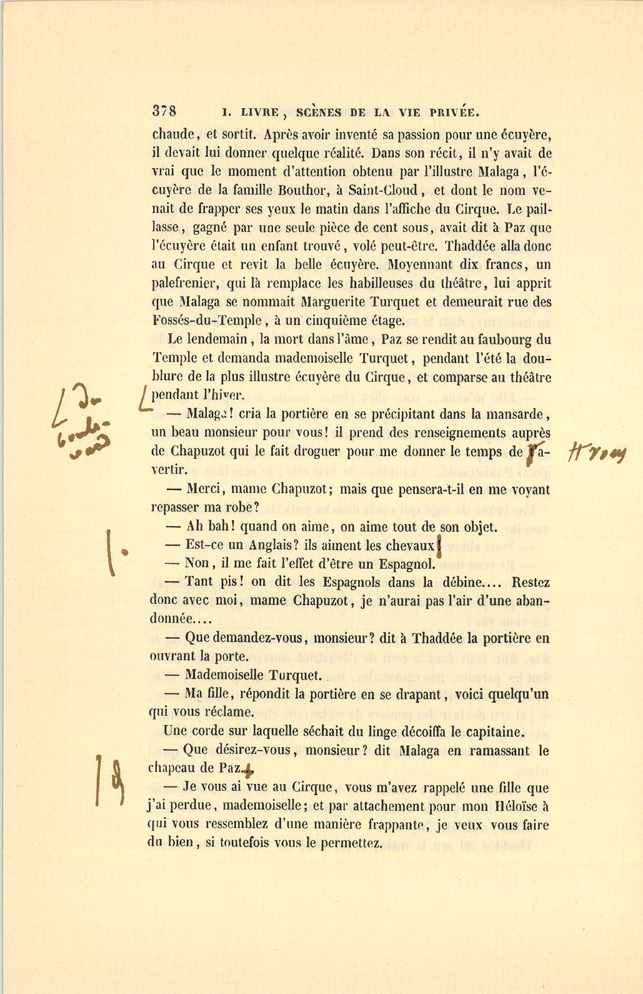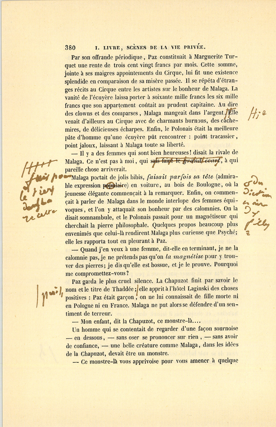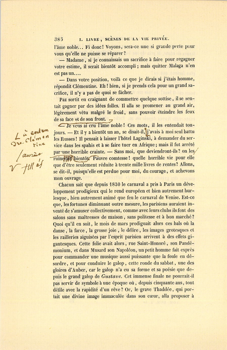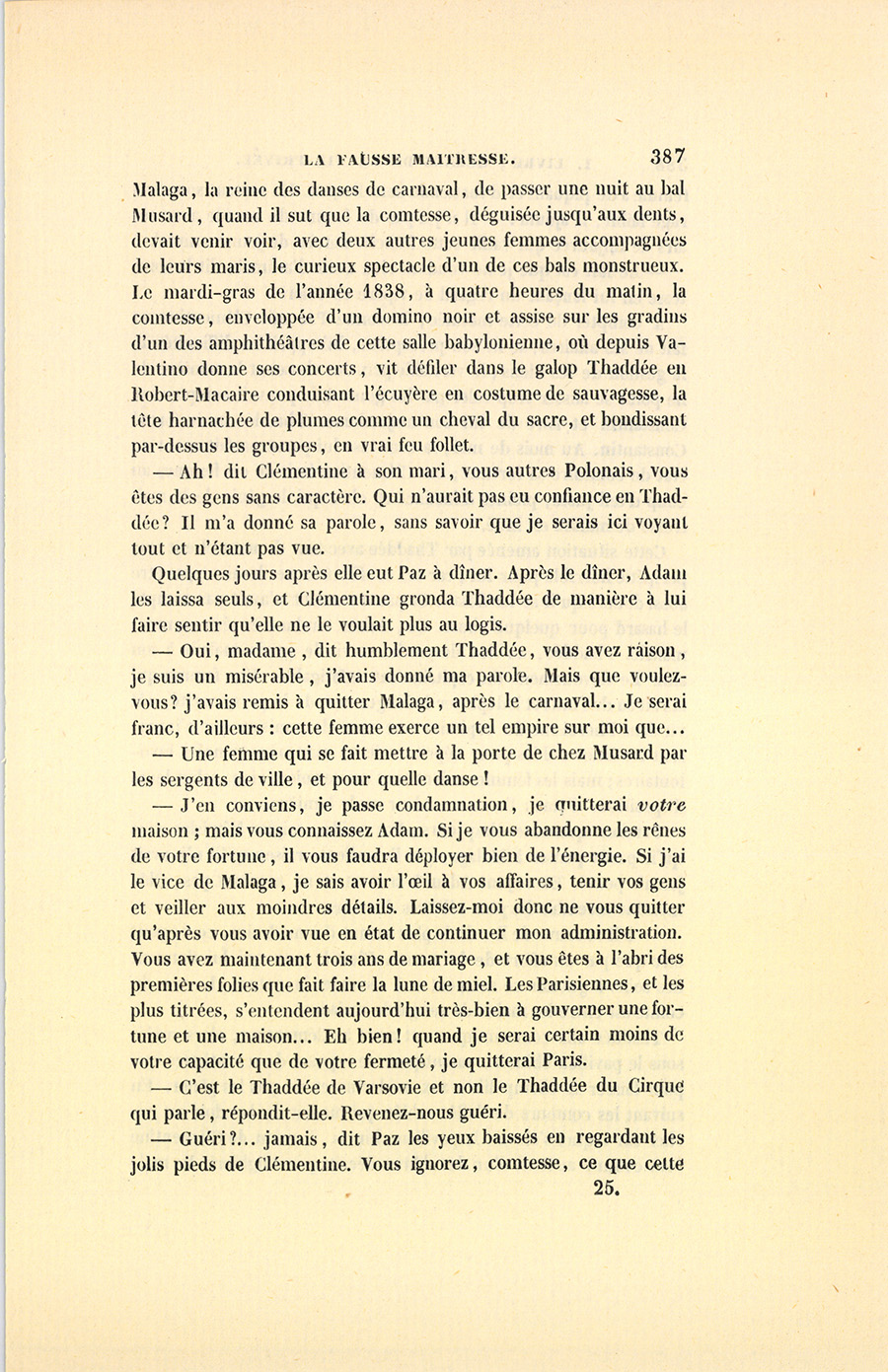 Chacun sait que depuis 1830 le carnaval a pris à Paris un développement prodigieux qui le rend européen et bien autrement burlesque, bien autrement animé que feu le carnaval de Venise. Est-ce que, les fortunes diminuant outre mesure, les parisiens auraient inventé de s’amuser collectivement, comme avec leurs clubs ils font des salons sans maîtresses de maison, sans politesse et à bon marché ? Quoi qu’il en soit, le mois de mars prodiguait alors ces bals où la danse, la farce, la grosse joie, le délire, les images grotesques et les railleries aiguisées par l’esprit parisien arrivent à des effets gigantesques. Cette folie avait alors, rue Saint-Honoré, son Pandémonium, et dans Musard son Napoléon, un petit homme fait exprès pour commander une musique aussi puissante que la foule en désordre, et pour conduire le galop, cette ronde du sabbat, une des gloires d’Auber, car le galop n’a eu sa forme et sa poésie que depuis le grand galop de Gustave. Cet immense finale ne pourrait-il pas servir de symbole à une époque où, depuis cinquante ans, tout défile avec la rapidité d’un rêve ? Or, le grave Thaddée, qui portait une divine image immaculée dans son cœur, alla proposer à {p. 387} Malaga, la reine des danses de carnaval, de passer une nuit au bal Musard, quand il sut que la comtesse, déguisée jusqu’aux dents, devait venir voir, avec deux autres jeunes femmes accompagnées de leurs maris, le curieux spectacle d’un de ces bals monstrueux. Le mardi-gras de l’année 1838, à quatre heures du matin, la comtesse, enveloppée d’un domino noir et assise sur les gradins d’un des amphithéâtres de cette salle babylonienne, où depuis Valentino donne ses concerts, vit défiler dans le galop Thaddée en Robert-Macaire conduisant l’écuyère en costume de sauvagesse, la tête harnachée de plumes comme un cheval du sacre, et bondissant par-dessus les groupes, en vrai feu follet.