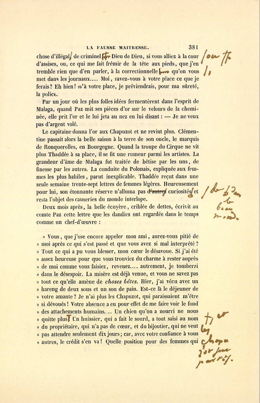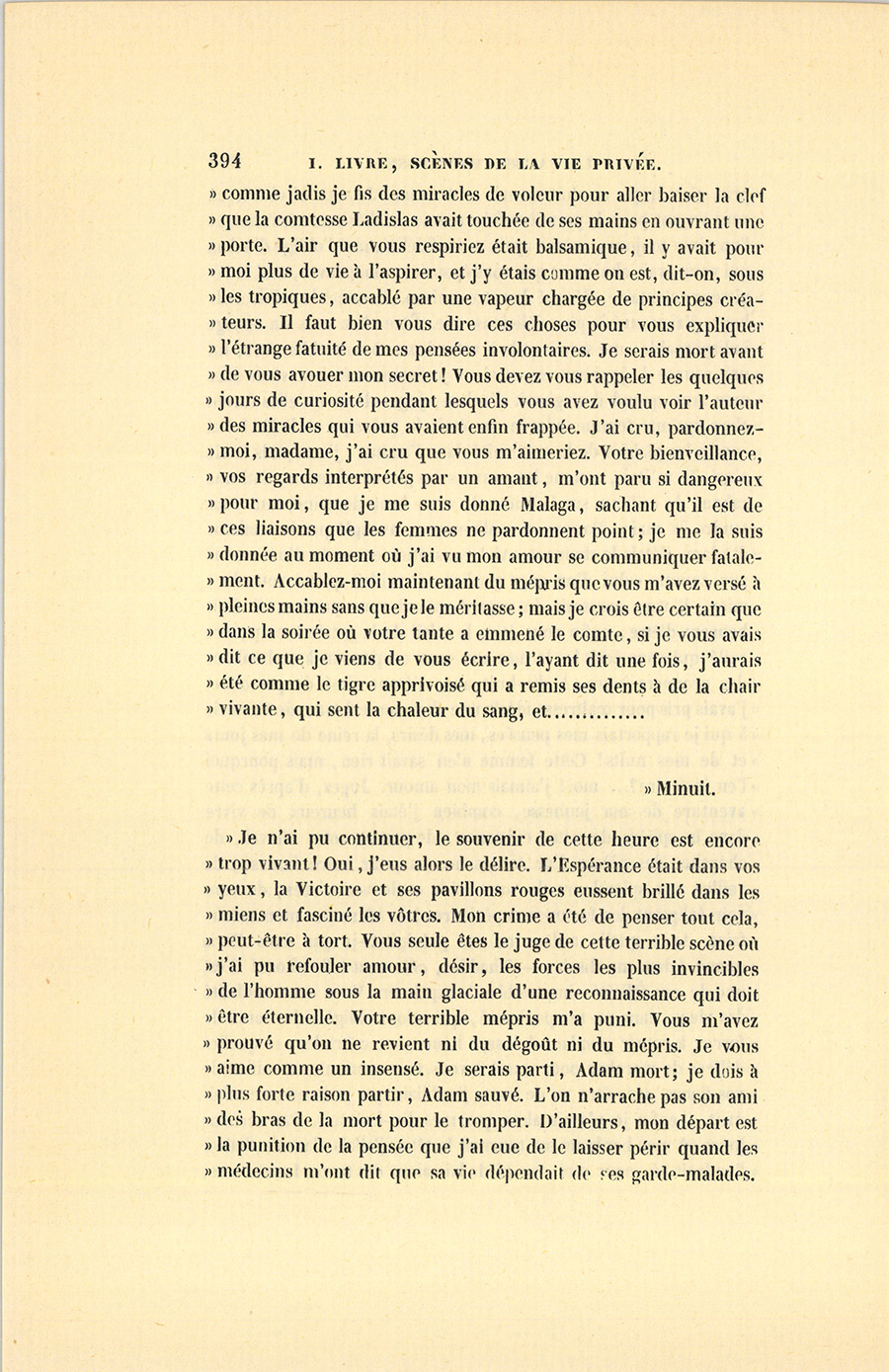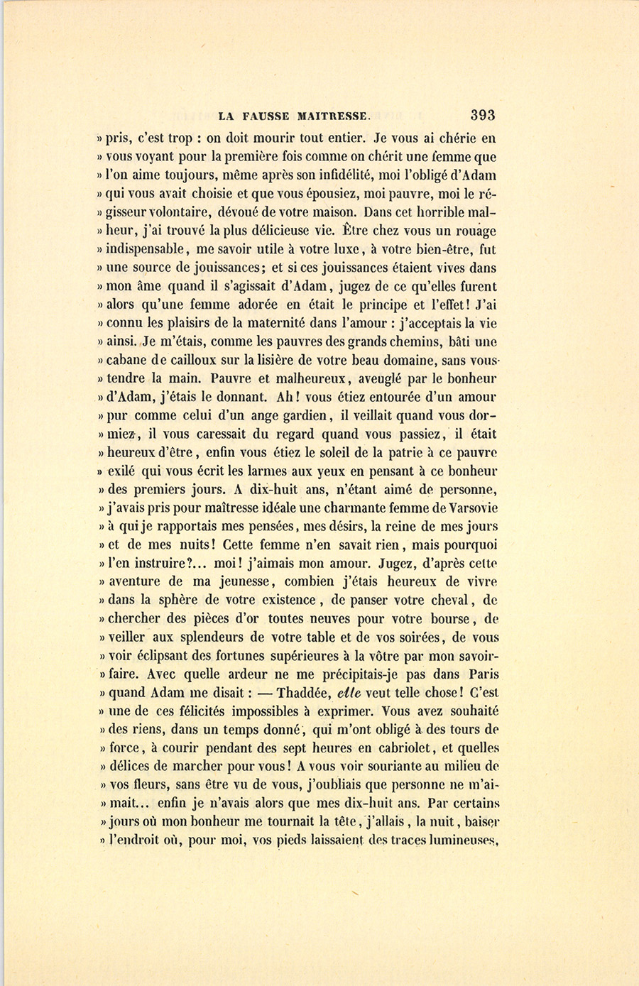 « Comtesse, aller se faire tuer au Caucase et emporter votre {p. 393} mépris, c’est trop : on doit mourir tout entier. Je vous ai chérie en vous voyant pour la première fois comme on chérit une femme que l’on aime toujours, même après son infidélité, moi l’obligé d’Adam qui vous avait choisie et que vous épousiez, moi pauvre, moi le régisseur volontaire, dévoué de votre maison. Dans cet horrible malheur, j’ai trouvé la plus délicieuse vie. Être chez vous un rouage indispensable, me savoir utile à votre luxe, à votre bien-être, fut une source de jouissances ; et si ces jouissances étaient vives dans mon âme quand il s’agissait d’Adam, jugez de ce qu’elles furent alors qu’une femme adorée en était le principe et l’effet ! J’ai connu les plaisirs de la maternité dans l’amour : j’acceptais la vie ainsi. Je m’étais, comme les pauvres des grands chemins, bâti une cabane de cailloux sur la lisière de votre beau domaine, sans vous tendre la main. Pauvre et malheureux, aveuglé par le bonheur d’Adam, j’étais le donnant. Ah ! vous étiez entourée d’un amour pur comme celui d’un ange gardien, il veillait quand vous dormiez, il vous caressait du regard quand vous passiez, il était heureux d’être, enfin vous étiez le soleil de la patrie à ce pauvre exilé qui vous écrit les larmes aux yeux en pensant à ce bonheur des premiers jours. À dix-huit ans, n’étant aimé de personne, j’avais pris pour maîtresse idéale une charmante femme de Varsovie à qui je rapportais mes pensées, mes désirs, la reine de mes jours et de mes nuits ! Cette femme n’en savait rien, mais pourquoi l’en instruire ?… moi ! j’aimais mon amour. Jugez, d’après cette aventure de ma jeunesse, combien j’étais heureux de vivre dans la sphère de votre existence, de panser votre cheval, de chercher des pièces d’or toutes neuves pour votre bourse, de veiller aux splendeurs de votre table et de vos soirées, de vous voir éclipsant des fortunes supérieures à la vôtre par mon savoir-faire. Avec quelle ardeur ne me précipitais-je pas dans Paris quand Adam me disait : – Thaddée, elle veut telle chose ! C’est une de ces félicités impossibles à exprimer. Vous avez souhaité des riens, dans un temps donné, qui m’ont obligé à des tours de force, à courir pendant des sept heures en cabriolet, et quelles délices de marcher pour vous ! À vous voir souriante au milieu de vos fleurs, sans être vu de vous, j’oubliais que personne ne m’aimait… enfin je n’avais alors que mes dix-huit ans. Par certains jours où mon bonheur me tournait la tête, j’allais, la nuit, baiser l’endroit où, pour moi, vos pieds laissaient des traces lumineuses, {p. 394} comme jadis je fis des miracles de voleur pour aller baiser la clef que la comtesse Ladislas avait touchée de ses mains en ouvrant une porte. L’air que vous respiriez était balsamique, il y avait pour moi plus de vie à l’aspirer, et j’y étais comme on est, dit-on, sous les tropiques, accablé par une vapeur chargée de principes créateurs. Il faut bien vous dire ces choses pour vous expliquer l’étrange fatuité de mes pensées involontaires. Je serais mort avant de vous avouer mon secret ! Vous devez vous rappeler les quelques jours de curiosité pendant lesquels vous avez voulu voir l’auteur des miracles qui vous avaient enfin frappée. J’ai cru, pardonnez-moi, madame, j’ai cru que vous m’aimeriez. Votre bienveillance, vos regards interprétés par un amant, m’ont paru si dangereux pour moi, que je me suis donné Malaga, sachant qu’il est de ces liaisons que les femmes ne pardonnent point ; je me la suis donnée au moment où j’ai vu mon amour se communiquer fatalement. Accablez-moi maintenant du mépris que vous m’avez versé à pleines mains sans que je le méritasse ; mais je crois être certain que dans la soirée où votre tante a emmené le comte, si je vous avais dit ce que je viens de vous écrire, l’ayant dit une fois, j’aurais été comme le tigre apprivoisé qui a remis ses dents à de la chair vivante, qui sent la chaleur du sang, et…