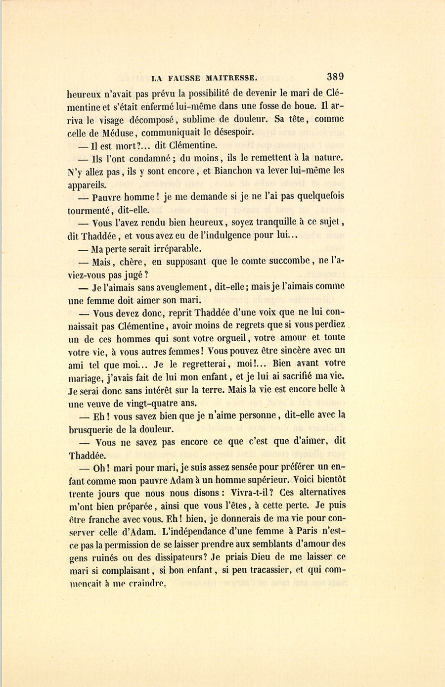 – Oh ! mari pour mari, je suis assez sensée pour préférer un enfant comme mon pauvre Adam à un homme supérieur. Voici bientôt trente jours que nous nous disons : Vivra-t-il ? Ces alternatives m’ont bien préparée, ainsi que vous l’êtes, à cette perte. Je puis être franche avec vous. Eh ! bien, je donnerais de ma vie pour conserver celle d’Adam. L’indépendance d’une femme à Paris n’est-ce pas la permission de se laisser prendre aux semblants d’amour des gens ruinés ou des dissipateurs ? Je priais Dieu de me laisser ce mari si complaisant, si bon enfant, si peu tracassier, et qui commençait à me craindre.