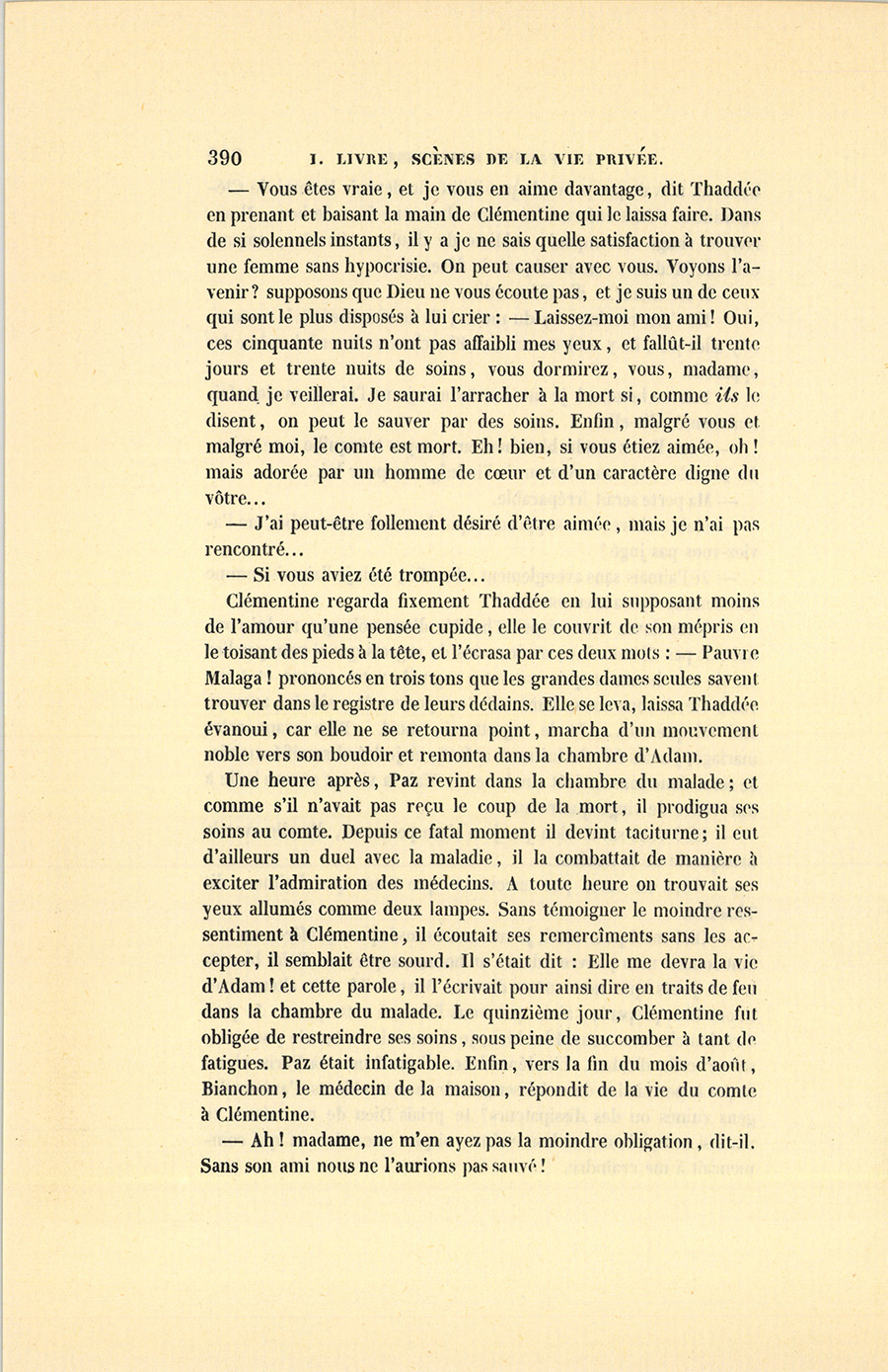 Pendant quarante-cinq jours, Paz veilla, soigna Mitgislas sans qu’il parût penser à Malaga, par l’excellente raison qu’il n’y avait jamais pensé. En voyant Adam à la mort et ne mourant pas, Clémentine assembla les plus célèbres docteurs.