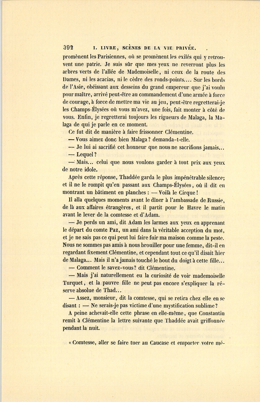 – Adieu les jeunes arbres de ce beau bois de Boulogne où se {p. 392} promènent les Parisiennes, où se promènent les exilés qui y retrouvent une patrie. Je suis sûr que mes yeux ne reverront plus les arbres verts de l’allée de Mademoiselle, ni ceux de la route des Dames, ni les acacias, ni le cèdre des ronds-points… Sur les bords de l’Asie, obéissant aux desseins du grand empereur que j’ai voulu pour maître, arrivé peut-être au commandement d’une armée à force de courage, à force de mettre ma vie au jeu, peut-être regretterai-je les Champs-Élysées où vous m’avez, une fois, fait monter à côté de vous. Enfin, je regretterai toujours les rigueurs de Malaga, la Malaga de qui je parle en ce moment.