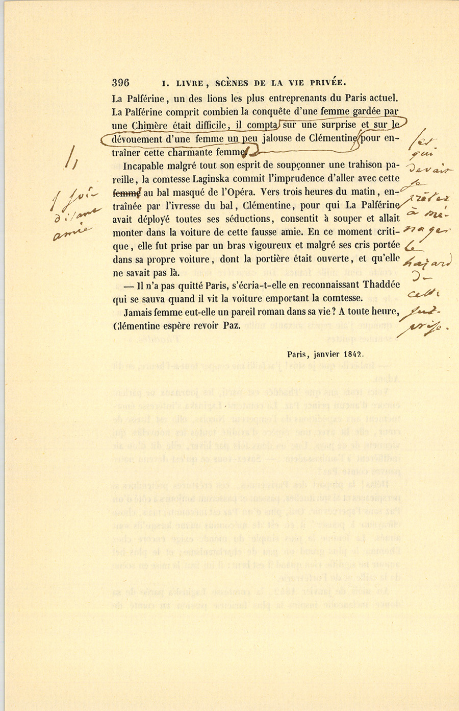 Au mois de janvier 1842, la comtesse Laginska parée de sa douce mélancolie inspira la plus furieuse passion au comte de {p. 396} La Palférine, un des lions les plus entreprenants du Paris actuel. La Palférine comprit combien la conquête d’une femme gardée par une Chimère était difficile, il compta, pour entraîner cette charmante femme, sur une surprise et sur le dévouement d’une femme un peu jalouse de Clémentine et qui devait se prêter à ménager le hasard de cette surprise.
