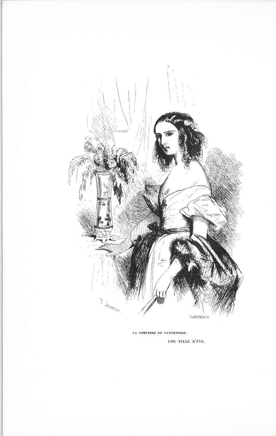 Pour toute réponse, Vandenesse emmena précipitamment Florine et courut rejoindre sa femme à un endroit convenu sous le péristyle. En quelques instants les trois masques, menés vivement par le cocher de Vandenesse, arrivèrent chez l’actrice qui se démasqua. Madame de Vandenesse ne put retenir un tressaillement de surprise à l’aspect de Florine étouffant de rage, superbe de colère et de jalousie.