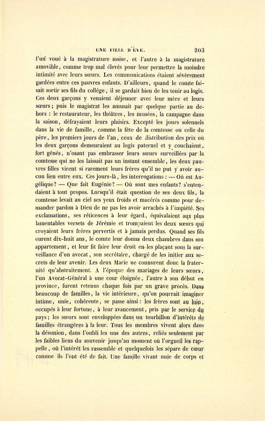 {p. 202} Les deux Marie n’allèrent au bal qu’à l’âge de seize ans, et quatre fois seulement par année, dans quelques maisons choisies. Elles ne quittaient les côtés de leur mère que munies d’instructions sur la conduite à suivre avec leurs danseurs, et si sévères qu’elles ne pouvaient répondre que oui ou non à leurs partenaires. L’œil de la comtesse n’abandonnait point ses filles et semblait deviner les paroles au seul mouvement des lèvres. Les pauvres petites avaient des toilettes de bal irréprochables, des robes de mousseline montant jusqu’au menton, avec une infinité de ruches excessivement fournies, et des manches longues. En tenant leurs grâces comprimées et leurs beautés voilées, cette toilette leur donnait une vague ressemblance avec les gaînes égyptiennes ; néanmoins il sortait de ces blocs de coton deux figures délicieuses de mélancolie. Elles enrageaient en se voyant l’objet d’une pitié douce. Quelle est la femme, si candide qu’elle soit, qui ne souhaite faire envie ? Aucune idée dangereuse, malsaine ou seulement équivoque, ne souilla donc la pulpe blanche de leur cerveau : leurs cœurs étaient purs, leurs mains étaient horriblement rouges, elles crevaient de santé. Ève ne sortit pas plus innocente des mains de Dieu que ces deux filles ne le furent en sortant du logis maternel pour aller à la Mairie et à l’Église, avec la simple mais épouvantable recommandation d’obéir en toute chose à des hommes auprès desquels elles devaient dormir ou veiller pendant la nuit. À leur sens, elles ne pouvaient se trouver plus mal dans la maison étrangère où elles seraient déportées que dans le couvent maternel. Pourquoi le père de ces deux filles, le comte de Granville, ce grand, savant et intègre magistrat, quoique parfois entraîné par la politique, ne protégeait-il pas ces deux petites créatures contre cet écrasant despotisme ? Hélas ! par une mémorable transaction, convenue après dix ans de mariage, les époux vivaient séparés dans leur propre maison. Le père s’était réservé l’éducation de ses fils, en laissant à sa femme l’éducation des filles. Il vit beaucoup moins de danger pour des femmes que pour des hommes à l’application de ce système oppresseur. Les deux Marie, destinées à subir quelque tyrannie, celle de l’amour ou celle du mariage, y perdaient moins que des garçons chez qui l’intelligence devait rester libre, et dont les qualités se seraient détériorées sous la compression violente des idées religieuses poussées à toutes leurs conséquences. De quatre victimes, le comte en avait sauvé deux. La comtesse regardait ses deux fils, {p. 203} l’un voué à la magistrature assise, et l’autre à la magistrature amovible, comme trop mal élevés pour leur permettre la moindre intimité avec leurs sœurs. Les communications étaient sévèrement gardées entre ces pauvres enfants. D’ailleurs, quand le comte faisait sortir ses fils du collége, il se gardait bien de les tenir au logis. Ces deux garçons y venaient déjeuner avec leur mère et leurs sœurs ; puis le magistrat les amusait par quelque partie au dehors : le restaurateur, les théâtres, les musées, la campagne dans la saison, défrayaient leurs plaisirs. Excepté les jours solennels dans la vie de famille, comme la fête de la comtesse ou celle du père, les premiers jours de l’an, ceux de distribution des prix où les deux garçons demeuraient au logis paternel et y couchaient, fort gênés, n’osant pas embrasser leurs sœurs surveillées par la comtesse qui ne les laissait pas un instant ensemble, les deux pauvres filles virent si rarement leurs frères qu’il ne put y avoir aucun lien entre eux. Ces jours-là, les interrogations : – Où est Angélique ? – Que fait Eugénie ? – Où sont mes enfants ? s’entendaient à tout propos. Lorsqu’il était question de ses deux fils, la comtesse levait au ciel ses yeux froids et macérés comme pour demander pardon à Dieu de ne pas les avoir arrachés à l’impiété. Ses exclamations, ses réticences à leur égard, équivalaient aux plus lamentables versets de Jérémie et trompaient les deux sœurs qui croyaient leurs frères pervertis et à jamais perdus. Quand ses fils eurent dix-huit ans, le comte leur donna deux chambres dans son appartement, et leur fit faire leur droit en les plaçant sous la surveillance d’un avocat, son secrétaire, chargé de les initier aux secrets de leur avenir. Les deux Marie ne connurent donc la fraternité qu’abstraitement. À l’époque des mariages de leurs sœurs, l’un Avocat-Général à une cour éloignée, l’autre à son début en province, furent retenus chaque fois par un grave procès. Dans beaucoup de familles, la vie intérieure, qu’on pourrait imaginer intime, unie, cohérente, se passe ainsi : les frères sont au loin, occupés à leur fortune, à leur avancement, pris par le service du pays ; les sœurs sont enveloppées dans un tourbillon d’intérêts de familles étrangères à la leur. Tous les membres vivent alors dans la désunion, dans l’oubli les uns des autres, reliés seulement par les faibles liens du souvenir jusqu’au moment où l’orgueil les rappelle, où l’intérêt les rassemble et quelquefois les sépare de cœur comme ils l’ont été de fait. Une famille vivant unie de corps et {p. 204} d’esprit est une rare exception. La loi moderne, en multipliant la famille par la famille, a créé le plus horrible de tous les maux : l’individualisme.