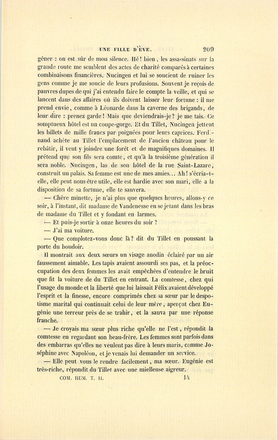 Dans un des plus beaux hôtels de la rue Neuve-des-Mathurins, à onze heures et demie du soir, deux femmes étaient assises devant la cheminée d’un boudoir tendu de ce velours bleu à reflets tendres et chatoyants que l’industrie française n’a su fabriquer que dans ces dernières années. Aux portes, aux croisées, un de ces tapissiers qui sont de vrais artistes {p. 196} avait drapé de moelleux rideaux en cachemire d’un bleu pareil à celui de la tenture. Une lampe d’argent ornée de turquoises et suspendue par trois chaînes d’un beau travail, descend d’une jolie rosace placée au milieu du plafond. Le système de la décoration est poursuivi dans les plus petits détails et jusque dans ce plafond en soie bleue, étoilé de cachemire blanc dont les longues bandes plissées retombent à d’égales distances sur la tenture, agrafées par des nœuds de perles. Les pieds rencontrent le chaud tissu d’un tapis belge, épais comme un gazon et à fond gris de lin semé de bouquets bleus. Le mobilier, sculpté en plein bois de palissandre d’après les plus beaux modèles du vieux temps, rehausse par ses tons riches la fadeur de cet ensemble, un peu trop flou, dirait un peintre. Le dos des chaises et des fauteuils offre à l’œil des pages menues en belle étoffe de soie blanche, brochée de fleurs bleues et largement encadrées par des feuillages finement découpés dans le bois. De chaque côté de la croisée, deux étagères montrent leurs mille bagatelles précieuses, les fleurs des arts mécaniques écloses au feu de la pensée. Sur la cheminée en marbre turquin, les porcelaines les plus folles du vieux Saxe, ces bergers qui vont à des noces éternelles en tenant de délicats bouquets à la main, espèces de chinoiseries allemandes, entourent une pendule en platine, niellée d’arabesques. Au-dessus, brillent les tailles côtelées d’une glace de Venise encadrée d’un ébène chargé de figures en relief, et venue de quelque vieille résidence royale. Deux jardinières étalaient alors le luxe malade des serres, de pâles et divines fleurs, les perles de la botanique. Dans ce boudoir froid, rangé, propre comme s’il eût été à vendre, vous n’eussiez pas trouvé ce malin et capricieux désordre qui révèle le bonheur. Là, tout était alors en harmonie, car les deux femmes y pleuraient. Tout y paraissait souffrant. Le nom du propriétaire, Ferdinand du Tillet, un des plus riches banquiers de Paris, justifie le luxe effréné qui orne l’hôtel, et auquel ce boudoir peut servir de programme. Quoique sans famille, quoique parvenu, Dieu sait comment ! du Tillet avait épousé en 1831 la dernière fille du comte de Granville, l’un des plus célèbres noms de la magistrature française, et devenu pair de France après la révolution de juillet. Ce mariage d’ambition fut acheté par la quittance au contrat d’une dot non touchée, aussi {p. 197} considérable que celle de la sœur aînée mariée au comte Félix de Vandenesse. [ill.] De leur côté, les Granville avaient jadis obtenu cette alliance avec les Vandenesse par l’énormité de la dot. Ainsi, la Banque avait réparé la brèche faite à la Magistrature par la Noblesse. Si le comte de Vandenesse s’était pu voir, à trois ans de distance, beau-frère d’un sieur Ferdinand dit du Tillet, il n’eût peut-être pas épousé sa femme ; mais quel homme aurait, vers la fin de 1828, prévu les étranges bouleversements que 1830 devait apporter dans l’état politique, dans les fortunes et dans la morale de la France ? Il eût passé pour fou, celui qui aurait dit au comte Félix de Vandenesse que, dans ce chassez-croisez, il perdrait sa couronne de pair et qu’elle se retrouverait sur la tête de son beau-père.