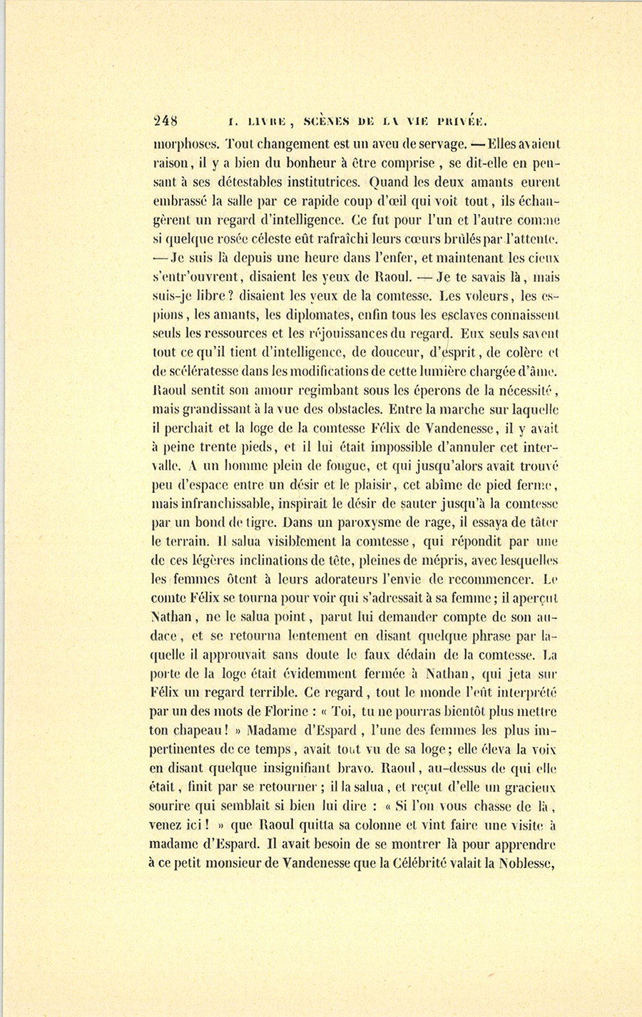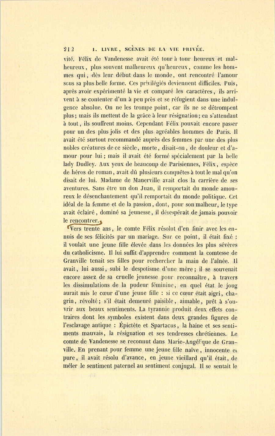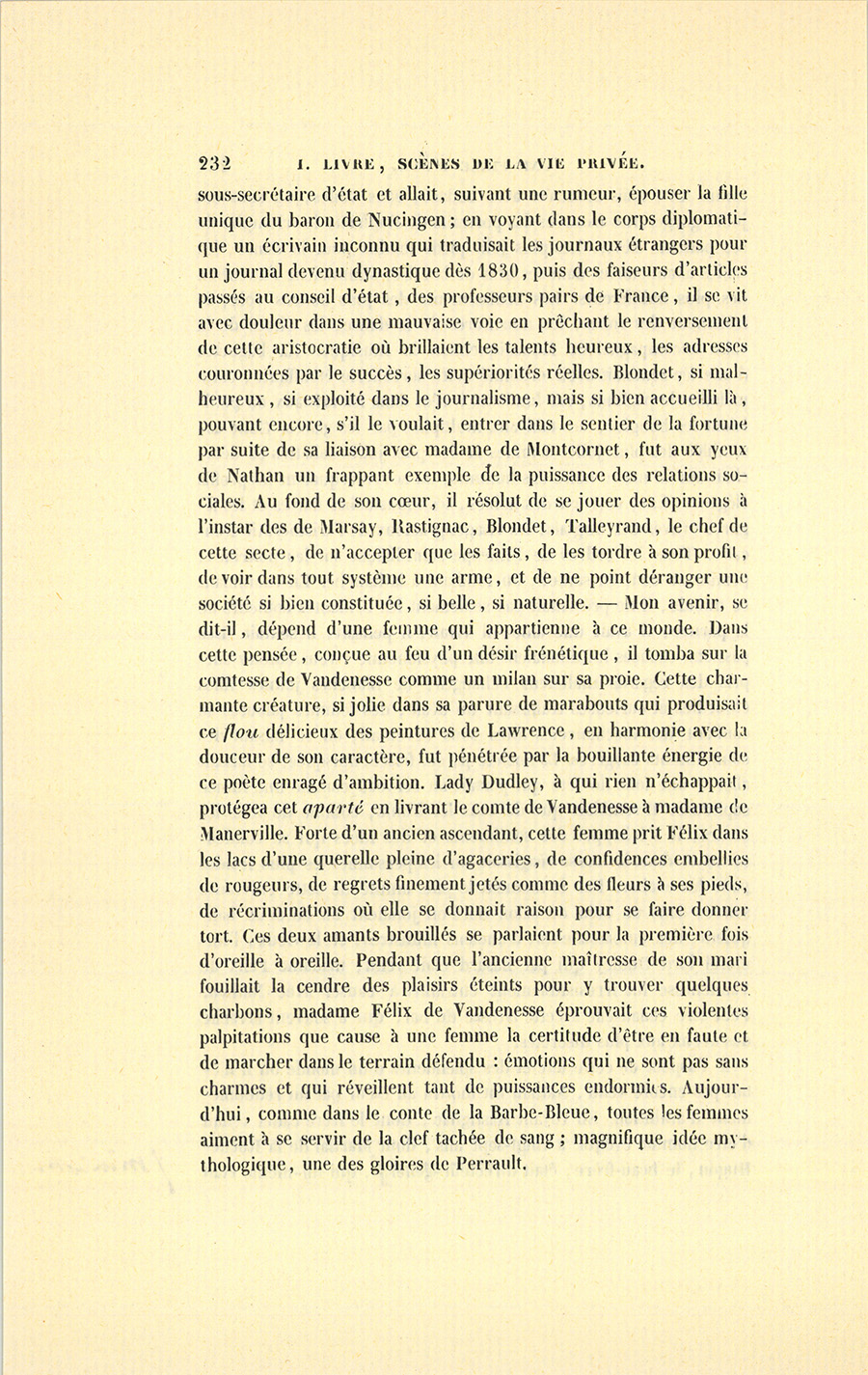 La confidence faite à madame du Tillet par madame Félix de Vandenesse tenait à tant de points de son histoire depuis six ans, qu’elle serait inintelligible, sans le récit succinct des principaux événements de sa vie.