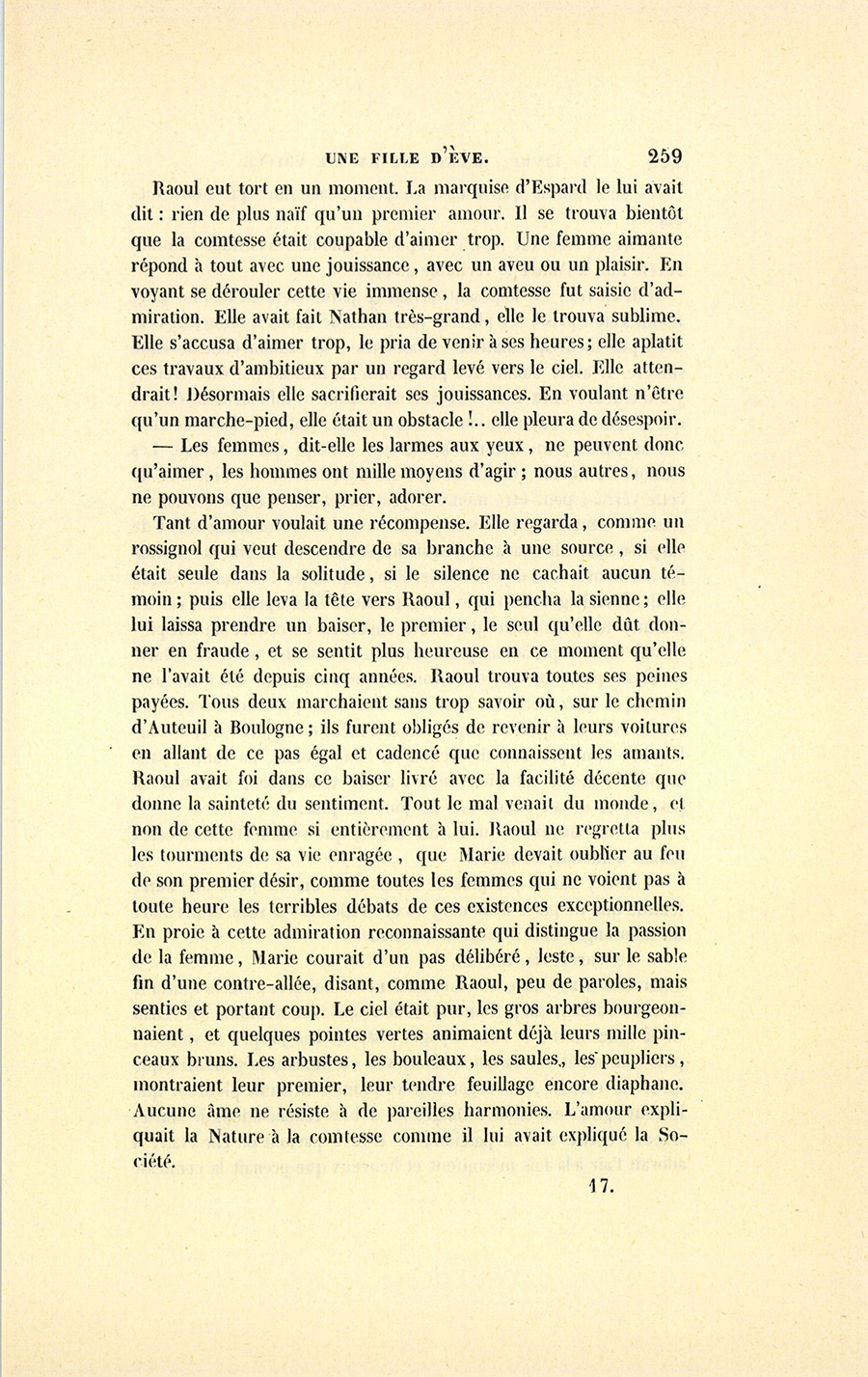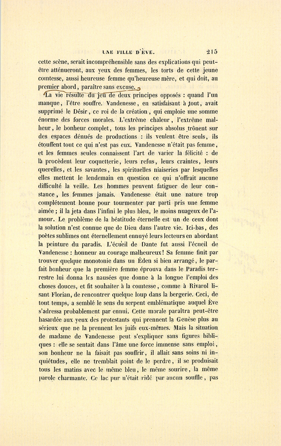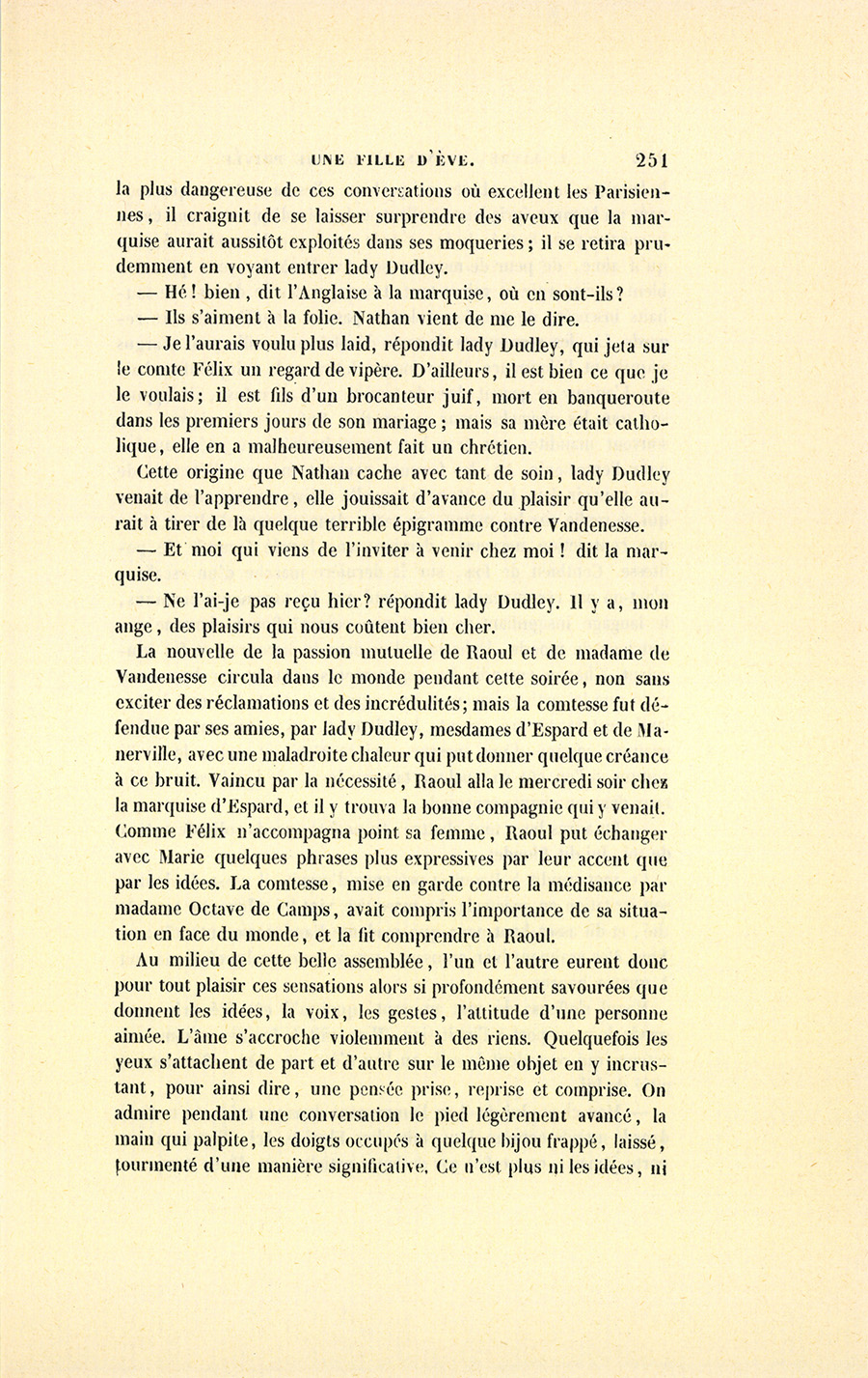 Ainsi, pendant que la pauvre Ève de la rue du Rocher se couchait dans les langes de la honte, s’effrayait du plaisir avec lequel elle avait écouté ce prétendu grand poète, et flottait entre la voix {p. 229} sévère de sa reconnaissance pour Vandenesse et les paroles dorées du serpent, ces trois esprits effrontés marchaient sur les tendres et blanches fleurs de son amour naissant. Ah ! si les femmes connaissaient l’allure cynique que ces hommes si patients, si patelins près d’elles prennent loin d’elles ! combien ils se moquent de ce qu’ils adorent ! Fraîche, gracieuse et pudique créature, comme la plaisanterie bouffonne la déshabillait et l’analysait ! mais aussi quel triomphe ! Plus elle perdait de voiles, plus elle montrait de beautés.