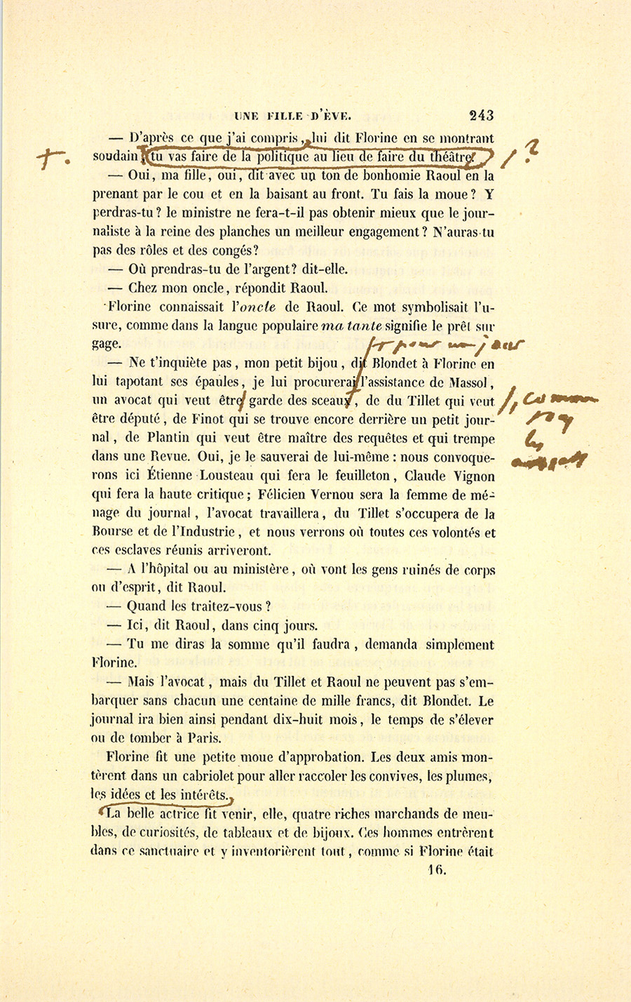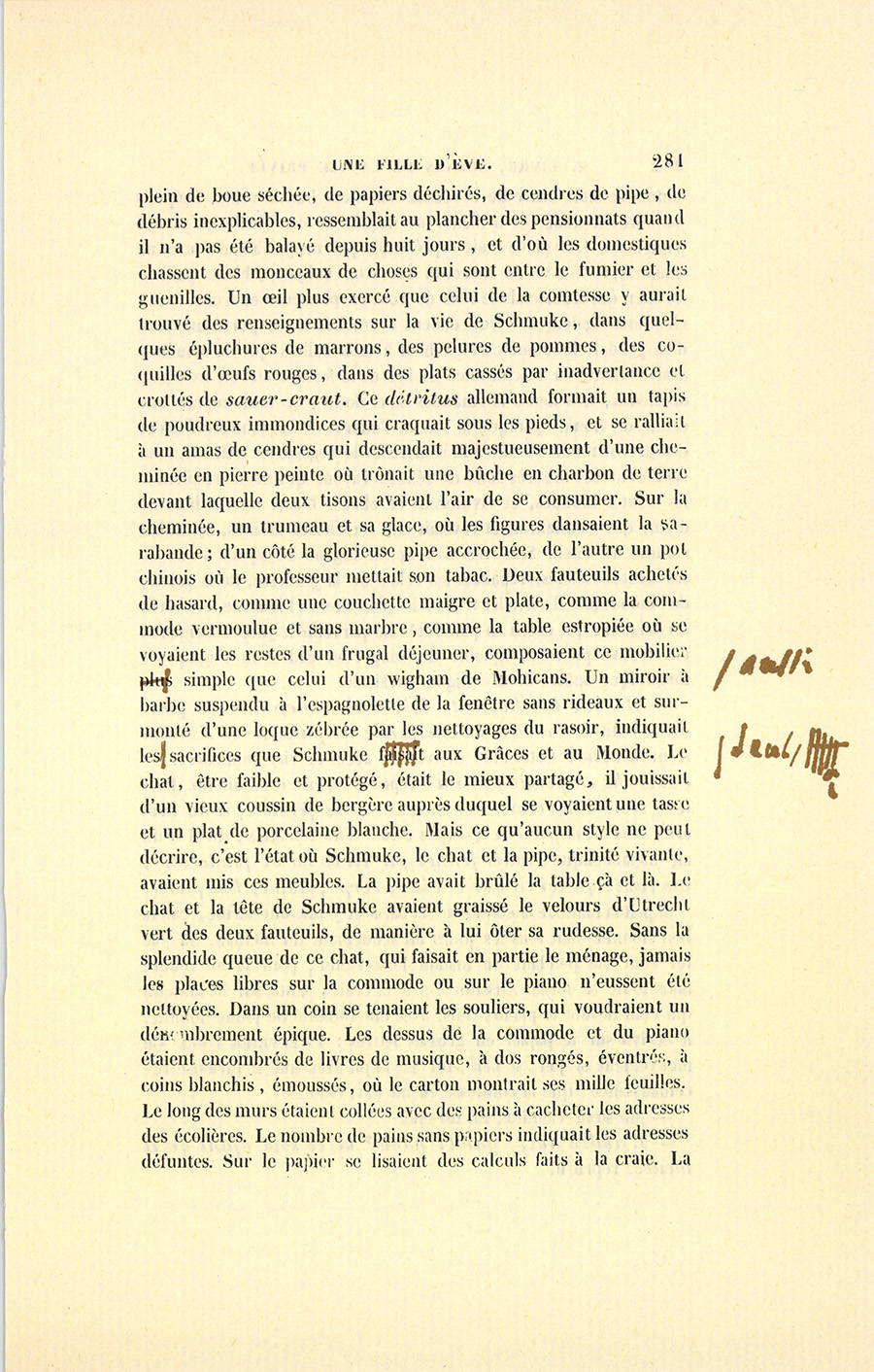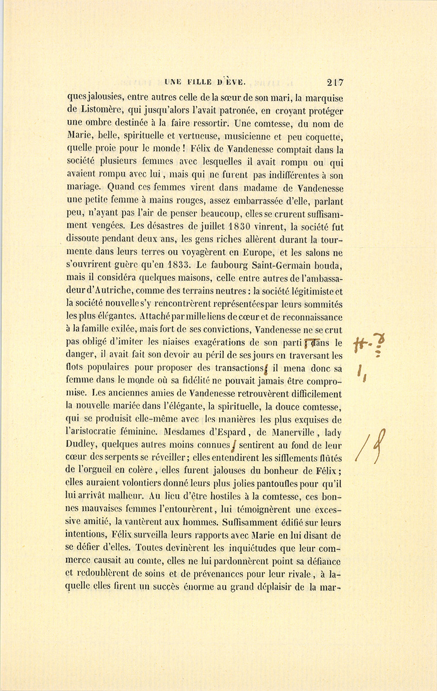 – Sûre, reprit Vandenesse. Reste masquée, je te fais souper avec Nathan et Florine : il sera bien amusant pour une femme de ton rang d’intriguer une actrice après avoir fait caracoler l’esprit d’un homme célèbre autour de secrets si importants ; tu les attelleras l’un et l’autre à la même mystification. Je vais me mettre à la piste des infidélités de Nathan. Si je puis saisir les détails de quelque aventure récente, tu jouiras d’une colère de courtisane, une chose magnifique, celle à laquelle se livrera Florine bouillonnera comme un torrent des Alpes : elle adore Nathan, il est tout pour elle ; elle y tient comme la chair aux os, comme la lionne à ses petits. Je me souviens d’avoir vu dans ma jeunesse une célèbre actrice qui écrivait comme une cuisinière venant redemander ses lettres à un de mes amis ; je n’ai jamais depuis retrouvé ce spectacle, cette fureur {p. 292} tranquille, cette impertinente majesté, cette attitude de sauvage… Souffres-tu, Marie ?