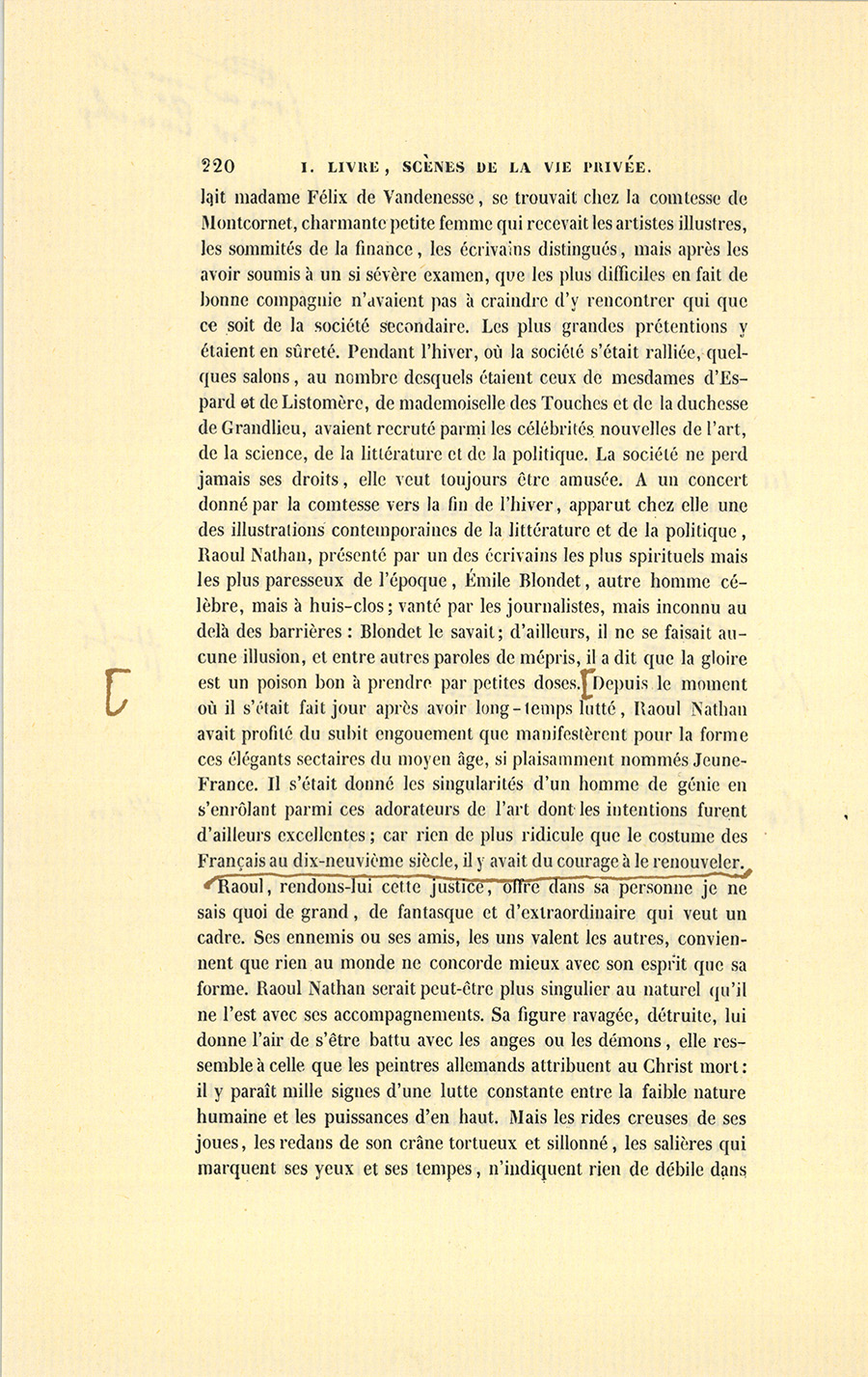 Depuis le moment où il s’était fait jour après avoir long-temps lutté, Raoul Nathan avait profité du subit engouement que manifestèrent pour la forme ces élégants sectaires du moyen âge, si plaisamment nommés Jeune-France. Il s’était donné les singularités d’un homme de génie en s’enrôlant parmi ces adorateurs de l’art dont les intentions furent d’ailleurs excellentes ; car rien de plus ridicule que le costume des Français au dix-neuvième siècle, il y avait du courage à le renouveler. Raoul, rendons-lui cette justice, offre dans sa personne je ne sais quoi de grand, de fantasque et d’extraordinaire qui veut un cadre. Ses ennemis ou ses amis, les uns valent les autres, conviennent que rien au monde ne concorde mieux avec son esprit que sa forme. Raoul Nathan serait peut-être plus singulier au naturel qu’il ne l’est avec ses accompagnements. Sa figure ravagée, détruite, lui donne l’air de s’être battu avec les anges ou les démons, elle ressemble à celle que les peintres allemands attribuent au Christ mort : il y paraît mille signes d’une lutte constante entre la faible nature humaine et les puissances d’en haut. Mais les rides creuses de ses joues, les redans de son crâne tortueux et sillonné, les salières qui marquent ses yeux et ses tempes, n’indiquent rien de débile dans {p. 221} sa constitution. Ses membranes dures, ses os apparents ont une solidité remarquable ; et quoique sa peau, tannée par des excès, s’y colle comme si des feux intérieurs l’avaient desséchée, elle n’en couvre pas moins une formidable charpente. Il est maigre et grand. Sa chevelure longue et toujours en désordre vise à l’effet. Ce Byron mal peigné, mal construit, a des jambes de héron, des genoux engorgés, une cambrure exagérée, des mains cordées de muscles, fermes comme les pattes d’un crabe, à doigts maigres et nerveux. Raoul a des yeux napoléoniens, des yeux bleus dont le regard traverse l’âme ; un nez tourmenté, plein de finesse ; une charmante bouche, embellie par les dents les plus blanches que puisse souhaiter une femme. Il y a du mouvement et du feu dans cette tête, et du génie sur ce front. Raoul appartient au petit nombre d’hommes qui vous frappent au passage, qui dans un salon forment aussitôt un point lumineux où vont tous les regards. Il se fait remarquer par son négligé, s’il est permis d’emprunter à Molière le mot employé par Éliante pour peindre le malpropre sur soi. Ses vêtements semblent toujours avoir été tordus, fripés, recroquevillés exprès pour s’harmonier à sa physionomie. Il tient habituellement l’une de ses mains dans son gilet ouvert, dans une pose que le portrait de monsieur de Chateaubriand par Girodet a rendue célèbre ; mais il la prend moins pour lui ressembler, il ne veut ressembler à personne, que pour déflorer les plis réguliers de sa chemise. Sa cravate est en un moment roulée sous les convulsions de ses mouvements de tête, qu’il a remarquablement brusques et vifs, comme ceux des chevaux de race qui s’impatientent dans leurs harnais et relèvent constamment la tête pour se débarrasser de leur mors ou de leurs gourmettes. Sa barbe longue et pointue n’est ni peignée, ni parfumée, ni brossée, ni lissée comme le sont celles des élégants qui portent la barbe en éventail ou en pointe ; il la laisse comme elle est. Ses cheveux, mêlés entre le collet de son habit et sa cravate, luxuriants sur les épaules, graissent les places qu’ils caressent. Ses mains sèches et filandreuses ignorent les soins de la brosse à ongles et le luxe du citron. Plusieurs feuilletonistes prétendent que les eaux lustrales ne rafraîchissent pas souvent leur peau calcinée. Enfin le terrible Raoul est grotesque. Ses mouvements sont saccadés comme s’ils étaient produits par une mécanique imparfaite. Sa démarche froisse toute idée d’ordre par des zigzags enthousiastes, par des suspensions inattendues qui lui font heurter {p. 222} les bourgeois pacifiques en promenade sur les boulevards de Paris. Sa conversation, pleine d’humeur caustique, d’épigrammes âpres, imite l’allure de son corps : elle quitte subitement le ton de la vengeance et devient suave, poétique, consolante, douce, hors de propos ; elle a des silences inexplicables, des soubresauts d’esprit qui fatiguent parfois. Il apporte dans le monde une gaucherie hardie, un dédain des conventions, un air de critique pour tout ce qu’on y respecte, qui le met mal avec les petits esprits comme avec ceux qui s’efforcent de conserver les doctrines de l’ancienne politesse ; mais c’est quelque chose d’original comme les créations chinoises et que les femmes ne haïssent pas. D’ailleurs, pour elles, il se montre souvent d’une amabilité recherchée, il semble se complaire à faire oublier ses formes bizarres, à remporter sur les antipathies une victoire qui flatte sa vanité, son amour-propre ou son orgueil. – Pourquoi êtes-vous comme cela ? lui dit un jour la marquise de Vandenesse. – Les perles ne sont-elles pas dans des écailles ? répondit-il fastueusement. À un autre qui lui adressait la même question, il répondit : – Si j’étais bien pour tout le monde, comment pourrais-je paraître mieux à une personne choisie entre toutes ? Raoul Nathan porte dans sa vie intellectuelle le désordre qu’il prend pour enseigne. Son annonce n’est pas menteuse : son talent ressemble à celui de ces pauvres filles qui se présentent dans les maisons bourgeoises pour tout faire : il fut d’abord critique, et grand critique ; mais il trouva de la duperie à ce métier. Ses articles valaient des livres, disait-il. Les revenus du théâtre l’avaient séduit ; mais incapable du travail lent et soutenu que veut la mise en scène, il avait été obligé de s’associer à un vaudevilliste, à du Bruel, qui mettait en œuvre ses idées et les avait toujours réduites en petites pièces productives,