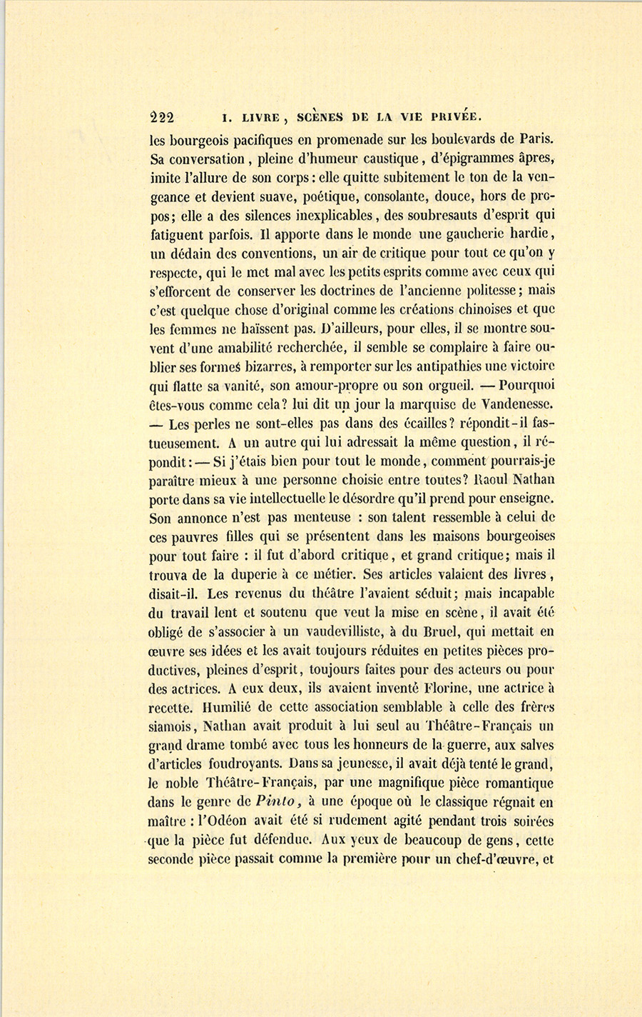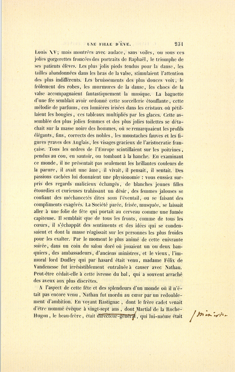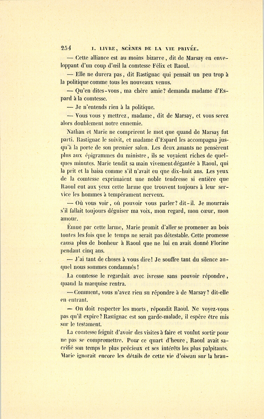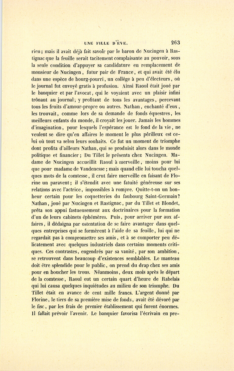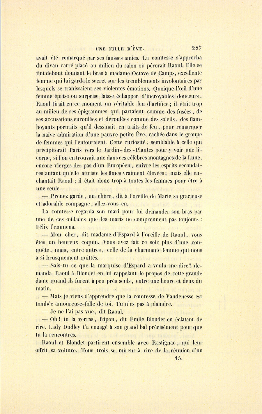 Raoul et Blondet partirent ensemble avec Rastignac, qui leur offrit sa voiture. Tous trois se mirent à rire de la réunion d’un {p. 228} sous-secrétaire-d’état éclectique, d’un républicain féroce et d’un athée politique.