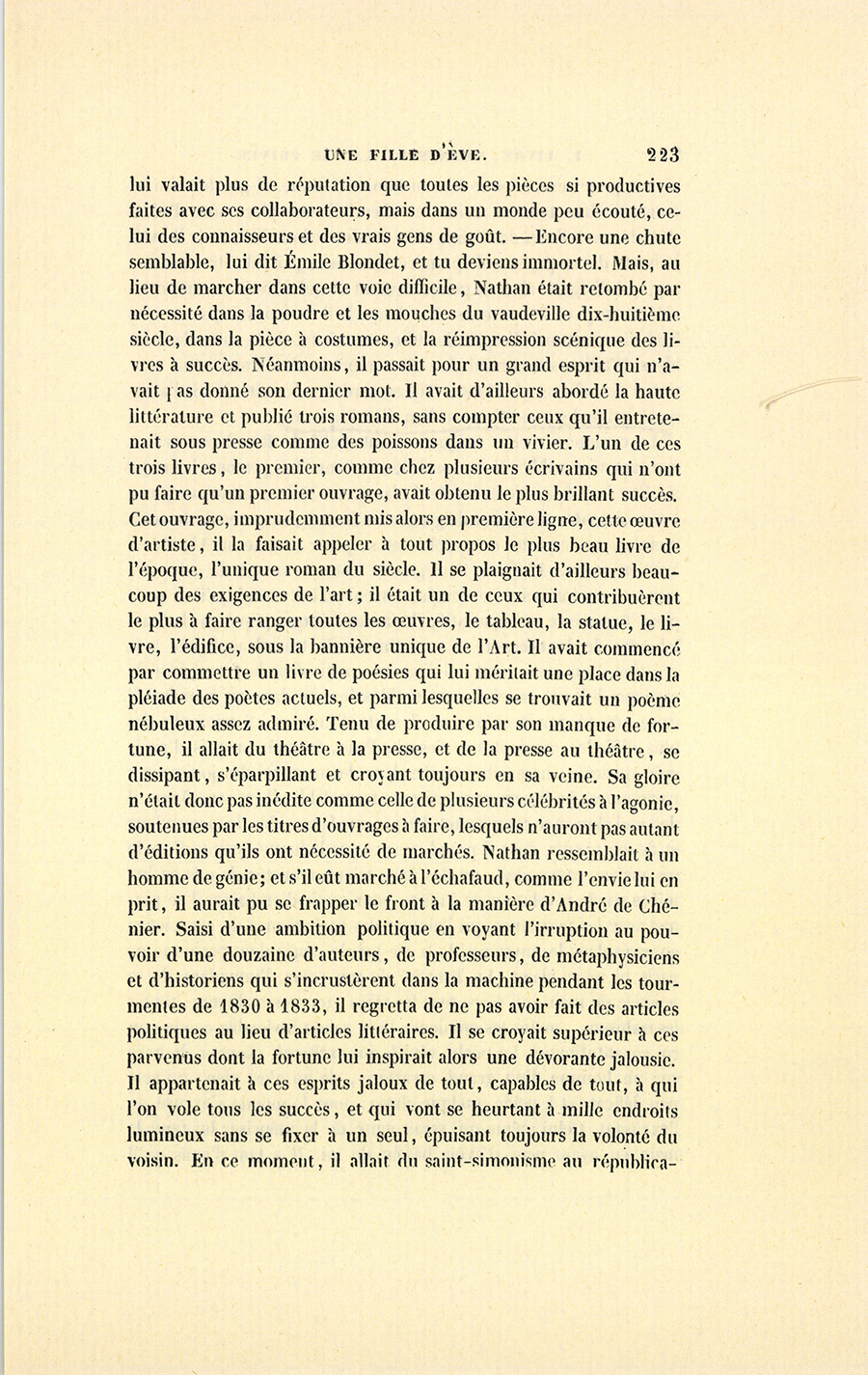 À cette époque, une foule de journaux créés pour chaque nuance accusaient l’effroyable pêle-mêle politique appelé gâchis par un soldat. Blondet, l’esprit le plus judicieux de l’époque, mais {p. 242} judicieux pour autrui, jamais pour lui, semblable à ces avocats qui font mal leurs propres affaires, était sublime dans ces discussions privées. Il conseilla donc à Nathan de ne pas apostasier brusquement.
