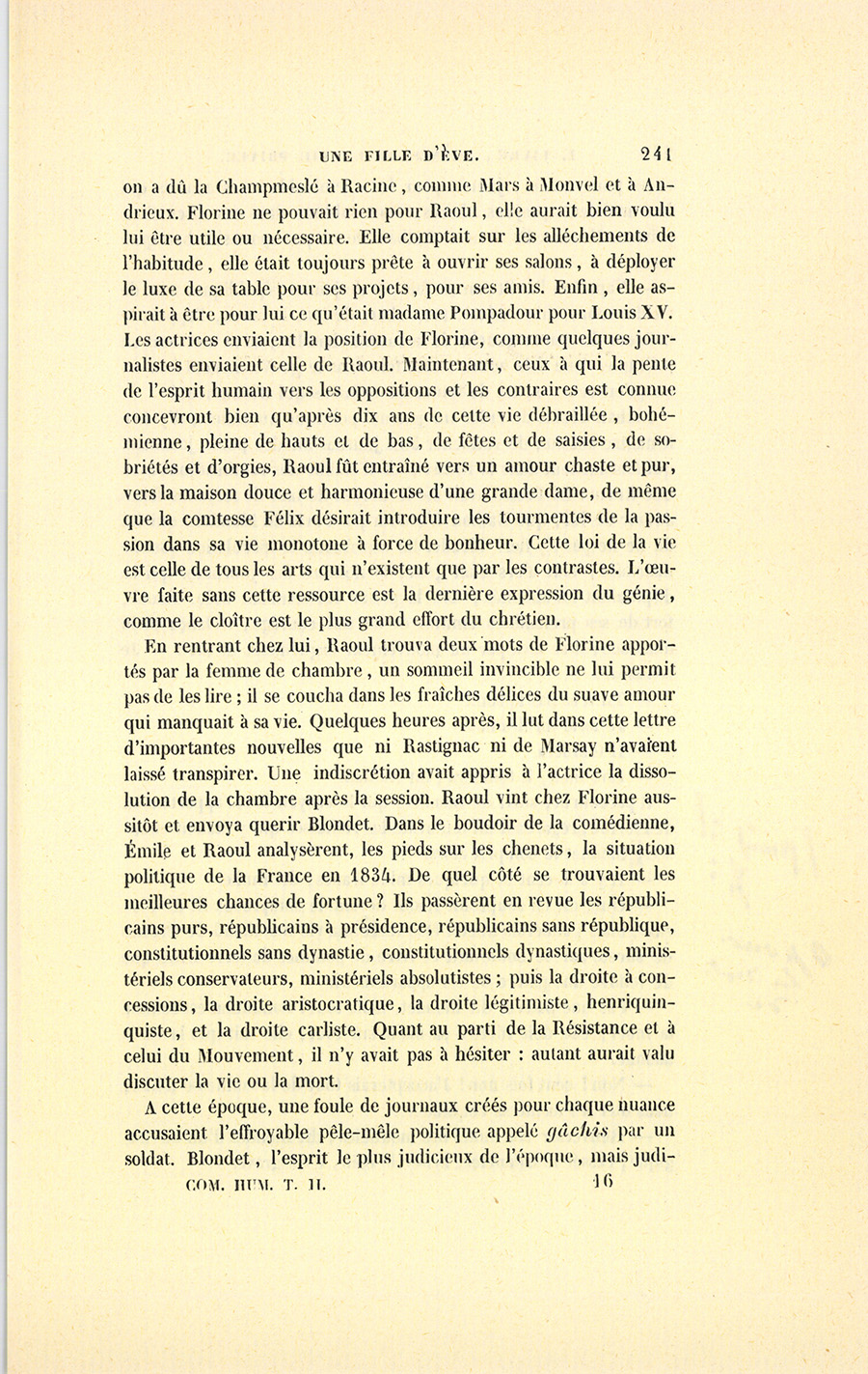 En rentrant chez lui, Raoul trouva deux mots de Florine apportés par la femme de chambre, un sommeil invincible ne lui permit pas de les lire ; il se coucha dans les fraîches délices du suave amour qui manquait à sa vie. Quelques heures après, il lut dans cette lettre d’importantes nouvelles que ni Rastignac ni de Marsay n’avaient laissé transpirer. Une indiscrétion avait appris à l’actrice la dissolution de la chambre après la session. Raoul vint chez Florine aussitôt et envoya querir Blondet. Dans le boudoir de la comédienne, Émile et Raoul analysèrent, les pieds sur les chenets, la situation politique de la France en 1834. De quel côté se trouvaient les meilleures chances de fortune ? Ils passèrent en revue les républicains purs, républicains à présidence, républicains sans république, constitutionnels sans dynastie, constitutionnels dynastiques, ministériels conservateurs, ministériels absolutistes ; puis la droite à concessions, la droite aristocratique, la droite légitimiste, henriquinquiste, et la droite carliste. Quant au parti de la Résistance et à celui du Mouvement, il n’y avait pas à hésiter : autant aurait valu discuter la vie ou la mort.