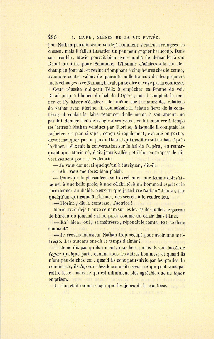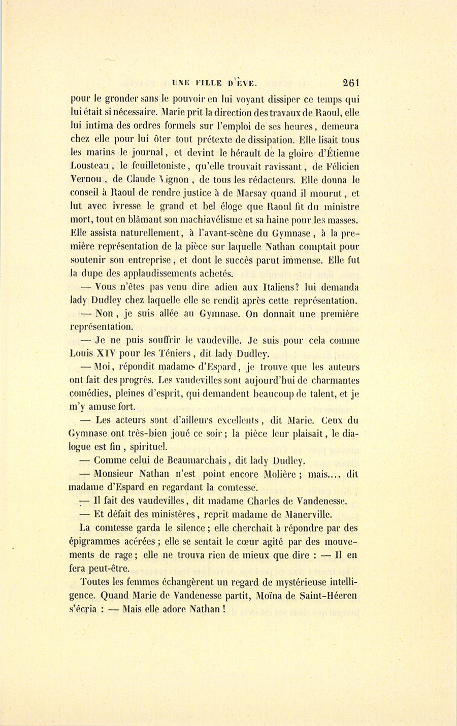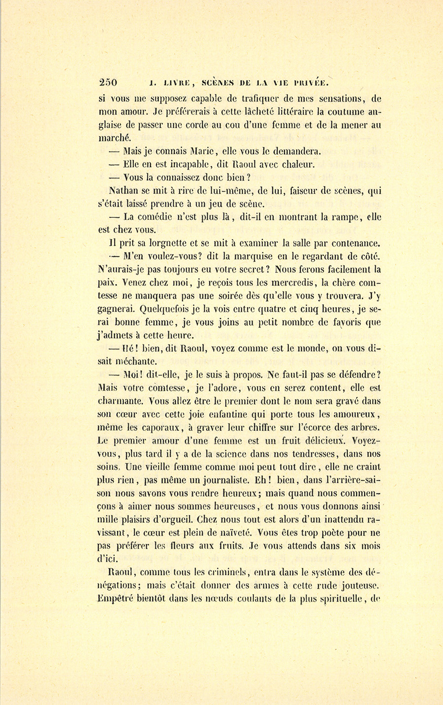 Le lendemain, vers minuit, au bal de l’Opéra, Nathan se promenait dans le foyer en donnant le bras à un masque d’un air assez marital. Après deux ou trois tours, deux femmes masquées les abordèrent.