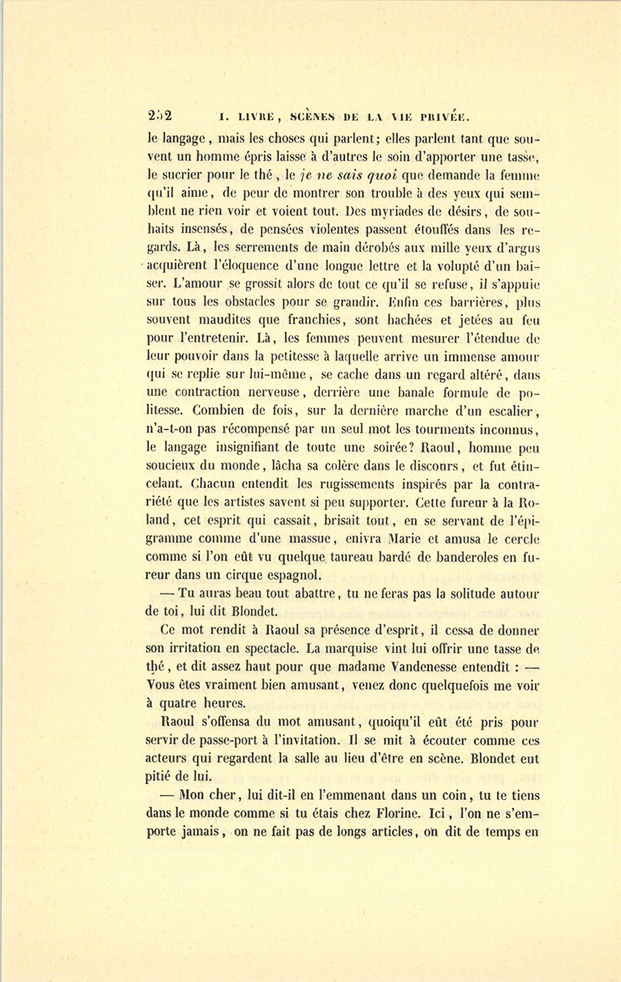 « – On vivotte avec son mari, ma chère, on ne vit qu’avec son amant, lui disait sa belle-sœur, la marquise de Vandenesse. – Le mariage, mon enfant, est notre purgatoire ; l’amour est le paradis, disait lady Dudley. – Ne la croyez pas, s’écriait mademoiselle des Touches, c’est l’enfer. – Mais c’est un enfer où l’on aime, faisait observer la marquise de Rochefide. On a souvent plus de plaisir dans la souffrance que dans le bonheur, voyez les martyrs ? – Avec un mari, petite niaise, nous vivons pour ainsi dire de notre vie ; mais aimer, c’est vivre de la vie d’un autre, lui disait la marquise d’Espard. – Un amant, c’est le fruit défendu, mot qui pour moi résume tout ! » disait en riant la jolie Moïna de Saint-Héréen. Quand elle n’allait pas à des raoûts diplomatiques ou au bal chez quelques riches étrangers, comme lady Dudley ou la princesse Galathionne, la comtesse allait presque tous les soirs dans le monde, après les Italiens ou l’Opéra, soit chez la marquise d’Espard, soit chez madame de Listomère, mademoiselle des Touches, la comtesse de Montcornet ou la vicomtesse de Grandlieu, les seules maisons aristocratiques ouvertes ; et jamais elle n’en sortait sans que de mauvaises graines n’eussent été semées dans son cœur. On lui parlait de compléter sa vie, un mot à la mode dans ce temps-là ; d’être comprise, autre mot auquel les femmes donnent d’étranges significations. Elle revenait chez elle inquiète, émue, curieuse, pensive. Elle trouvait je ne sais quoi de moins dans sa vie, mais elle n’allait pas jusqu’à la voir déserte.