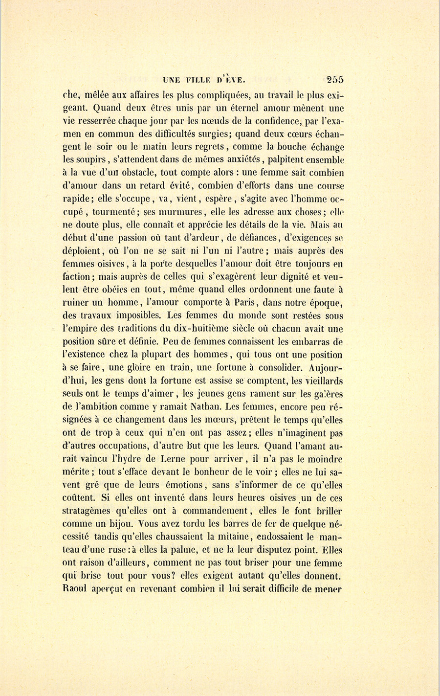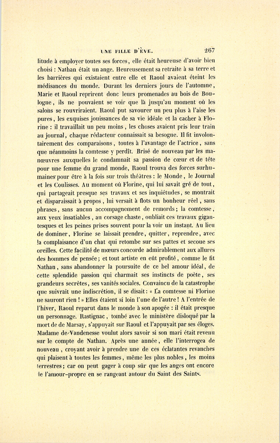 – Mes amis, leur dit-il, vous connaissez mes relations avec Florine, vous savez ma vie, vous ne serez pas étonnés de m’entendre vous avouer que j’ignore absolument la couleur de l’amour d’une comtesse. J’ai souvent été très-humilié en pensant que je ne pouvais pas me donner une Béatrix, une Laure, autrement qu’en poésie ! Une femme noble et pure est comme une conscience sans tache, qui nous représente à nous-mêmes sous une belle forme. Ailleurs, nous pouvons nous souiller ; mais là, nous restons grands, fiers, immaculés. Ailleurs nous menons une vie enragée, mais là se respire le calme, la fraîcheur, la verdure de l’oasis.
