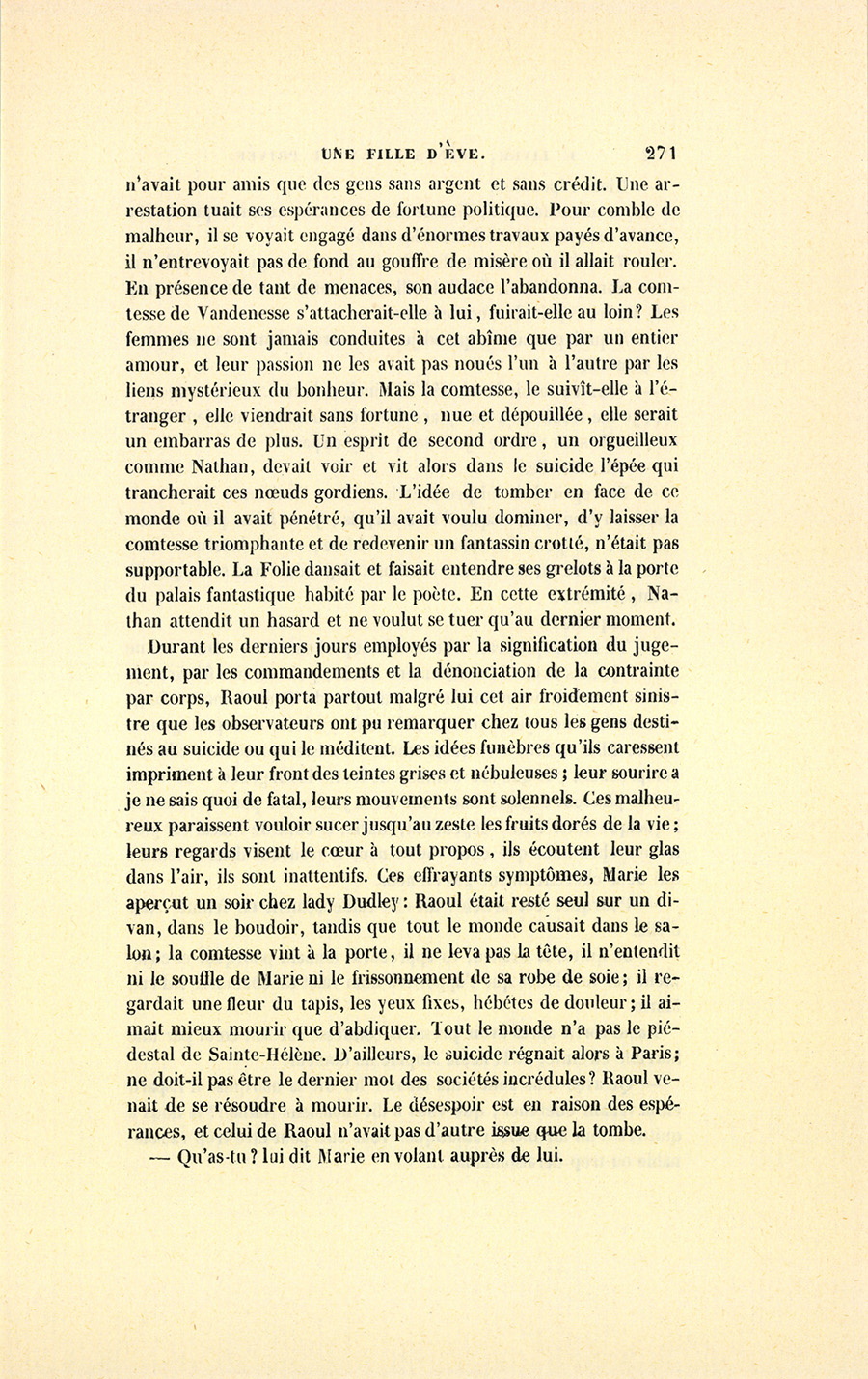 – Va demander à Nathan, qui maintenant cherche la maîtresse de qui je parle, où il a passé la nuit il y a trois jours ! Il s’est asphyxié, ma petite, à ton insu, faute d’argent. Voilà comment tu es {p. 295} au fait des affaires d’un homme que tu dis aimer, et tu le laisses sans le sou, et il se tue ; ou plutôt il ne se tue pas, il se manque. Un suicide manqué, c’est aussi ridicule qu’un duel sans égratignure.