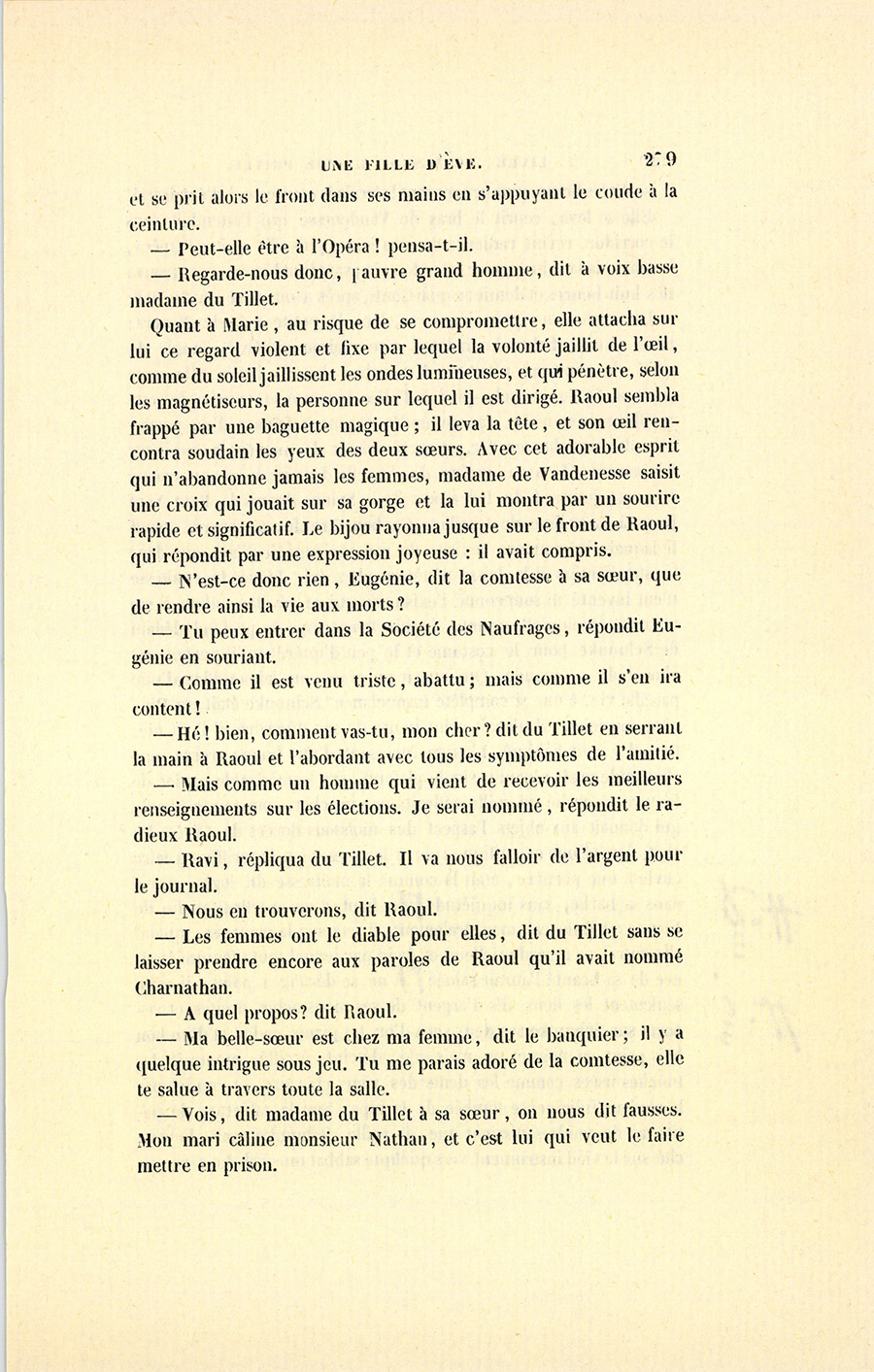 {p. 291} – Voulez-vous de lui pour victime ? vous l’épouvanterez, dit le comte en continuant sans faire attention au visage de sa femme. Je vous mettrai à même de lui prouver qu’il est joué comme un enfant par votre beau-frère du Tillet. Ce misérable veut le faire mettre en prison, afin de le rendre incapable de se porter son concurrent dans le collége électoral où Nucingen a été nommé. Je sais par un ami de Florine la somme produite par la vente de son mobilier, qu’elle lui a donnée pour fonder son journal, je sais ce qu’elle lui a envoyé sur la récolte qu’elle est allée faire cette année dans les départements et en Belgique ; argent qui profite en définitif à Du Tillet, à Nucingen, à Massol. Tous trois, par avance, ils ont vendu le journal au ministère, tant ils sont sûrs d’évincer ce grand homme.