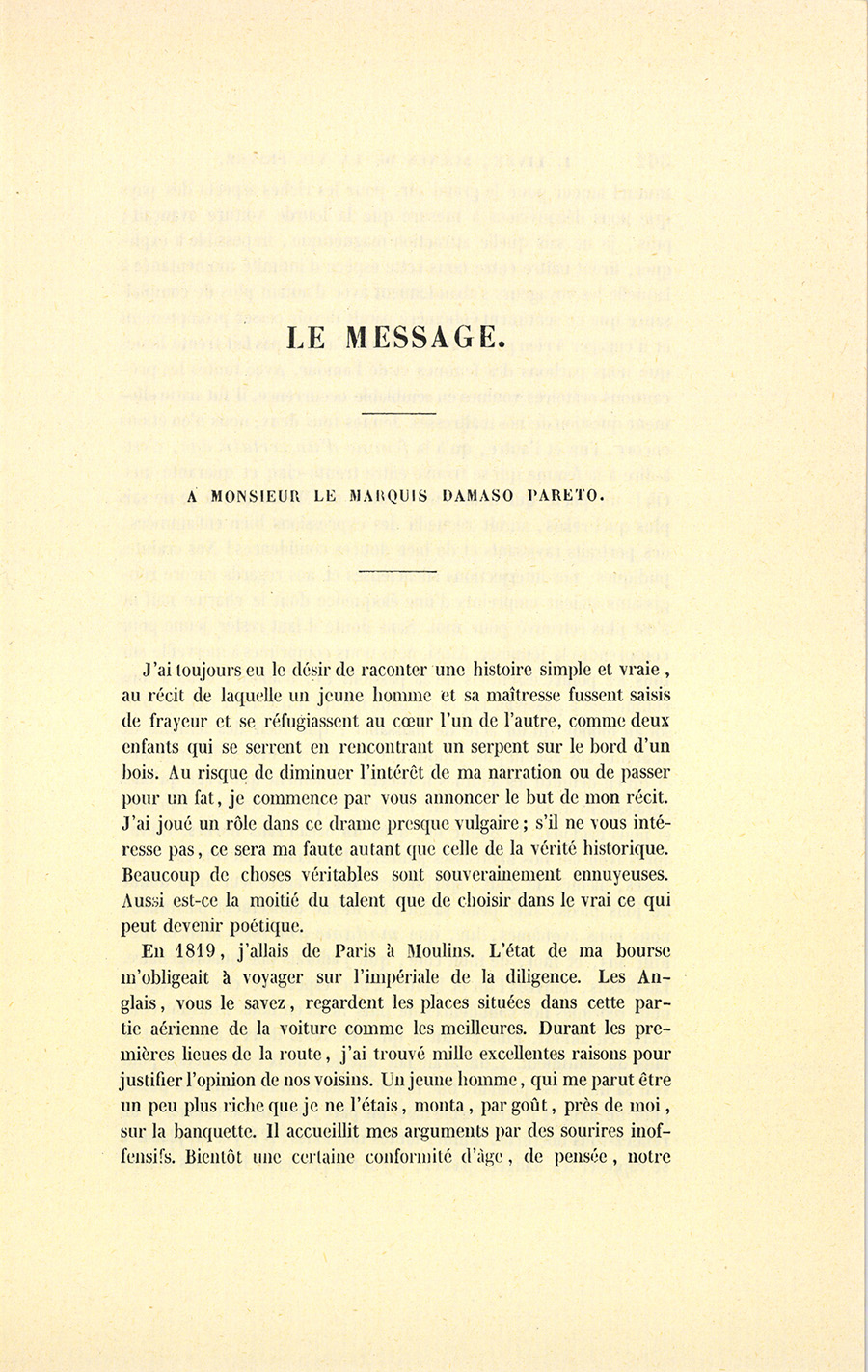 J’ai toujours eu le désir de raconter une histoire simple et vraie, au récit de laquelle un jeune homme et sa maîtresse fussent saisis de frayeur et se réfugiassent au cœur l’un de l’autre, comme deux enfants qui se serrent en rencontrant un serpent sur le bord d’un bois. Au risque de diminuer l’intérêt de ma narration ou de passer pour un fat, je commence par vous annoncer le but de mon récit. J’ai joué un rôle dans ce drame presque vulgaire ; s’il ne vous intéresse pas, ce sera ma faute autant que celle de la vérité historique. Beaucoup de choses véritables sont souverainement ennuyeuses. Aussi est-ce la moitié du talent que de choisir dans le vrai ce qui peut devenir poétique.