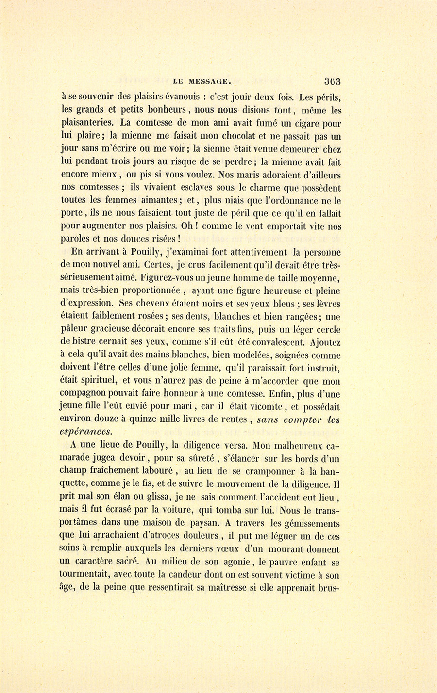 En arrivant à Pouilly, j’examinai fort attentivement la personne de mon nouvel ami. Certes, je crus facilement qu’il devait être très-sérieusement aimé. Figurez-vous un jeune homme de taille moyenne, mais très-bien proportionnée, ayant une figure heureuse et pleine d’expression. Ses cheveux étaient noirs et ses yeux bleus ; ses lèvres étaient faiblement rosées ; ses dents, blanches et bien rangées ; une pâleur gracieuse décorait encore ses traits fins, puis un léger cercle de bistre cernait ses yeux, comme s’il eût été convalescent. Ajoutez à cela qu’il avait des mains blanches, bien modelées, soignées comme doivent l’être celles d’une jolie femme, qu’il paraissait fort instruit, était spirituel, et vous n’aurez pas de peine à m’accorder que mon compagnon pouvait faire honneur à une comtesse. Enfin, plus d’une jeune fille l’eût envié pour mari, car il était vicomte, et possédait environ douze à quinze mille livres de rentes, sans compter les espérances.