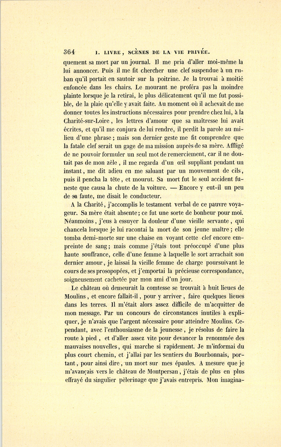 Le château où demeurait la comtesse se trouvait à huit lieues de Moulins, et encore fallait-il, pour y arriver, faire quelques lieues dans les terres. Il m’était alors assez difficile de m’acquitter de mon message. Par un concours de circonstances inutiles à expliquer, je n’avais que l’argent nécessaire pour atteindre Moulins. Cependant, avec l’enthousiasme de la jeunesse, je résolus de faire la route à pied, et d’aller assez vite pour devancer la renommée des mauvaises nouvelles, qui marche si rapidement. Je m’informai du plus court chemin, et j’allai par les sentiers du Bourbonnais, portant, pour ainsi dire, un mort sur mes épaules. À mesure que je m’avançais vers le château de Montpersan, j’étais de plus en plus effrayé du singulier pèlerinage que j’avais entrepris. Mon {p. 365} imagination inventait mille fantaisies romanesques. Je me représentais toutes les situations dans lesquelles je pouvais rencontrer madame la comtesse de Montpersan, ou, pour obéir à la poétique des romans, la Juliette tant aimée du jeune voyageur. Je forgeais des réponses spirituelles à des questions que je supposais devoir m’être faites. C’était à chaque détour de bois, dans chaque chemin creux, une répétition de la scène de Sosie et de sa lanterne, à laquelle il rend compte de la bataille. À la honte de mon cœur, je ne pensai d’abord qu’à mon maintien, à mon esprit, à l’habileté que je voulais déployer ; mais lorsque je fus dans le pays, une réflexion sinistre me traversa l’âme comme un coup de foudre qui sillonne et déchire un voile de nuées grises. Quelle terrible nouvelle pour une femme qui, tout occupée en ce moment de son jeune ami, espérait d’heure en heure des joies sans nom, après s’être donné mille peines pour l’amener légalement chez elle ! Enfin, il y avait encore une charité cruelle à être le messager de la mort. Aussi hâtais-je le pas en me crottant et m’embourbant dans les chemins du Bourbonnais. J’atteignis bientôt une grande avenue de châtaigniers, au bout de laquelle les masses du château de Montpersan se dessinèrent dans le ciel comme des nuages bruns à contours clairs et fantastiques. En arrivant à la porte du château, je la trouvai tout ouverte. Cette circonstance imprévue détruisait mes plans et mes suppositions. Néanmoins j’entrai hardiment, et j’eus aussitôt à mes côtés deux chiens qui aboyèrent en vrais chiens de campagne. À ce bruit, une grosse servante accourut, et quand je lui eus dit que je voulais parler à madame la comtesse, elle me montra, par un geste de main, les massifs d’un parc à l’anglaise qui serpentait autour du château, et me répondit : – Madame est par là…