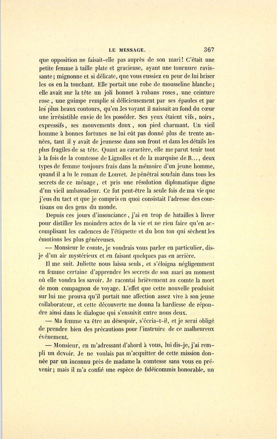 – Monsieur, en m’adressant d’abord à vous, lui dis-je, j’ai rempli un devoir. Je ne voulais pas m’acquitter de cette mission donnée par un inconnu près de madame la comtesse sans vous en prévenir ; mais il m’a confié une espèce de fidéicommis honorable, un {p. 368} secret dont je n’ai pas le pouvoir de disposer. D’après la haute idée qu’il m’a donnée de votre caractère, j’ai pensé que vous ne vous opposeriez pas à ce que j’accomplisse ses derniers vœux. Madame la comtesse sera libre de rompre le silence qui m’est imposé.