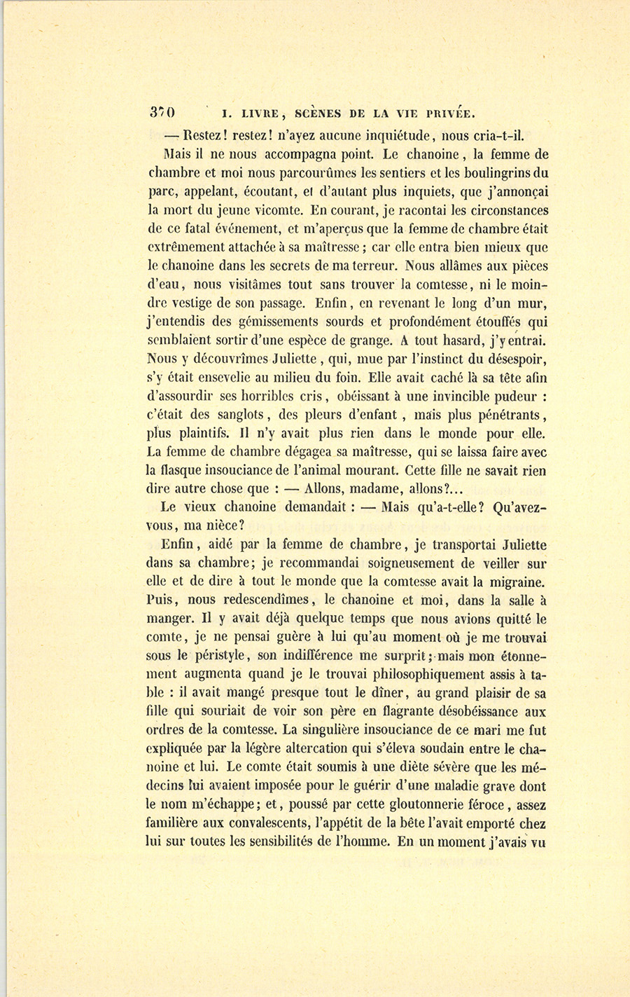 Enfin, aidé par la femme de chambre, je transportai Juliette dans sa chambre ; je recommandai soigneusement de veiller sur elle et de dire à tout le monde que la comtesse avait la migraine. Puis, nous redescendîmes, le chanoine et moi, dans la salle à manger. Il y avait déjà quelque temps que nous avions quitté le comte, je ne pensai guère à lui qu’au moment où je me trouvai sous le péristyle, son indifférence me surprit ; mais mon étonnement augmenta quand je le trouvai philosophiquement assis à table : il avait mangé presque tout le dîner, au grand plaisir de sa fille qui souriait de voir son père en flagrante désobéissance aux ordres de la comtesse. La singulière insouciance de ce mari me fut expliquée par la légère altercation qui s’éleva soudain entre le chanoine et lui. Le comte était soumis à une diète sévère que les médecins lui avaient imposée pour le guérir d’une maladie grave dont le nom m’échappe ; et, poussé par cette gloutonnerie féroce, assez familière aux convalescents, l’appétit de la bête l’avait emporté chez lui sur toutes les sensibilités de l’homme. En un moment j’avais vu {p. 371} la nature dans toute sa vérité, sous deux aspects bien différents qui mettaient le comique au sein même de la plus horrible douleur. La soirée fut triste. J’étais fatigué. Le chanoine employait toute son intelligence à deviner la cause des pleurs de sa nièce. Le mari digérait silencieusement, après s’être contenté d’une assez vague explication que la comtesse lui fit donner de son malaise par sa femme de chambre, et qui fut, je crois, empruntée aux indispositions naturelles à la femme. Nous nous couchâmes tous de bonne heure. En passant devant la chambre de la comtesse pour aller au gîte où me conduisit un valet, je demandai timidement de ses nouvelles. En reconnaissant ma voix, elle me fit entrer, voulut me parler ; mais, ne pouvant rien articuler, elle inclina la tête, et je me retirai. Malgré les émotions cruelles que je venais de partager avec la bonne foi d’un jeune homme, je dormis accablé par la fatigue d’une marche forcée. À une heure avancée de la nuit, je fus réveillé par les aigres bruissements que produisirent les anneaux de mes rideaux violemment tirés sur leurs tringles de fer. Je vis la comtesse assise sur le pied de mon lit. Son visage recevait toute la lumière d’une lampe posée sur ma table.
