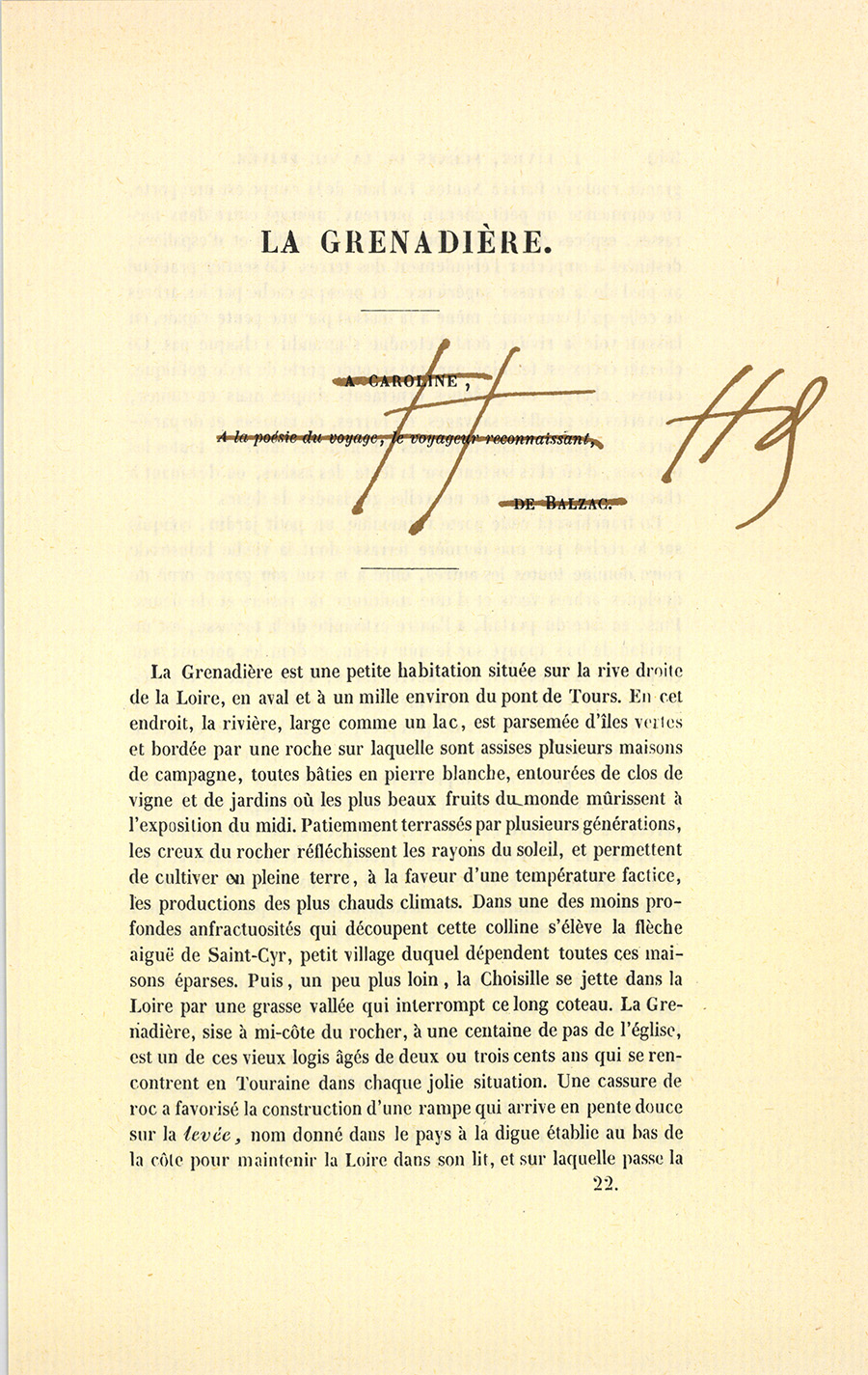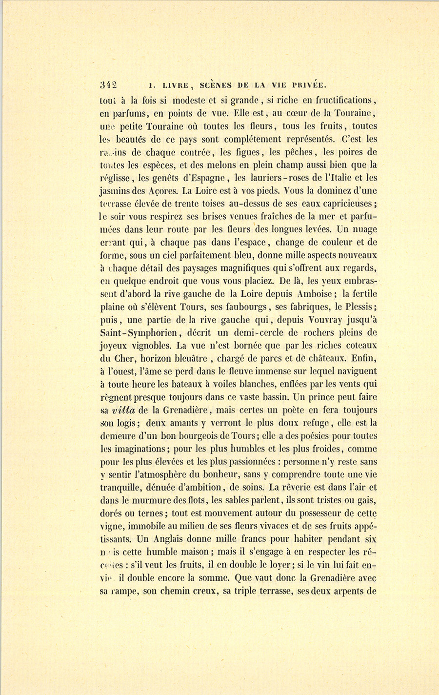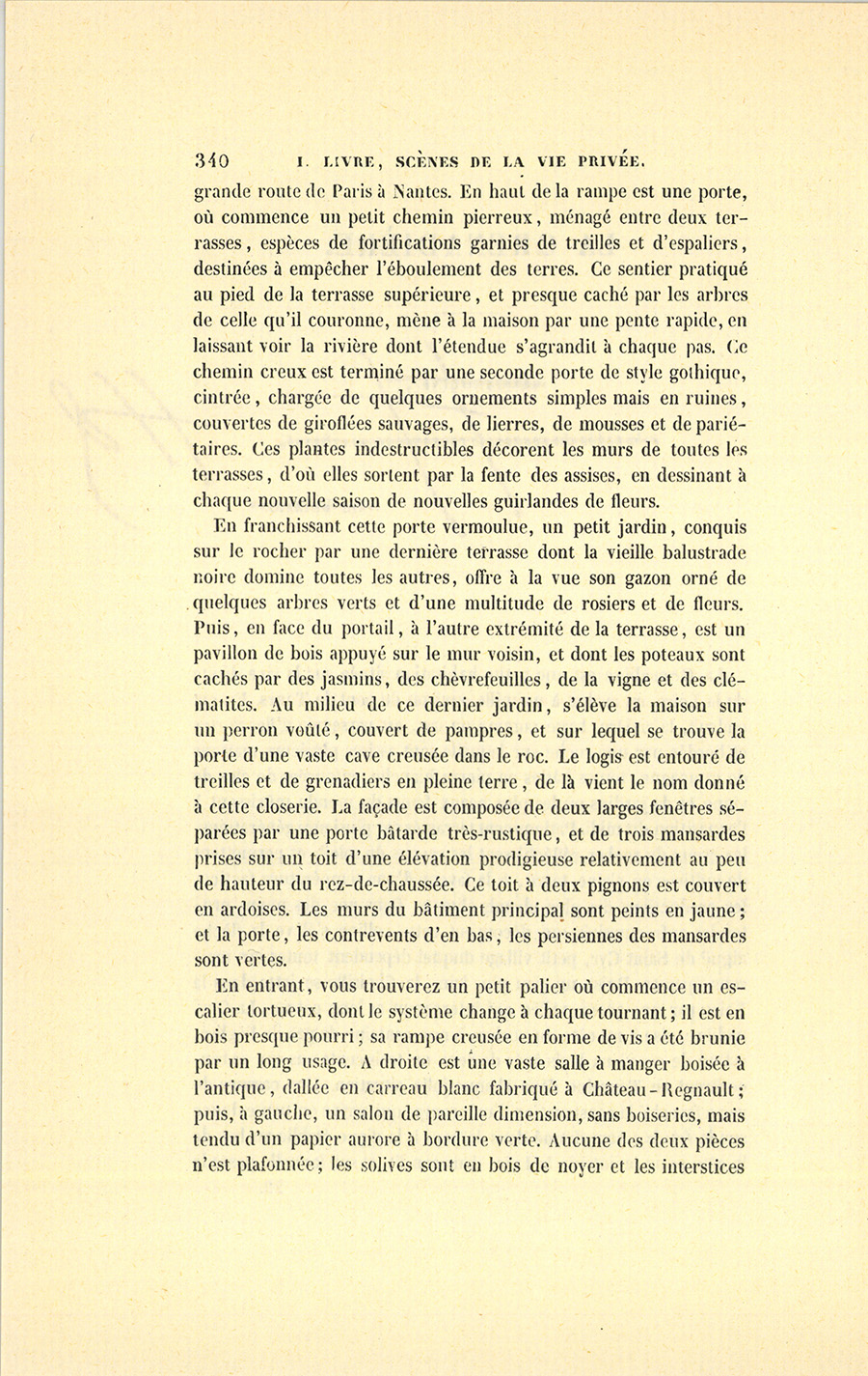 La Grenadière est une petite habitation située sur la rive droite de la Loire, en aval et à un mille environ du pont de Tours. En cet endroit, la rivière, large comme un lac, est parsemée d’îles vertes et bordée par une roche sur laquelle sont assises plusieurs maisons de campagne, toutes bâties en pierre blanche, entourées de clos de vigne et de jardins où les plus beaux fruits du monde mûrissent à l’exposition du midi. Patiemment terrassés par plusieurs générations, les creux du rocher réfléchissent les rayons du soleil, et permettent de cultiver en pleine terre, à la faveur d’une température factice, les productions des plus chauds climats. Dans une des moins profondes anfractuosités qui découpent cette colline s’élève la flèche aiguë de Saint-Cyr, petit village duquel dépendent toutes ces maisons éparses. Puis, un peu plus loin, la Choisille se jette dans la Loire par une grasse vallée qui interrompt ce long coteau. La Grenadière, sise à mi-côte du rocher, à une centaine de pas de l’église, est un de ces vieux logis âgés de deux ou trois cents ans qui se rencontrent en Touraine dans chaque jolie situation. Une cassure de roc a favorisé la construction d’une rampe qui arrive en pente douce sur la levée, nom donné dans le pays à la digue établie au bas de la côte pour maintenir la Loire dans son lit, et sur laquelle passe la {p. 340} grande route de Paris à Nantes. En haut de la rampe est une porte, où commence un petit chemin pierreux, ménagé entre deux terrasses, espèces de fortifications garnies de treilles et d’espaliers, destinées à empêcher l’éboulement des terres. Ce sentier pratiqué au pied de la terrasse supérieure, et presque caché par les arbres de celle qu’il couronne, mène à la maison par une pente rapide, en laissant voir la rivière dont l’étendue s’agrandit à chaque pas. Ce chemin creux est terminé par une seconde porte de style gothique, cintrée, chargée de quelques ornements simples mais en ruines, couvertes de giroflées sauvages, de lierres, de mousses et de pariétaires. Ces plantes indestructibles décorent les murs de toutes les terrasses, d’où elles sortent par la fente des assises, en dessinant à chaque nouvelle saison de nouvelles guirlandes de fleurs.