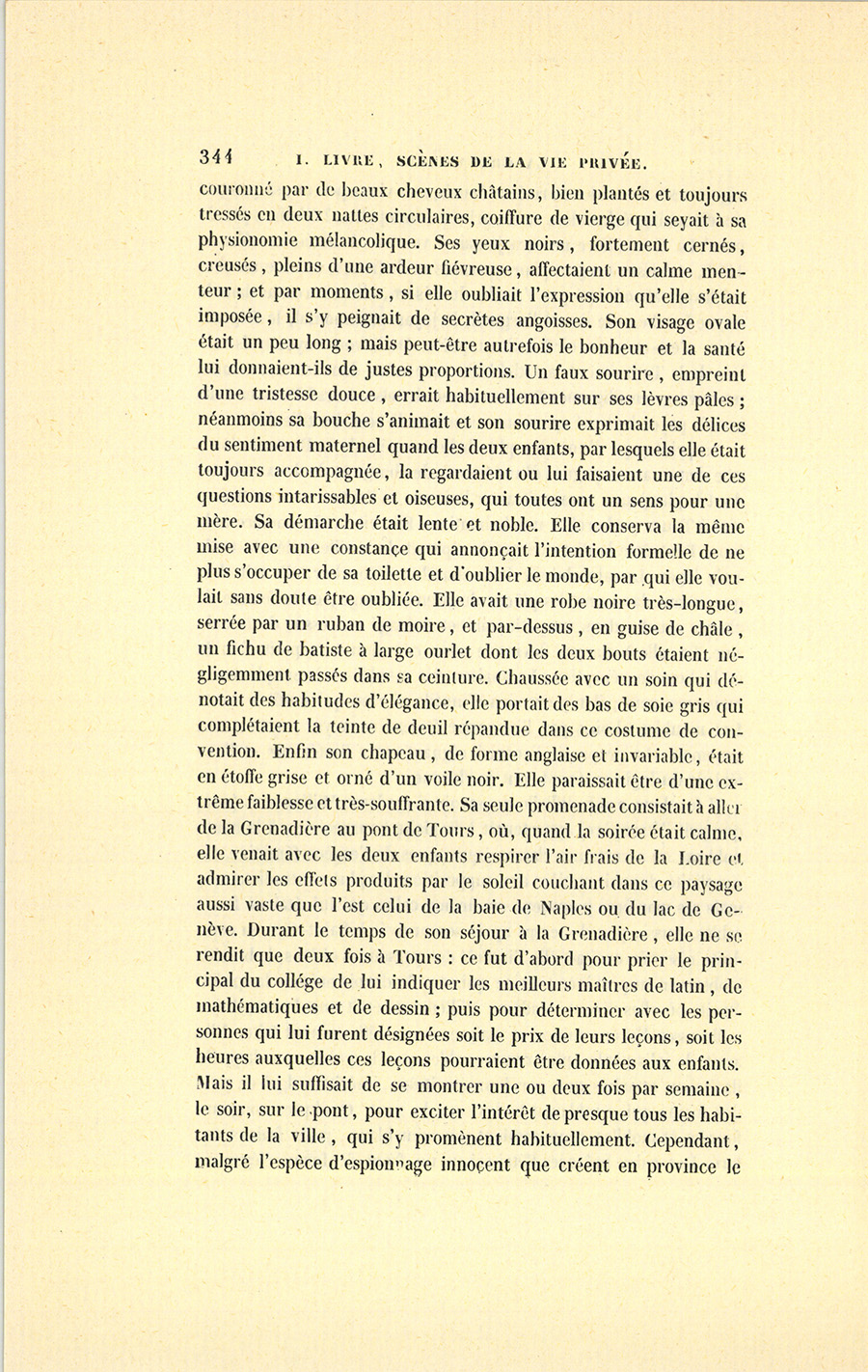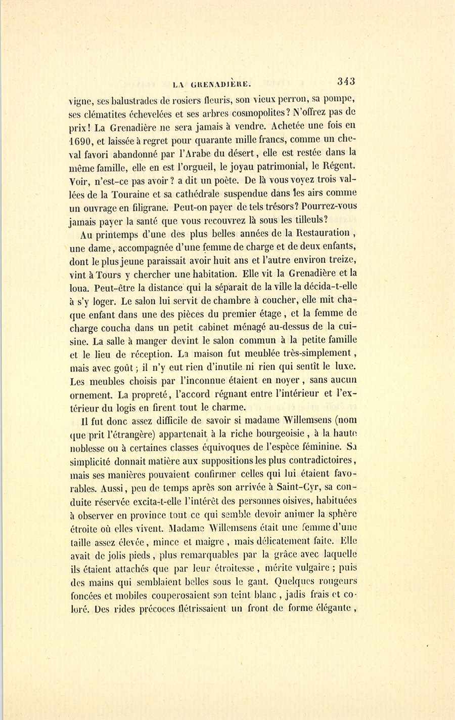 Au printemps d’une des plus belles années de la Restauration, une dame, accompagnée d’une femme de charge et de deux enfants, dont le plus jeune paraissait avoir huit ans et l’autre environ treize, vint à Tours y chercher une habitation. Elle vit la Grenadière et la loua. Peut-être la distance qui la séparait de la ville la décida-t-elle à s’y loger. Le salon lui servit de chambre à coucher, elle mit chaque enfant dans une des pièces du premier étage, et la femme de charge coucha dans un petit cabinet ménagé au-dessus de la cuisine. La salle à manger devint le salon commun à la petite famille et le lieu de réception. La maison fut meublée très-simplement, mais avec goût ; il n’y eut rien d’inutile ni rien qui sentît le luxe. Les meubles choisis par l’inconnue étaient en noyer, sans aucun ornement. La propreté, l’accord régnant entre l’intérieur et l’extérieur du logis en firent tout le charme.