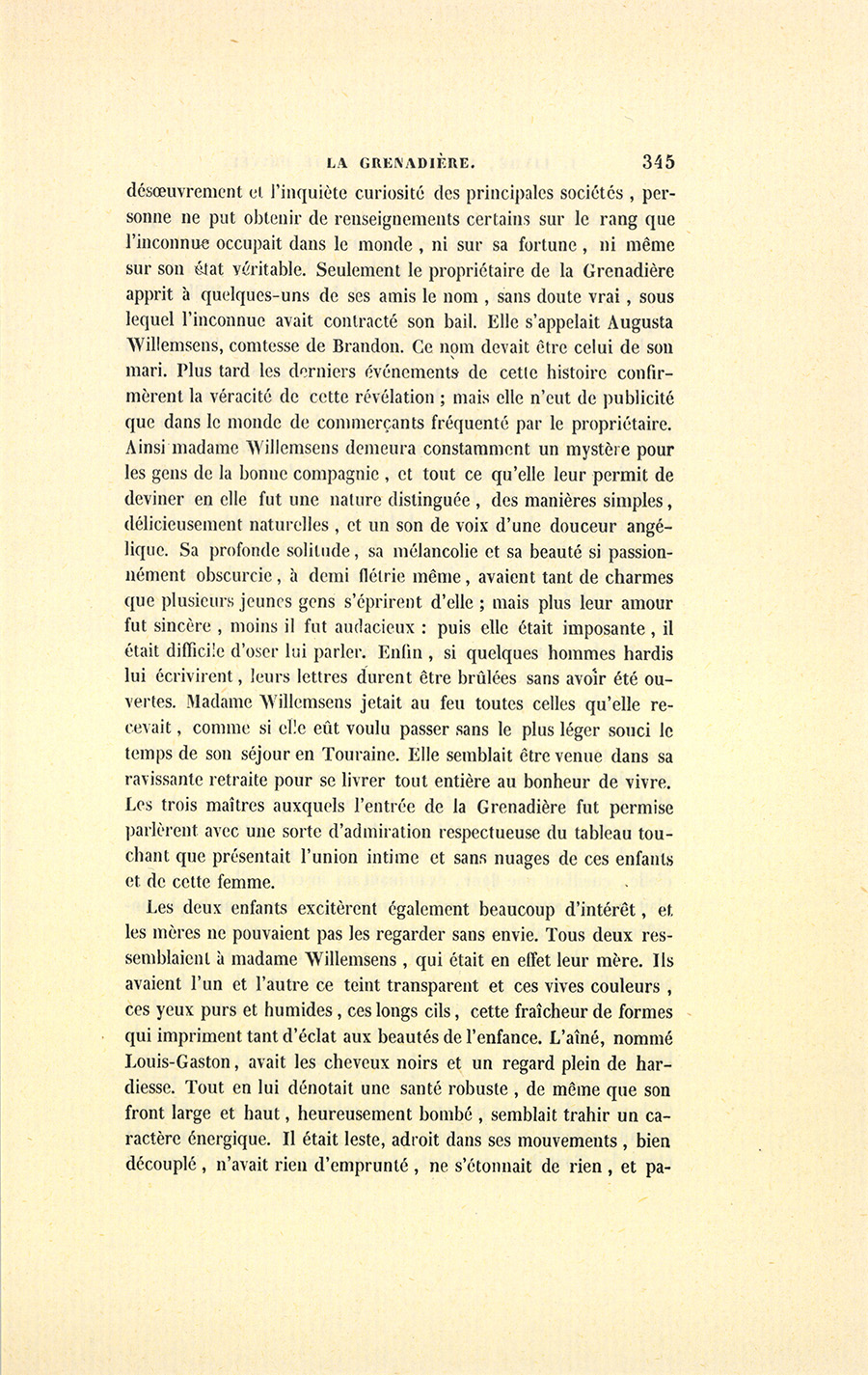 Il fut donc assez difficile de savoir si madame Willemsens (nom que prit l’étrangère) appartenait à la riche bourgeoisie, à la haute noblesse ou à certaines classes équivoques de l’espèce féminine. Sa simplicité donnait matière aux suppositions les plus contradictoires, mais ses manières pouvaient confirmer celles qui lui étaient favorables. Aussi, peu de temps après son arrivée à Saint-Cyr, sa conduite réservée excita-t-elle l’intérêt des personnes oisives, habituées à observer en province tout ce qui semble devoir animer la sphère étroite où elles vivent. Madame Willemsens était une femme d’une taille assez élevée, mince et maigre, mais délicatement faite. Elle avait de jolis pieds, plus remarquables par la grâce avec laquelle ils étaient attachés que par leur étroitesse, mérite vulgaire ; puis des mains qui semblaient belles sous le gant. Quelques rougeurs foncées et mobiles couperosaient son teint blanc, jadis frais et coloré. Des rides précoces flétrissaient un front de forme élégante, {p. 344} couronné par de beaux cheveux châtains, bien plantés et toujours tressés en deux nattes circulaires, coiffure de vierge qui seyait à sa physionomie mélancolique. Ses yeux noirs, fortement cernés, creusés, pleins d’une ardeur fiévreuse, affectaient un calme menteur ; et par moments, si elle oubliait l’expression qu’elle s’était imposée, il s’y peignait de secrètes angoisses. Son visage ovale était un peu long ; mais peut-être autrefois le bonheur et la santé lui donnaient-ils de justes proportions. Un faux sourire, empreint d’une tristesse douce, errait habituellement sur ses lèvres pâles ; néanmoins sa bouche s’animait et son sourire exprimait les délices du sentiment maternel quand les deux enfants, par lesquels elle était toujours accompagnée, la regardaient ou lui faisaient une de ces questions intarissables et oiseuses, qui toutes ont un sens pour une mère. Sa démarche était lente et noble. Elle conserva la même mise avec une constance qui annonçait l’intention formelle de ne plus s’occuper de sa toilette et d’oublier le monde, par qui elle voulait sans doute être oubliée. Elle avait une robe noire très-longue, serrée par un ruban de moire, et par-dessus, en guise de châle, un fichu de batiste à large ourlet dont les deux bouts étaient négligemment passés dans sa ceinture. Chaussée avec un soin qui dénotait des habitudes d’élégance, elle portait des bas de soie gris qui complétaient la teinte de deuil répandue dans ce costume de convention. Enfin son chapeau, de forme anglaise et invariable, était en étoffe grise et orné d’un voile noir. Elle paraissait être d’une extrême faiblesse et très-souffrante. Sa seule promenade consistait à aller de la Grenadière au pont de Tours, où, quand la soirée était calme, elle venait avec les deux enfants respirer l’air frais de la Loire et admirer les effets produits par le soleil couchant dans ce paysage aussi vaste que l’est celui de la baie de Naples ou du lac de Genève. Durant le temps de son séjour à la Grenadière, elle ne se rendit que deux fois à Tours : ce fut d’abord pour prier le principal du collége de lui indiquer les meilleurs maîtres de latin, de mathématiques et de dessin ; puis pour déterminer avec les personnes qui lui furent désignées soit le prix de leurs leçons, soit les heures auxquelles ces leçons pourraient être données aux enfants. Mais il lui suffisait de se montrer une ou deux fois par semaine, le soir, sur le pont, pour exciter l’intérêt de presque tous les habitants de la ville, qui s’y promènent habituellement. Cependant, malgré l’espèce d’espionnage innocent que créent en province le {p. 345} désœuvrement et l’inquiète curiosité des principales sociétés, personne ne put obtenir de renseignements certains sur le rang que l’inconnue occupait dans le monde, ni sur sa fortune, ni même sur son état véritable. Seulement le propriétaire de la Grenadière apprit à quelques-uns de ses amis le nom, sans doute vrai, sous lequel l’inconnue avait contracté son bail. Elle s’appelait Augusta Willemsens, comtesse de Brandon. Ce nom devait être celui de son mari. Plus tard les derniers événements de cette histoire confirmèrent la véracité de cette révélation ; mais elle n’eut de publicité que dans le monde de commerçants fréquenté par le propriétaire. Ainsi madame Willemsens demeura constamment un mystère pour les gens de la bonne compagnie, et tout ce qu’elle leur permit de deviner en elle fut une nature distinguée, des manières simples, délicieusement naturelles, et un son de voix d’une douceur angélique. Sa profonde solitude, sa mélancolie et sa beauté si passionnément obscurcie, à demi flétrie même, avaient tant de charmes que plusieurs jeunes gens s’éprirent d’elle ; mais plus leur amour fut sincère, moins il fut audacieux : puis elle était imposante, il était difficile d’oser lui parler. Enfin, si quelques hommes hardis lui écrivirent, leurs lettres durent être brûlées sans avoir été ouvertes. Madame Willemsens jetait au feu toutes celles qu’elle recevait, comme si elle eût voulu passer sans le plus léger souci le temps de son séjour en Touraine. Elle semblait être venue dans sa ravissante retraite pour se livrer tout entière au bonheur de vivre. Les trois maîtres auxquels l’entrée de la Grenadière fut permise parlèrent avec une sorte d’admiration respectueuse du tableau touchant que présentait l’union intime et sans nuages de ces enfants et de cette femme.